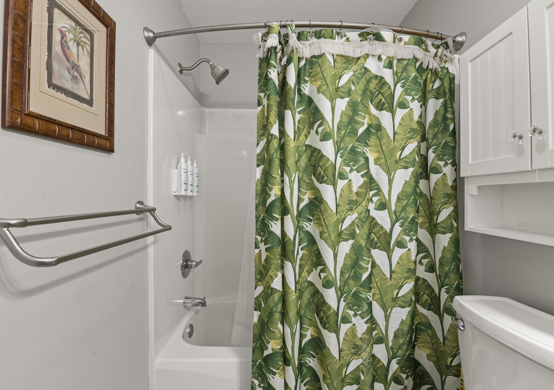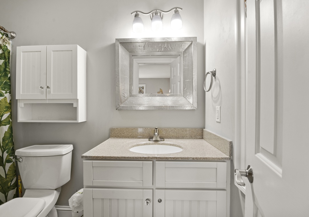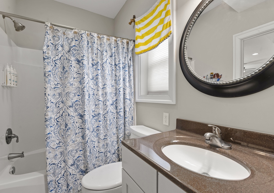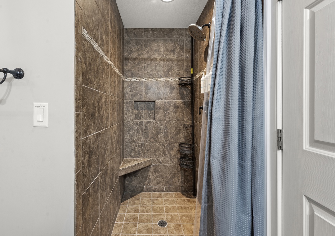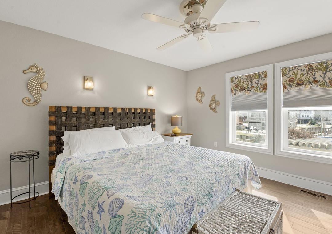 The middle level of the home hosts three bedrooms, each one with an en suite full bathroom and a smart TV with cable. This floor also grants guests access to a covered deck with plenty of seating, including a porch swing and incredible views of the neighboring homes.