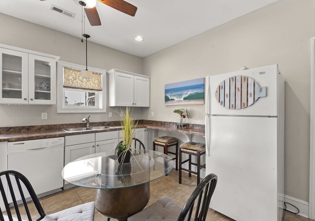Full kitchen on the second floor and kitchenette with a full-size fridge, microwave, and dishwasher on the first level