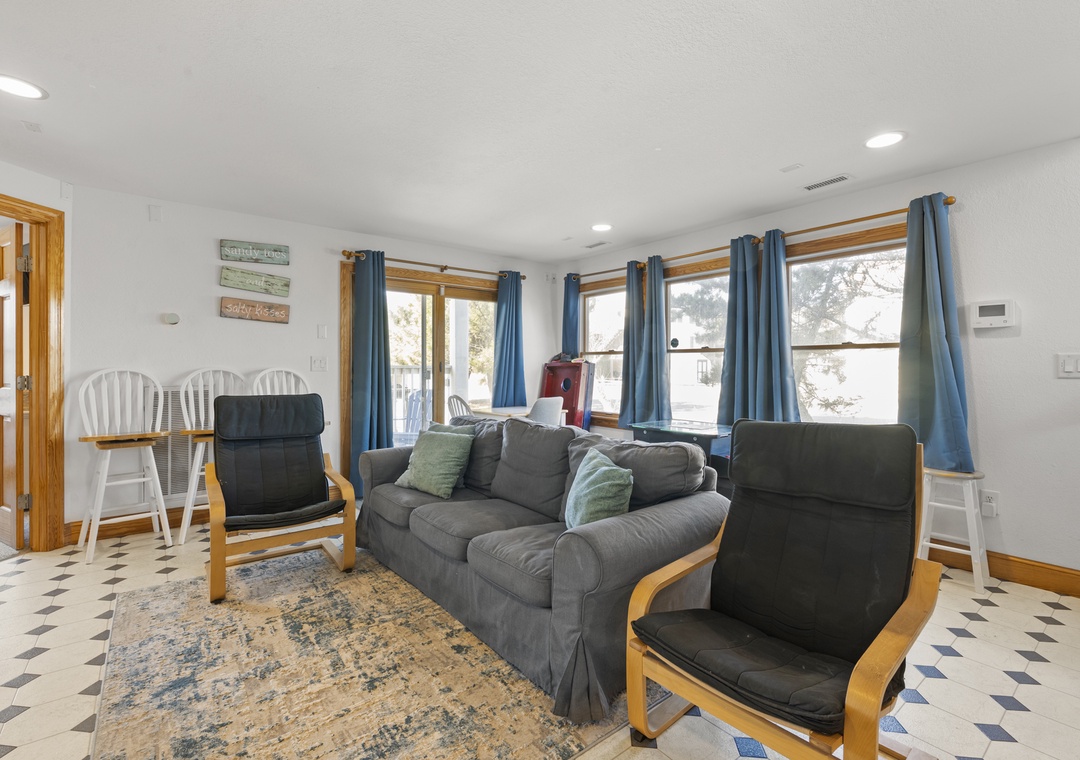 Inside, the open-concept living room, kitchen, and dining room blend together in perfect unison. Fireside movie nights can be enjoyed from the comfort of the oversized sofa, whereas delicious meals will be prepared with ease amongst the full kitchen's blue countertops and updated appliances.