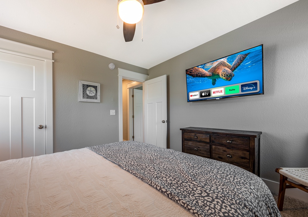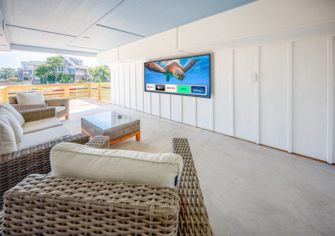 The ground level features a covered outdoor living area, a 50-inch smart TV, a full bath, an outdoor shower, an electric vehicle recharging station, a sun deck, and access to the dock. There is a private boat ramp located in the neighborhood. In the summer months, the sound-front community pool is available and a great place to cool off and take a dip.