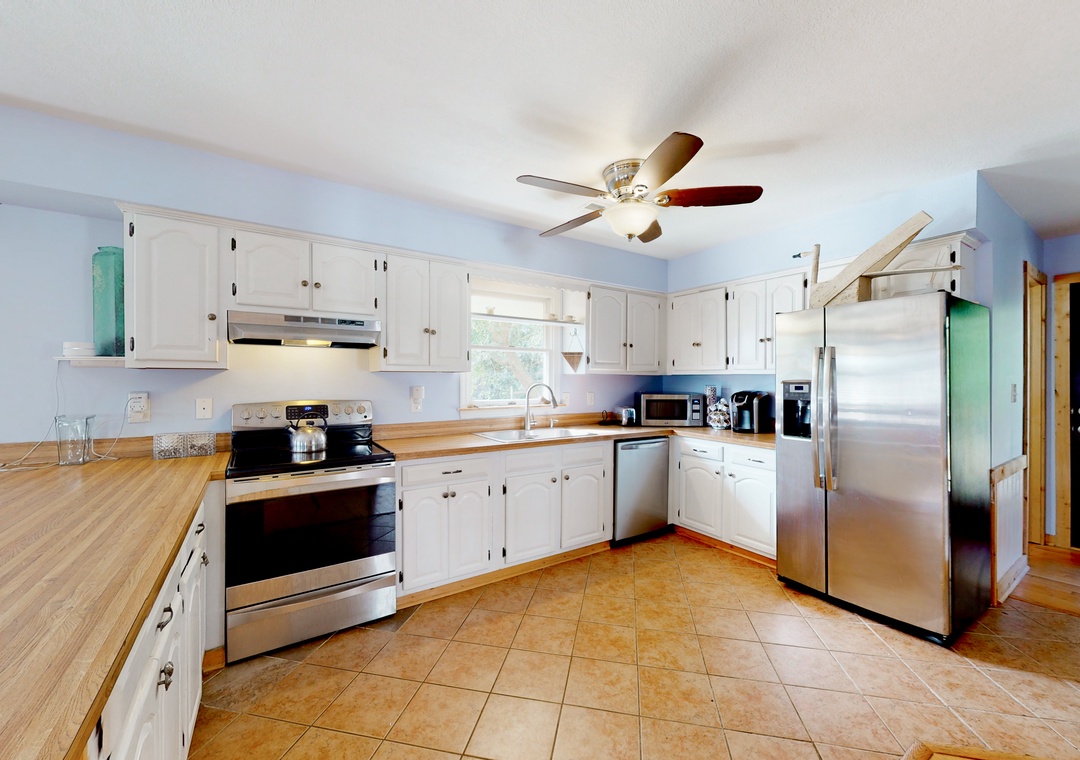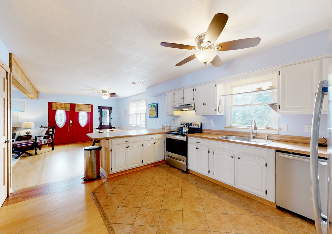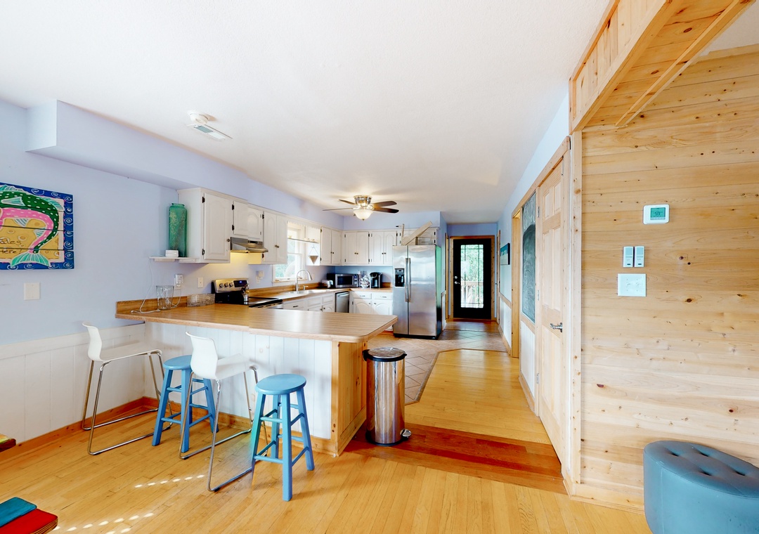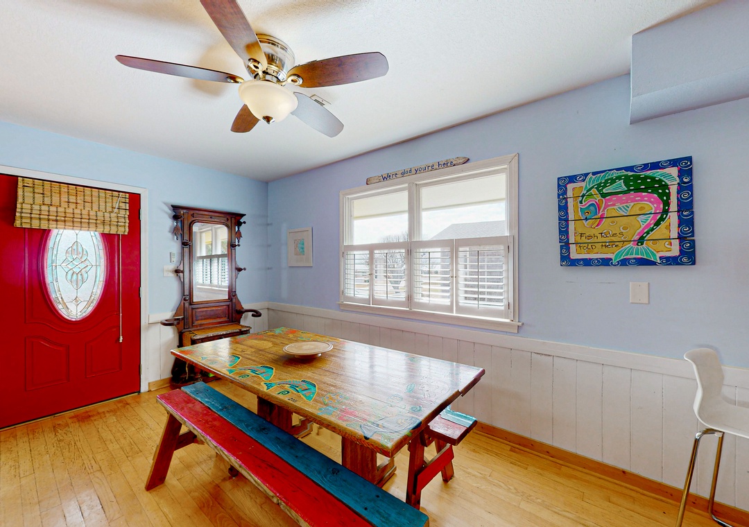 Inside, lounge on the soft sofa while tuning into a movie on the large TV. Or, don your chef's hat and cook up a masterpiece in the full kitchen. With its stainless steel appliances and ample meal prep space - cooking is made easy! Dine family-style at the colorful dining table.