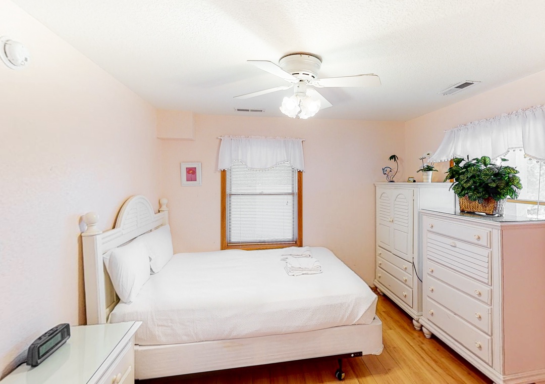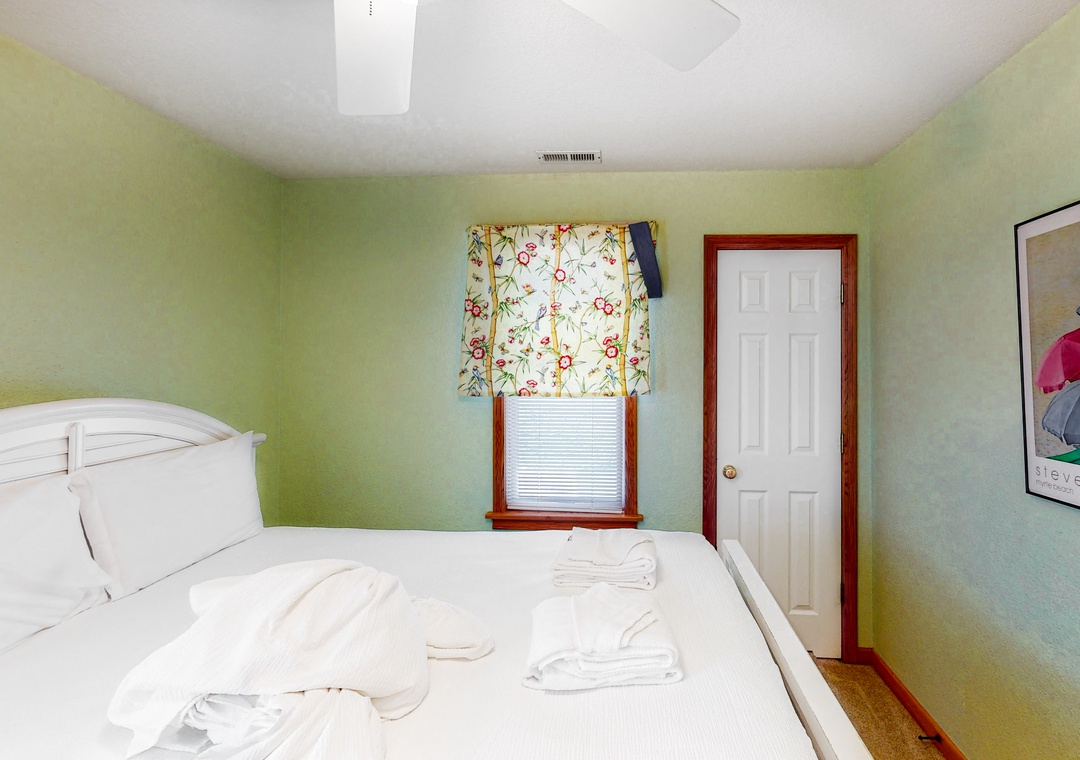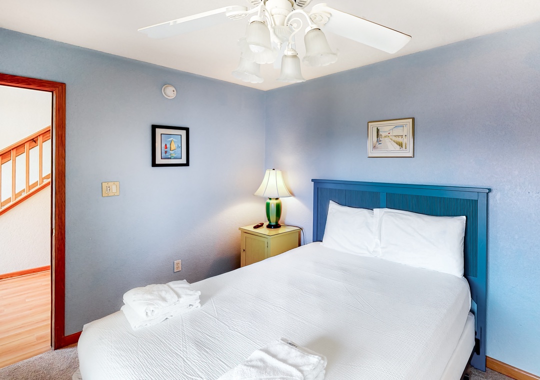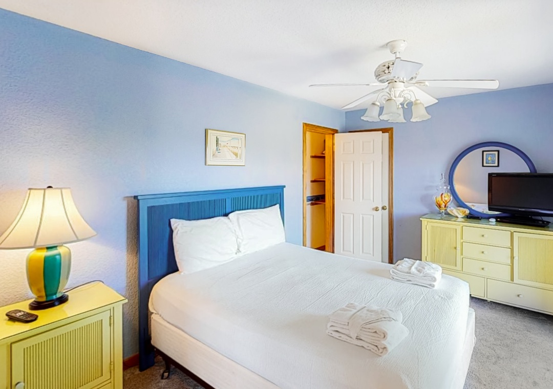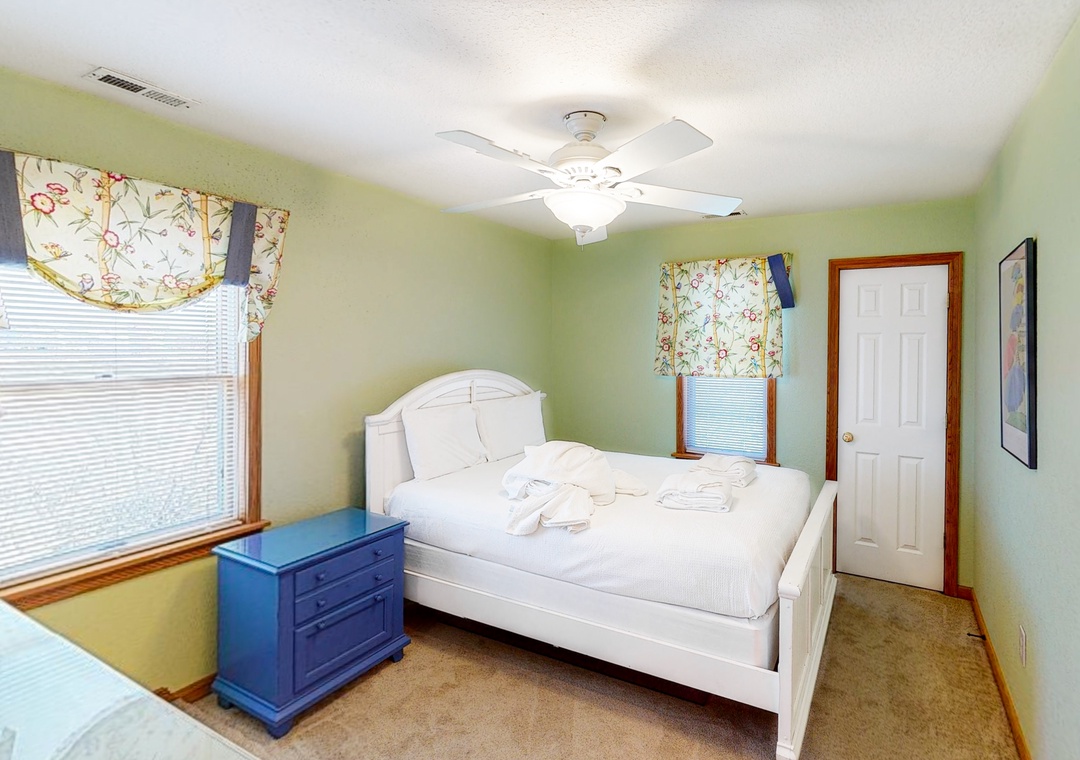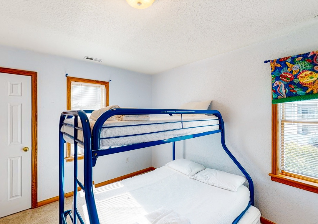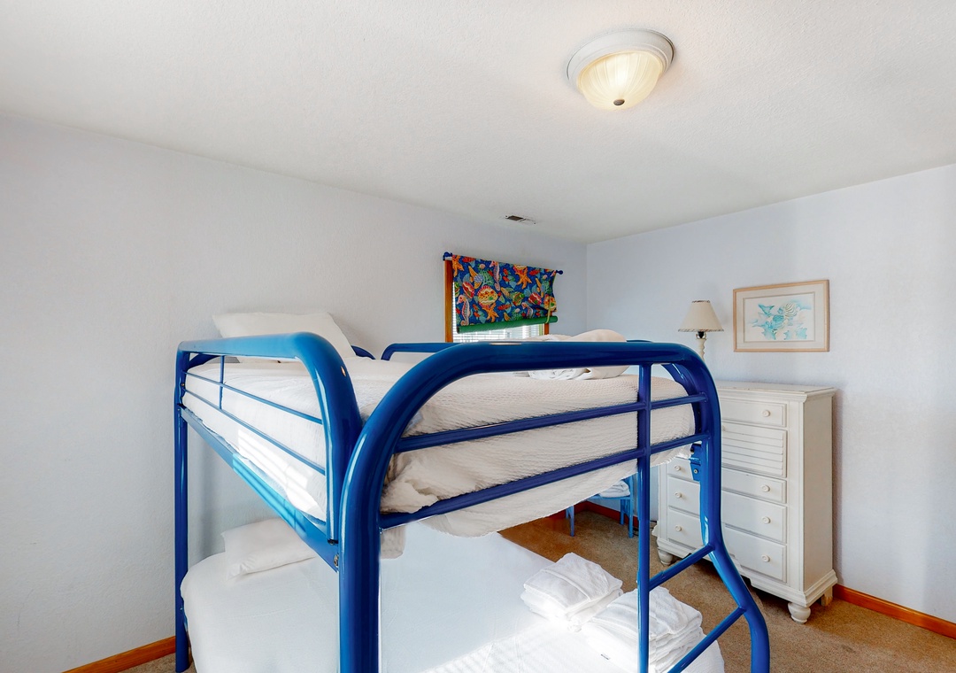Mid Level: Has 2 Queen main bedrooms and a Queen room, all with TVs; a private den with Daybed with Trundle and a 32 in. TV; a room with Duobunk with Trundle, and a full bath.
