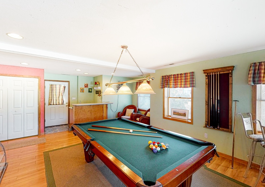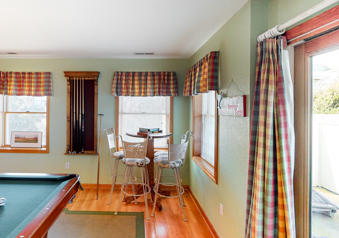 Ground Level: Features a great rec room with 55 in. HDTV,a new pool table, wet bar with under counter wine cooler, full size refrigerator and access to pool deck. A Queen bedroom with TV, and a full bath are on this level.