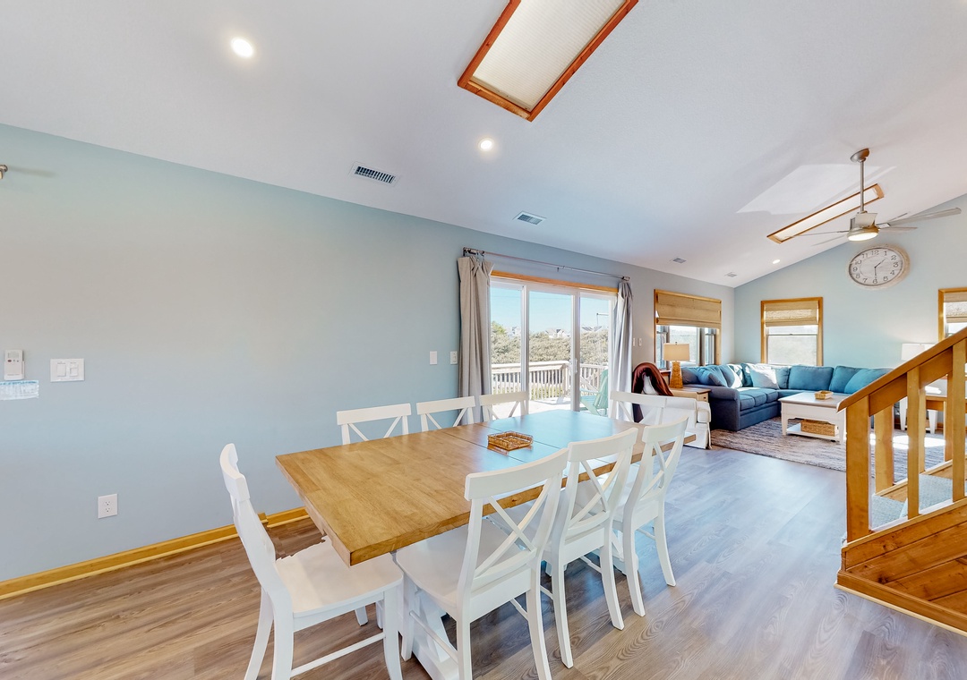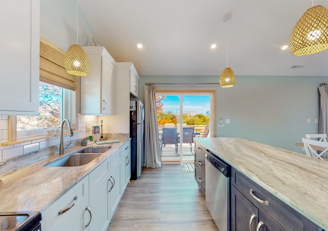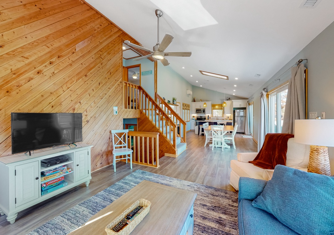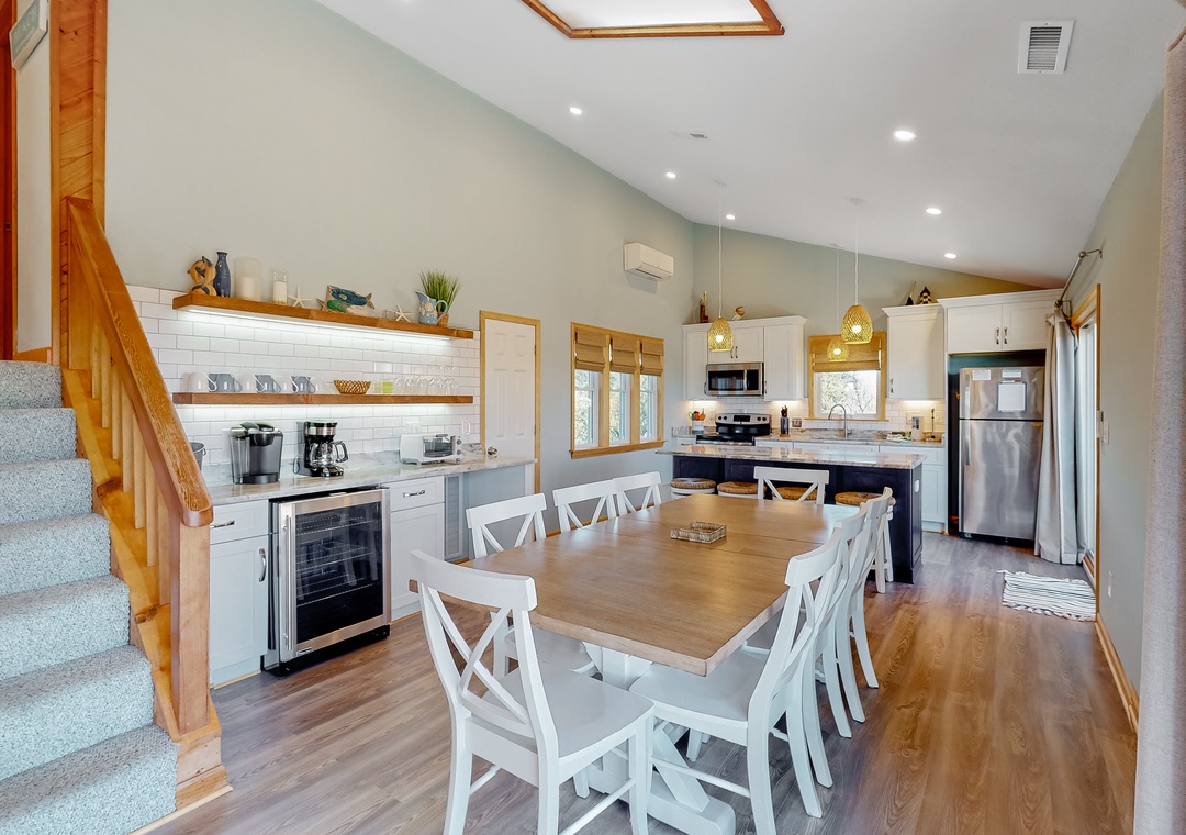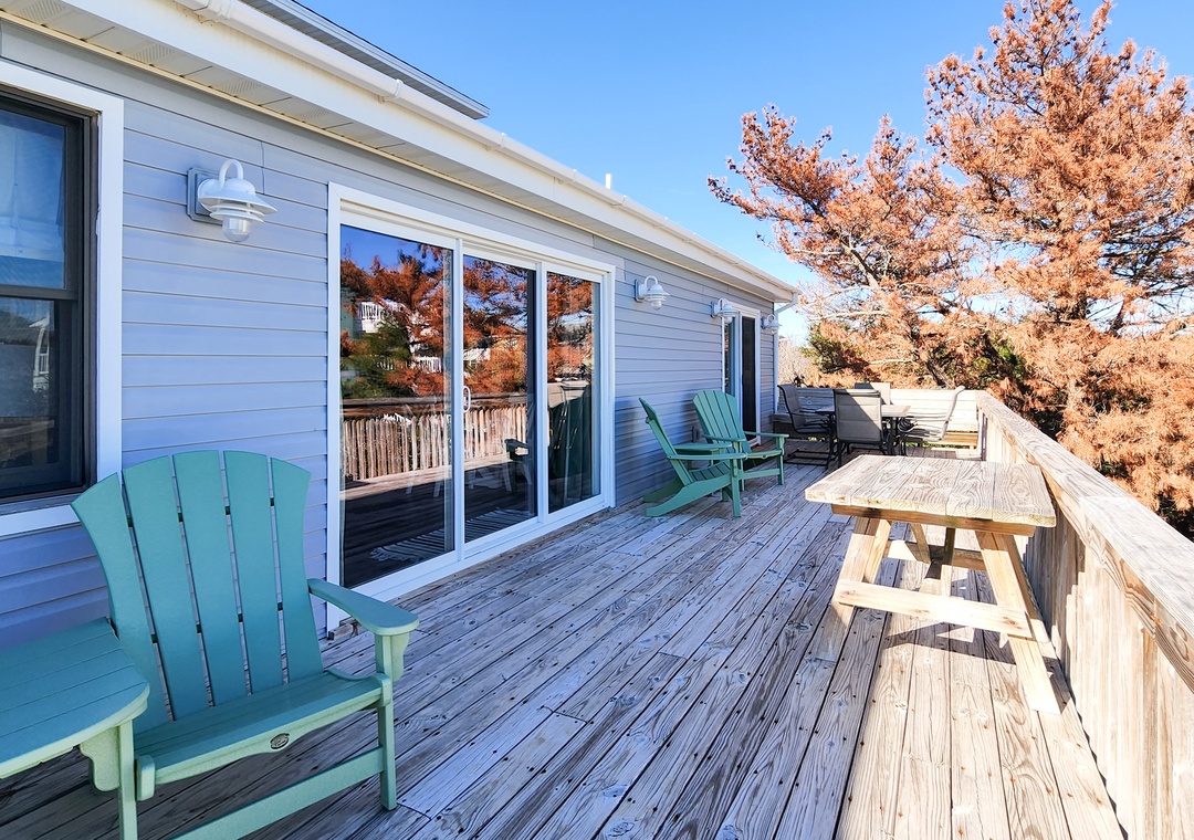 Newly renovated Kitchen (2022) with stainless appliances; Dining Area (seats 10); Large kitchen island. Large deck with Adirondack chairs and dining table; Living Room with large Flat-Screen Cable TV and BluRay player.