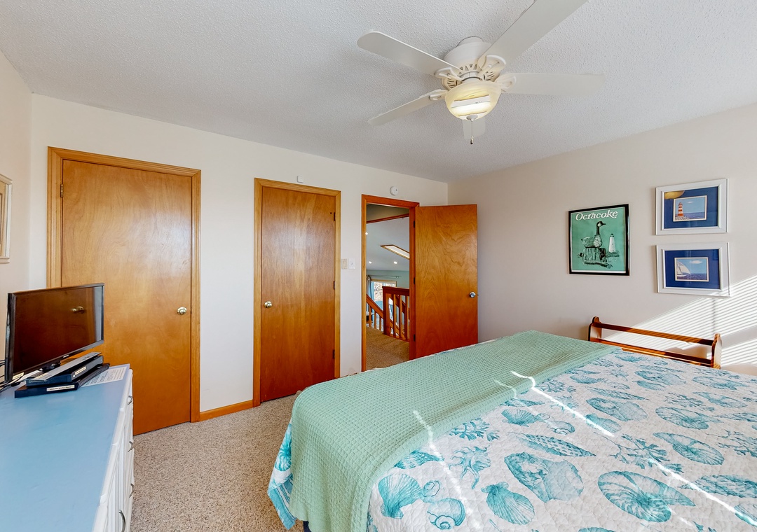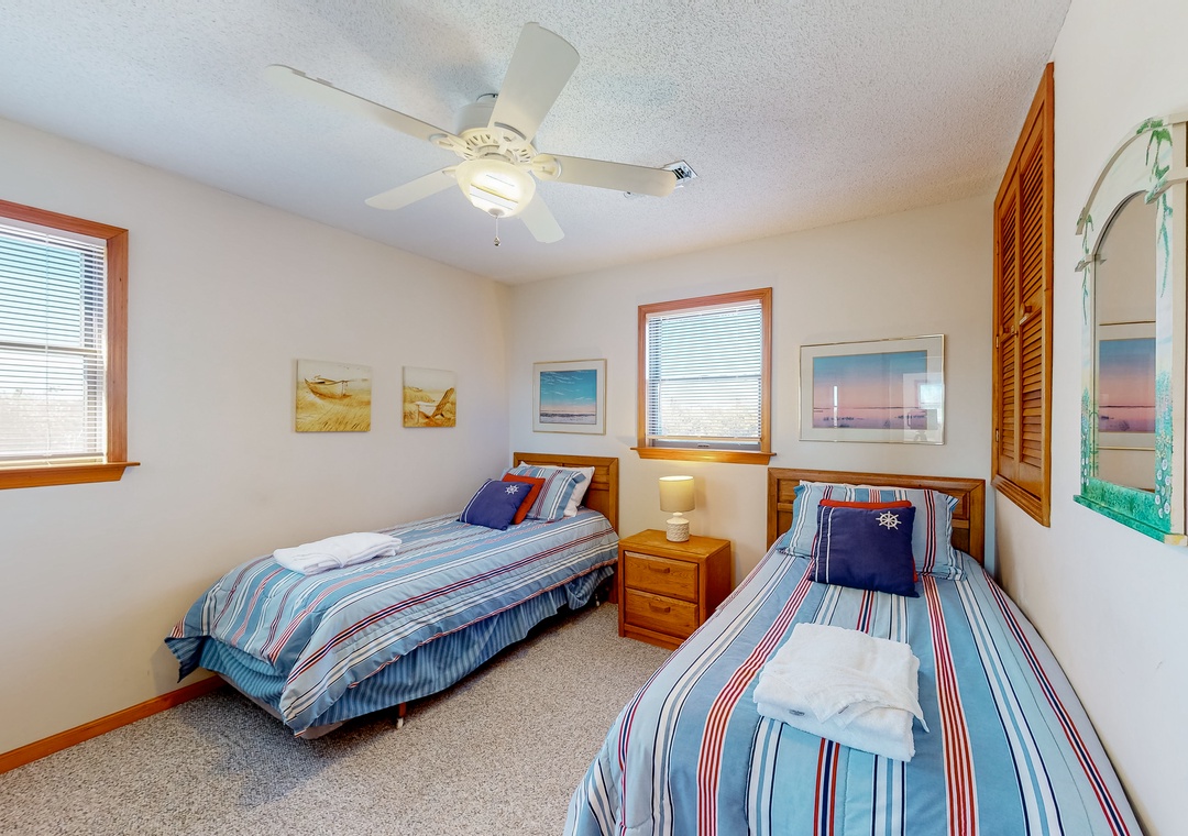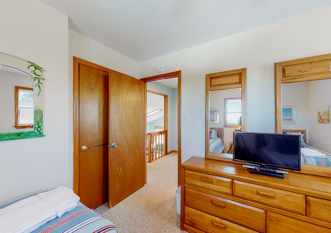 bedroom with Cable TV and Blu-Ray Player. Bedroom with 2 Twins, TV, and Blu-Ray Player. Hall Bathroom.