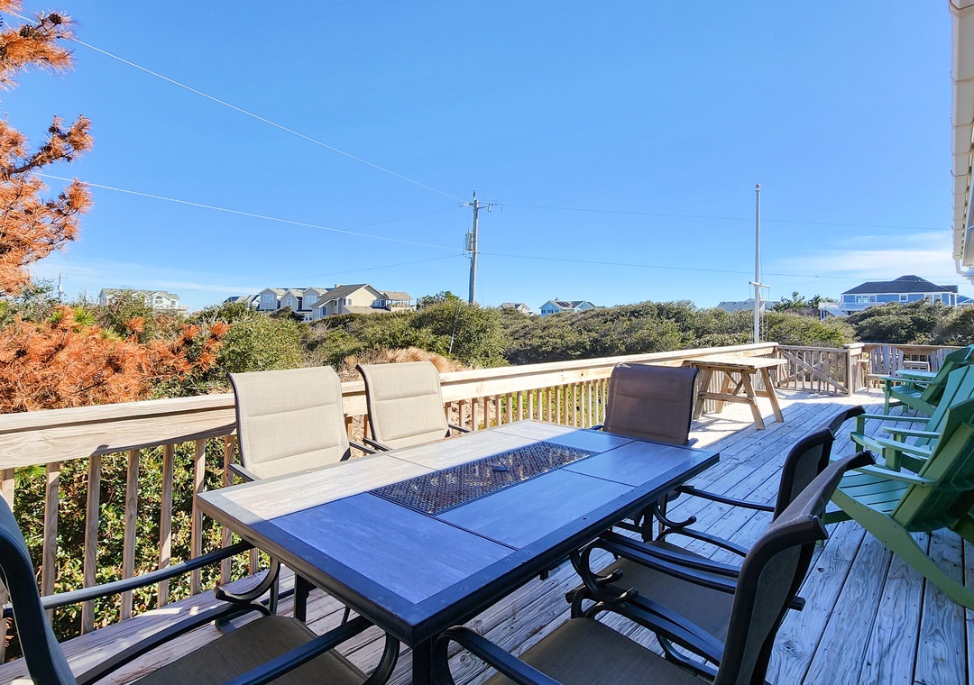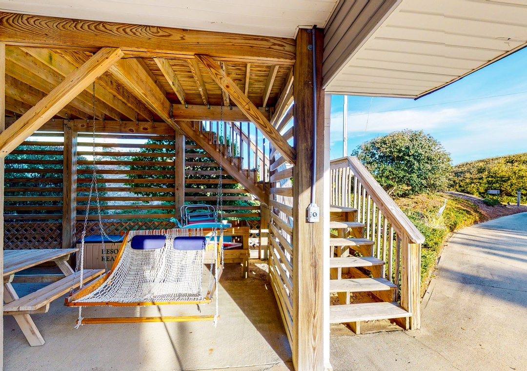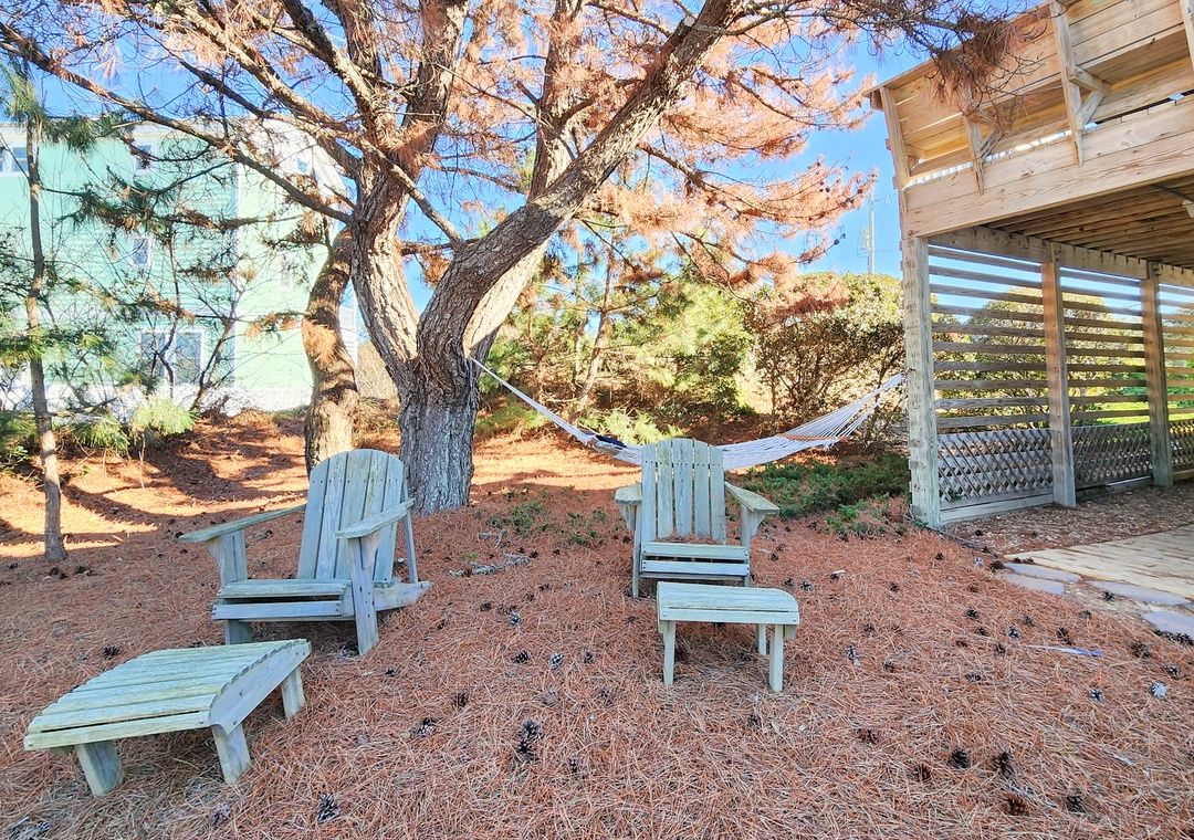 Newly renovated kitchen and main living space (in 2022), this charming home is located on a quiet cul-de-sac street, only a one-minute walk to the ocean, in beautiful Ocean Sands Section C. This neighborhood of large lots and quiet streets is great for kids and families to safely ride their bikes and walk to the ocean. Also, fewer homes make for more space to run and play on the beautiful wide beach. The large, east-facing deck is perfect for enjoying your morning coffee with the sunrise, or an afternoon glass of wine in the shade. Sidewalks on Ocean Trail / Rt. 12 make for safe walking to Harris Teeter, Starbucks, Duck Donuts, and many more nearby shops. The home is well equipped with updated stainless-steel kitchen appliances, two refrigerators, beverage cooler, and a large pantry–everything you need to make memories around the table as well as outdoors. Spend your time relaxing on the beach, splashing in the pool, and soaking up the sun. There is an enclosed outdoor shower and shady spots to hang out under the house with chairs, a hammock, and a rope swing. or, you can head to the backyard and relax in the large private pool after a day at the ocean. Don’t forget to send the kids to climb and swing under the magical oak trees in the backyard. Remember to slow down and enjoy the Simple Life OBX! Distance to Beach Access: Approximately 120 yards.