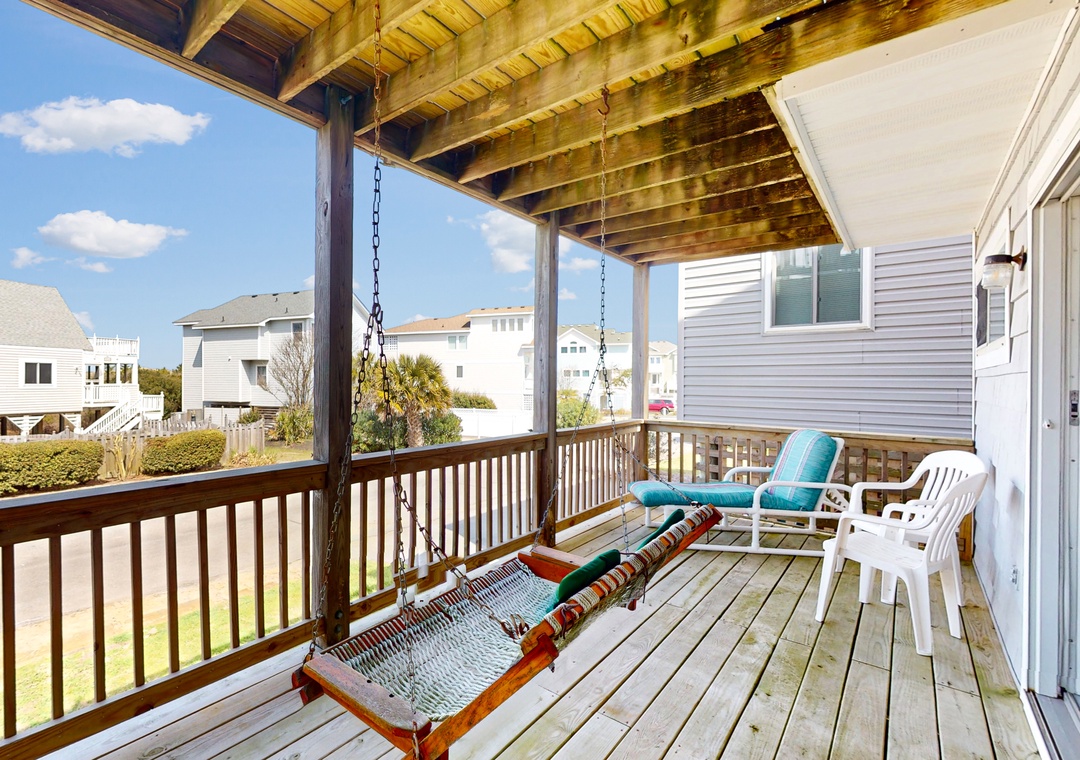 You'll enter the home near the laundry room, with the bedrooms just upstairs. Both upper levels feature balconies, including a private one for the primary bedroom with hammock swing seating. The top deck provides a glimpse of the ocean while you enjoy the fresh ocean breeze. The third story also houses the social hub of your vacation rental, with a bright, well-equipped kitchen (including a toaster oven, coffee maker, and blender) and living space, along with one more bedroom.