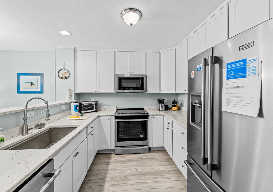 Upon entry, you'll be met with the recently renovated bright interior and a beachy vibe throughout the well-appointed living area. Relax and make yourself at home by resting on the plush furniture, indulging in a favorite movie on the large TV, or serving brunch on the private balcony. Prepare grand meals and beach picnic snacks in the sophisticated kitchen, equipped with stainless steel appliances, ample cupboard room, and a formal dining table. Comfortable beds in spacious bedrooms ensure that everyone will receive a fantastic night's rest from the day's adventures.