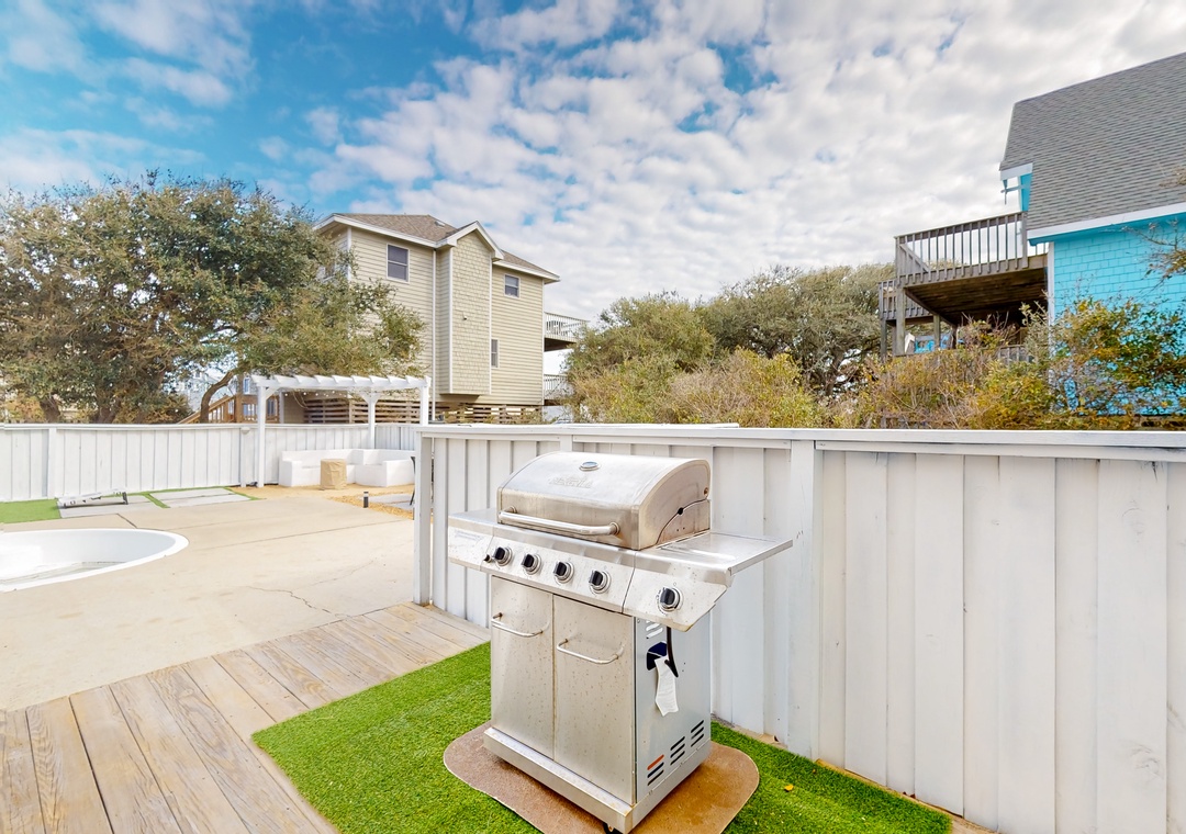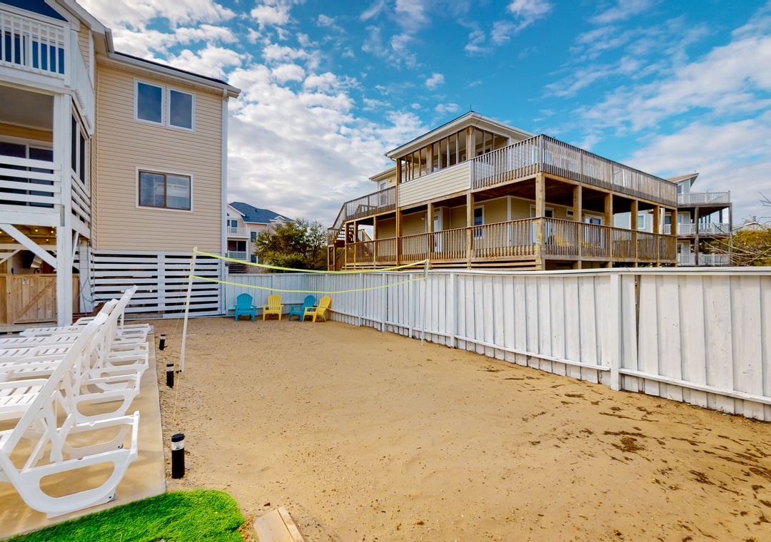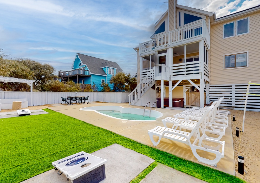 Soak up the sun in this generous backyard complete with a shimmering private pool, multiple lounge spots, and an outdoor grill. Need more activities? Work up a sweat in your own private beach volleyball area or play cornhole on the turf. Relax your muscles in the private hot tub after a long day.