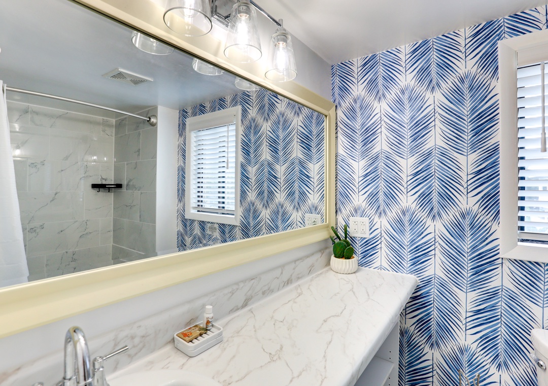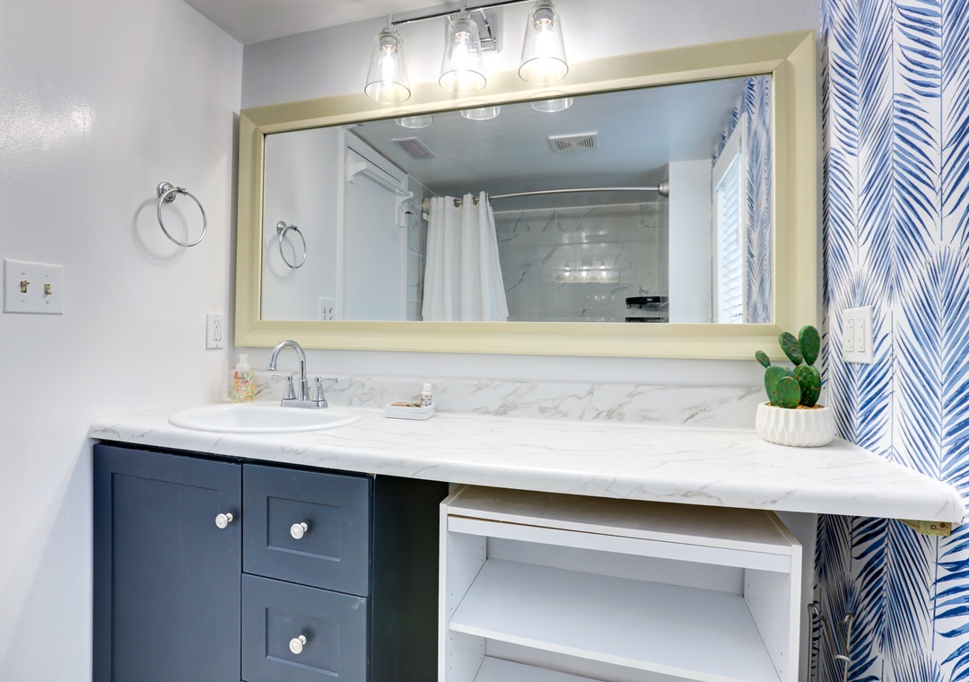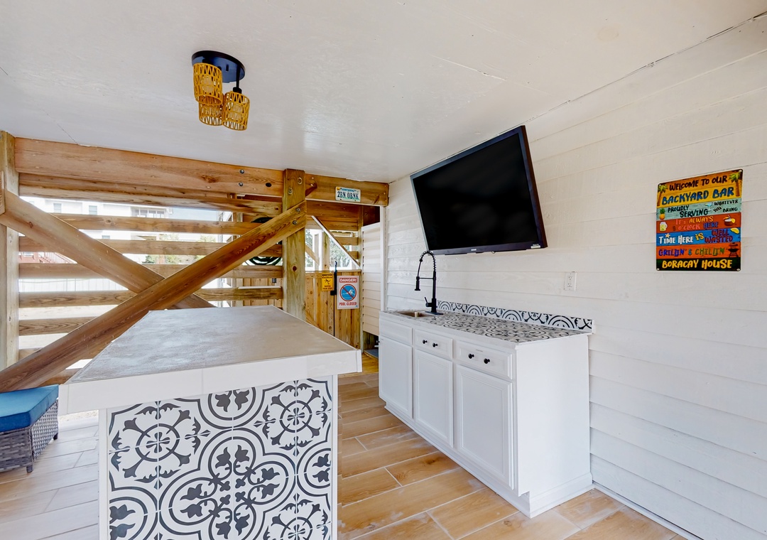 Take a break from the sun and enjoy the breeze in the covered entertainment area/bar complete with an outdoor TV! Your oasis is equipped with an outdoor bathroom and shower for your convenience.