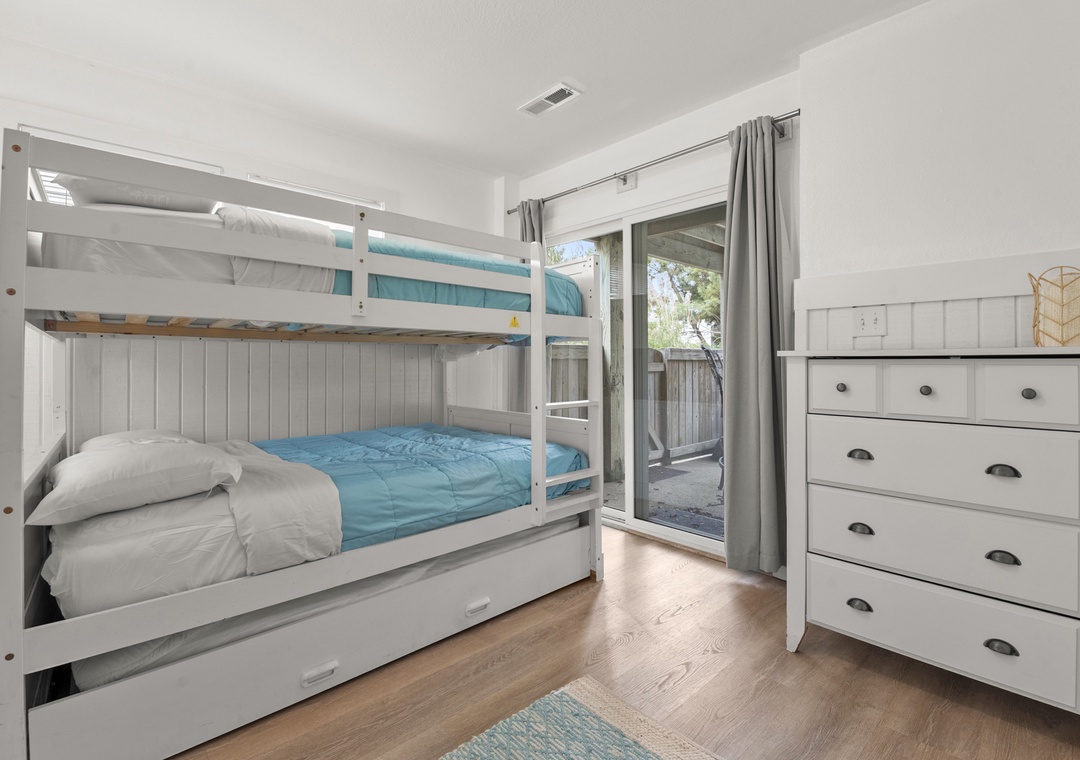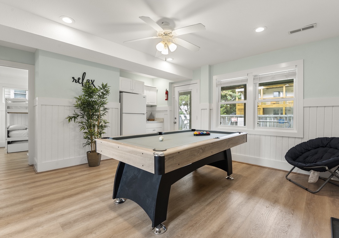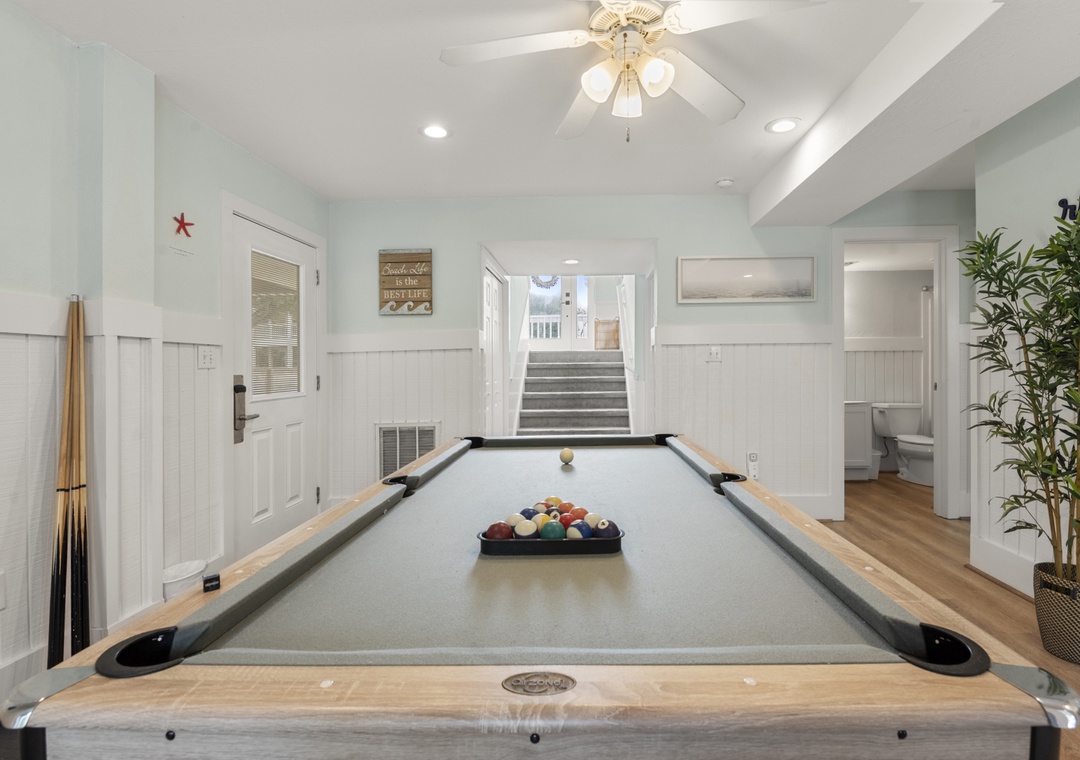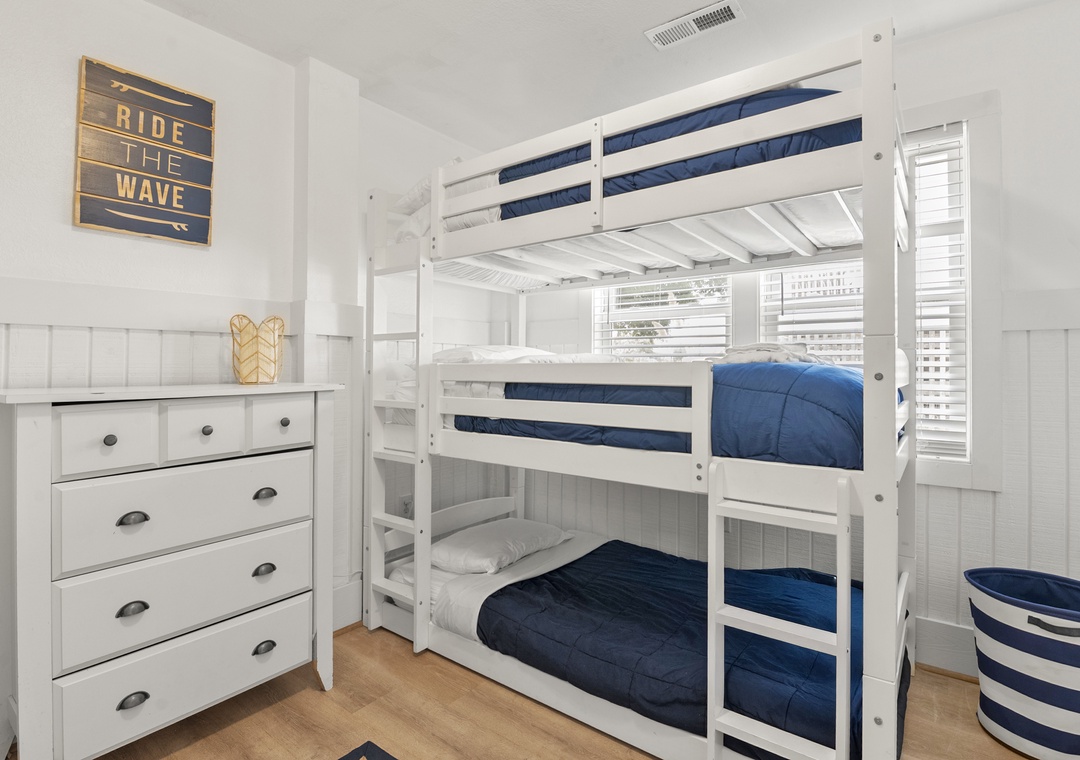 The bedrooms of this home are all spread out, and each has its own personality. The youngest guests in your group will want to head straight to the bunk rooms - one features a fun surfing theme, and the other is mermaid-themed and features a private back deck entrance and lovely particle board detail. The third and fourth bedrooms feature private deck entrances, ceiling fans, TVs, and en suite bathrooms. The sunny fifth bedroom features a five-window layout, ceiling fan, TV, and an en suite bathroom. The sixth and final bedroom features multiple windows, a ceiling fan, a TV, and an en suite bathroom. The ground level includes a bedroom with two sets of three triple twin bunks and the second bedroom has a full bunk bed with a trundle.