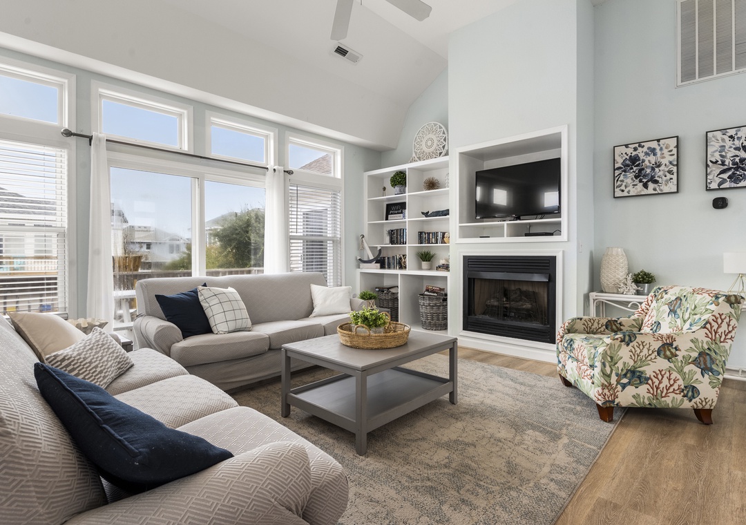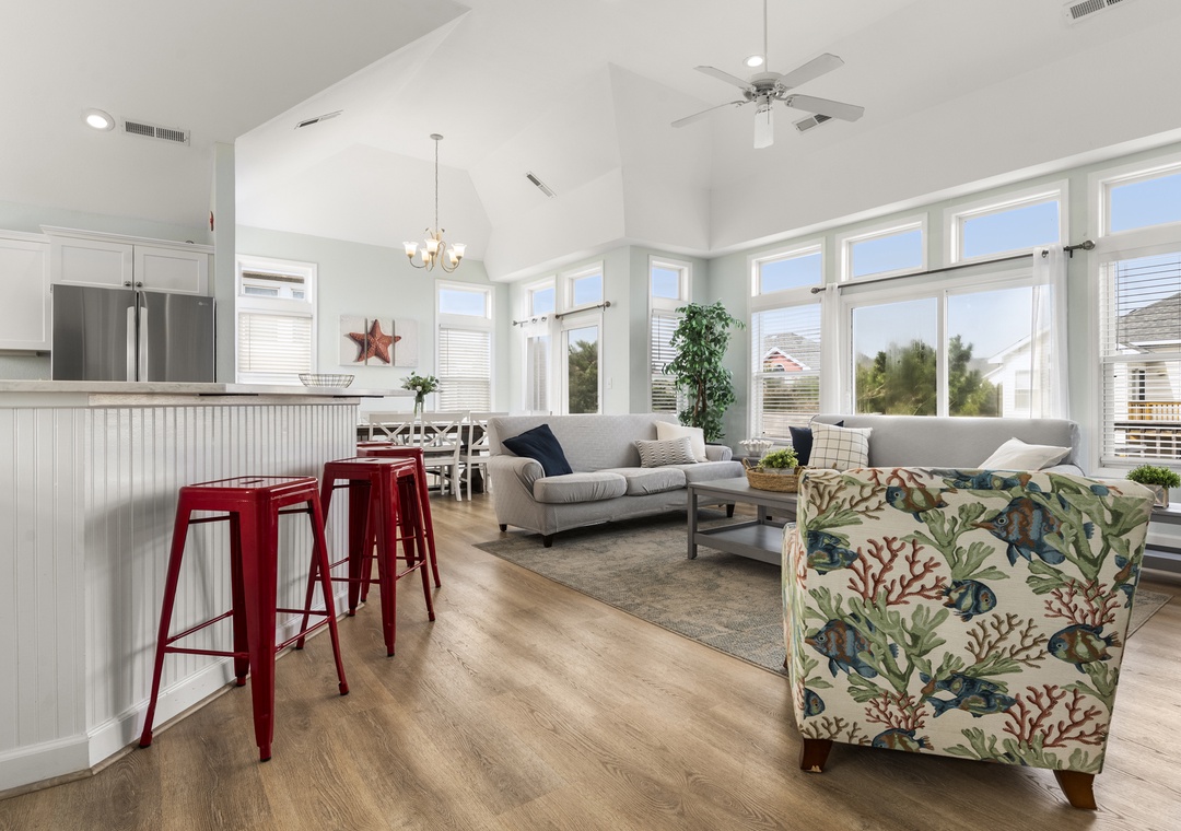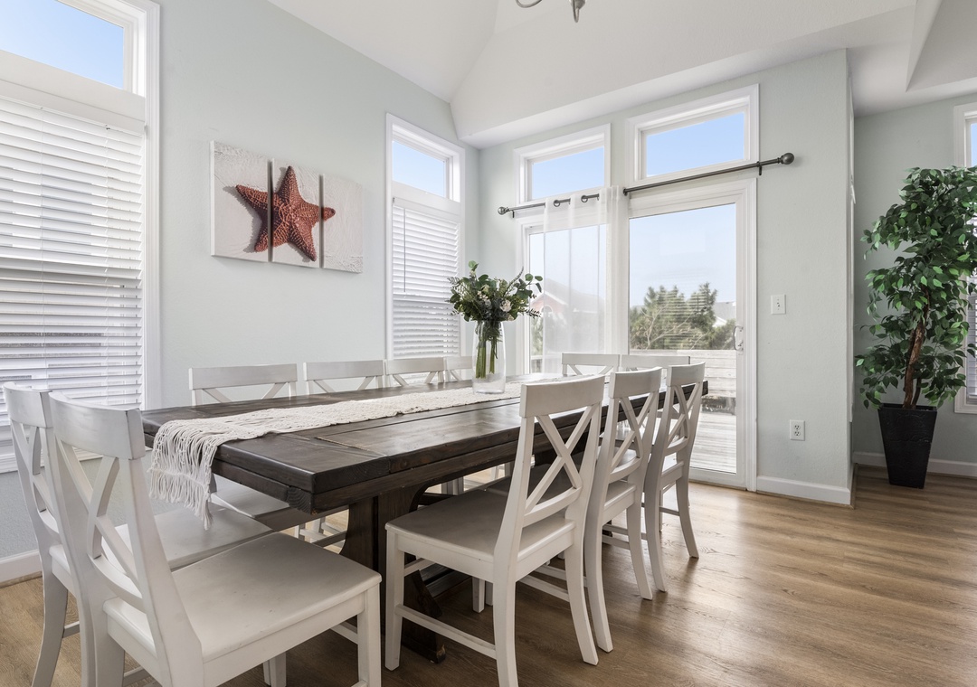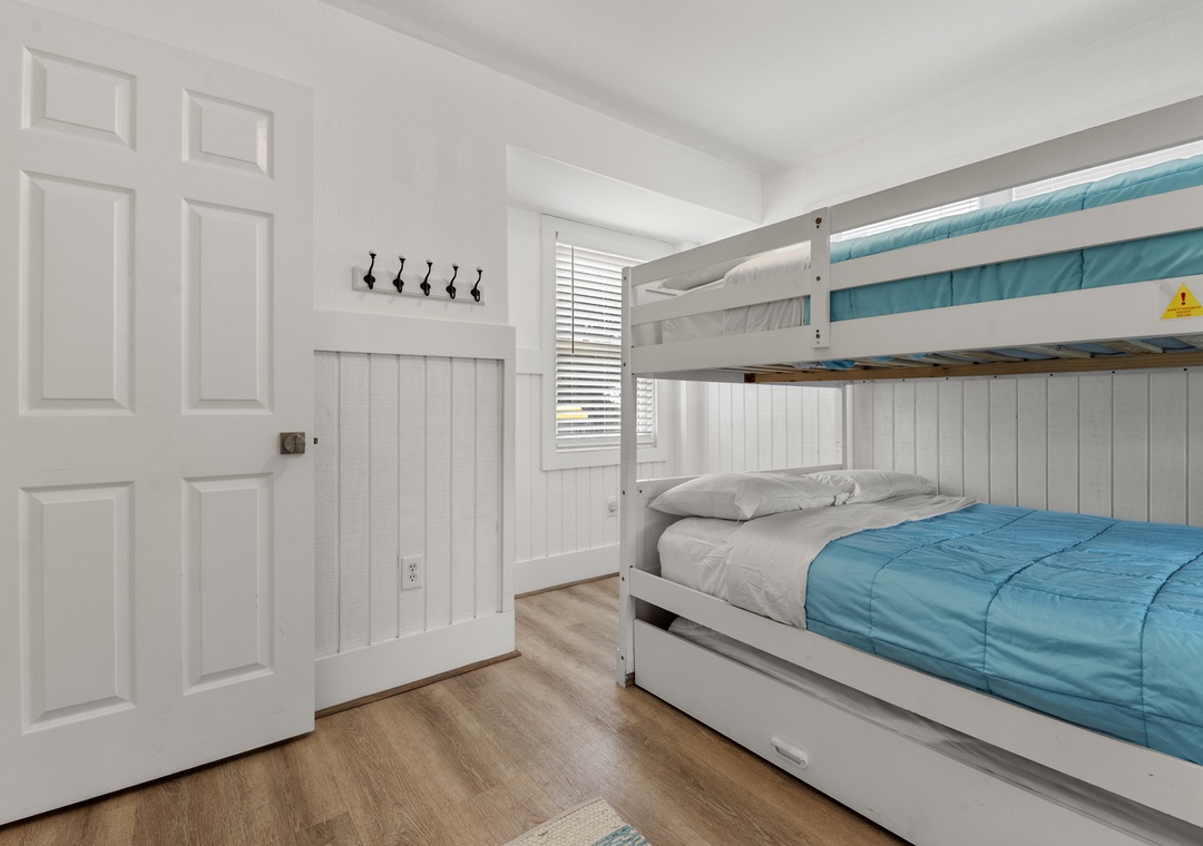 The bedrooms of this home are all spread out, and each has its own personality. The youngest guests in your group will want to head straight to the bunk rooms - one features a fun surfing theme, and the other is mermaid-themed and features a private back deck entrance and lovely particle board detail. The third and fourth bedrooms feature private deck entrances, ceiling fans, TVs, and en suite bathrooms. The sunny fifth bedroom features a five-window layout, ceiling fan, TV, and an en suite bathroom. The sixth and final bedroom features multiple windows, a ceiling fan, a TV, and an en suite bathroom. The ground level includes a bedroom with two sets of three triple twin bunks and the second bedroom has a full bunk bed with a trundle.