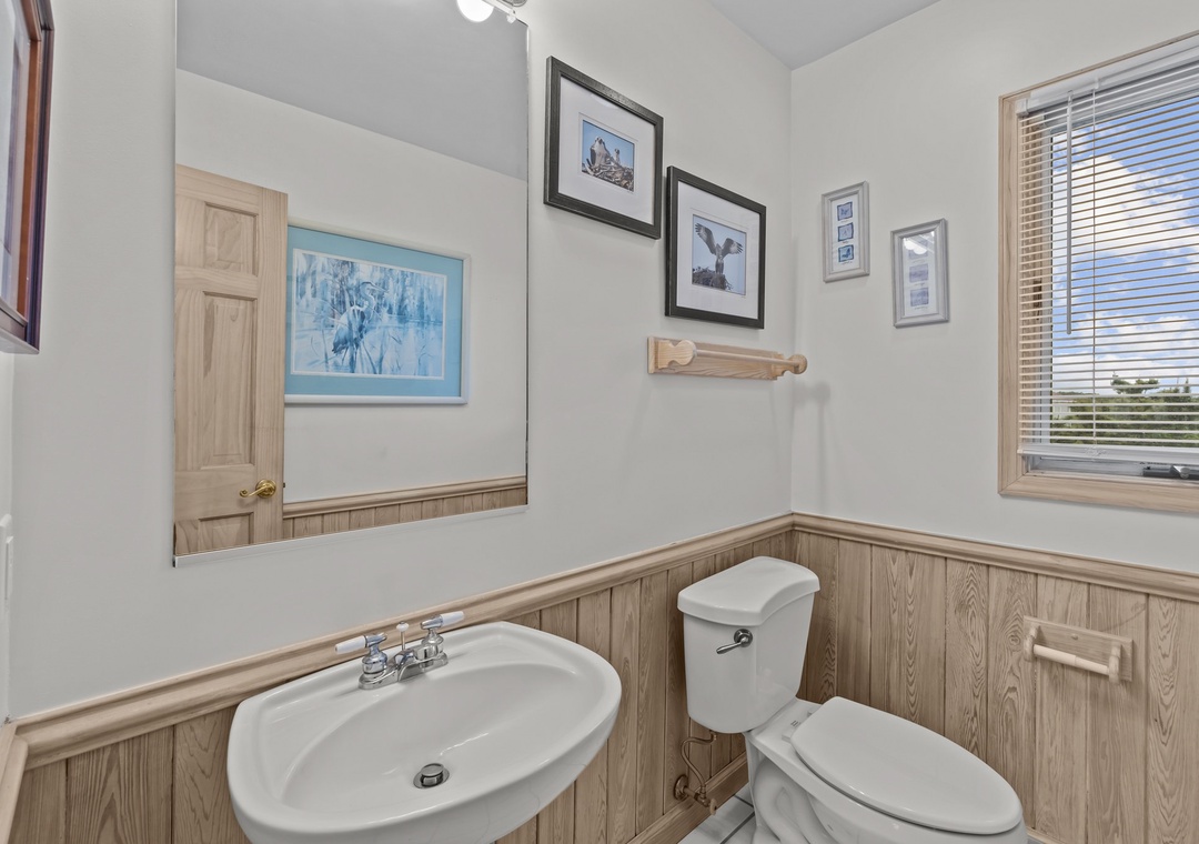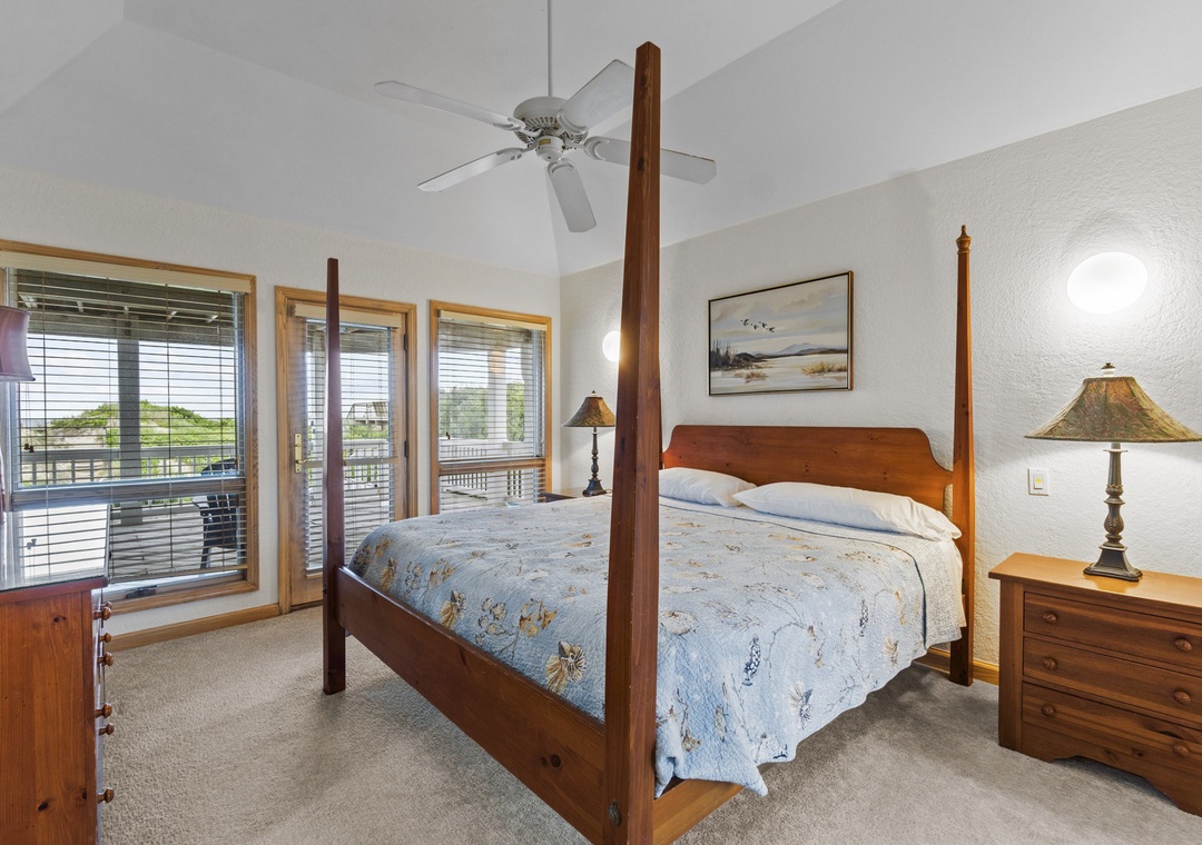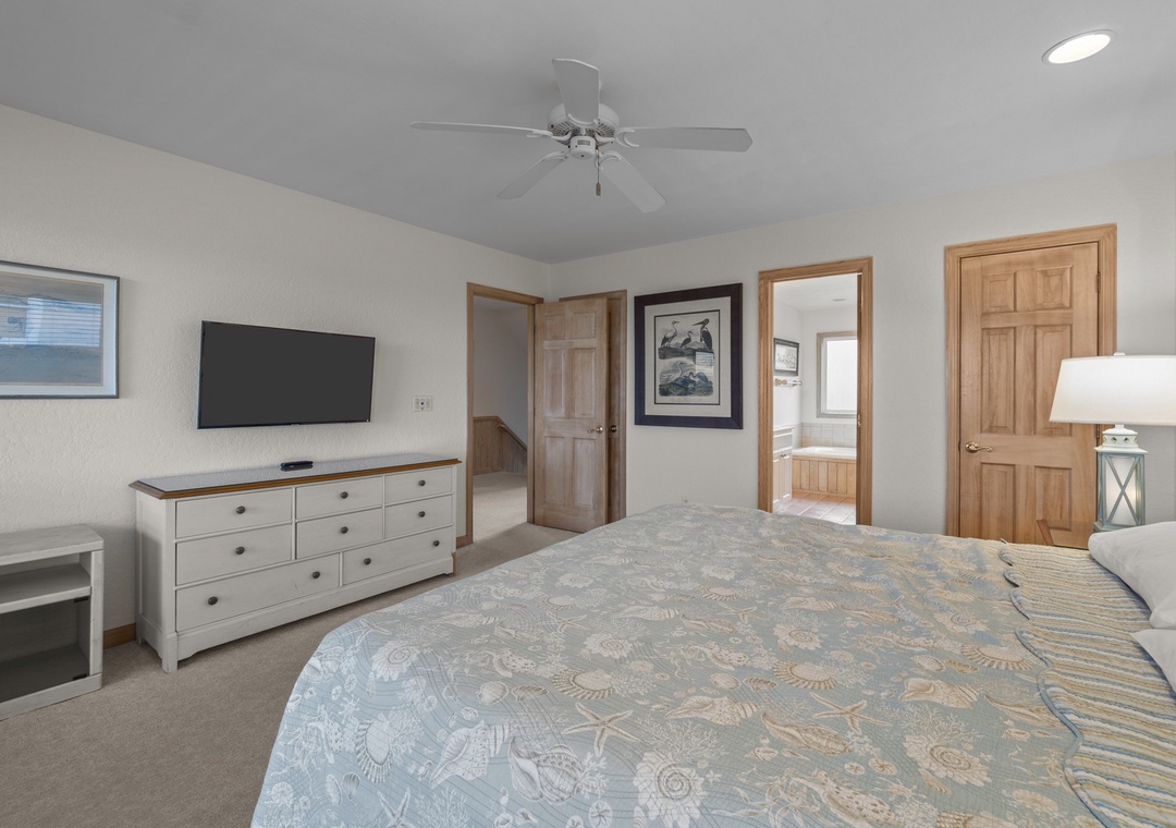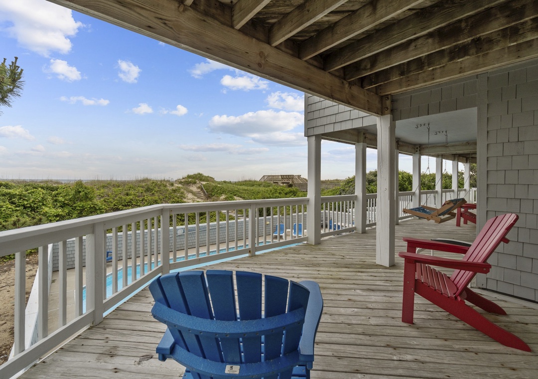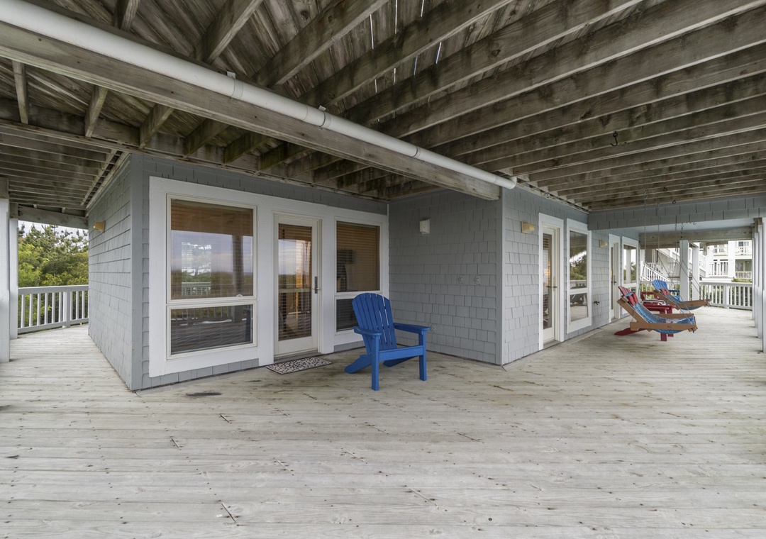 Back inside on the middle level you are met with two luxurious king bedrooms with whirlpool tubs and TVs offer a spa-like retreat. A room with two singles (with trundles) and another with two bunk sets share a bathroom across the hall. The secluded hot tub deck between the ground and mid-level is perfect for stargazing or unwinding after a beach day. Swing your cares away on the middle deck’s double swings while soaking in the ocean breeze.