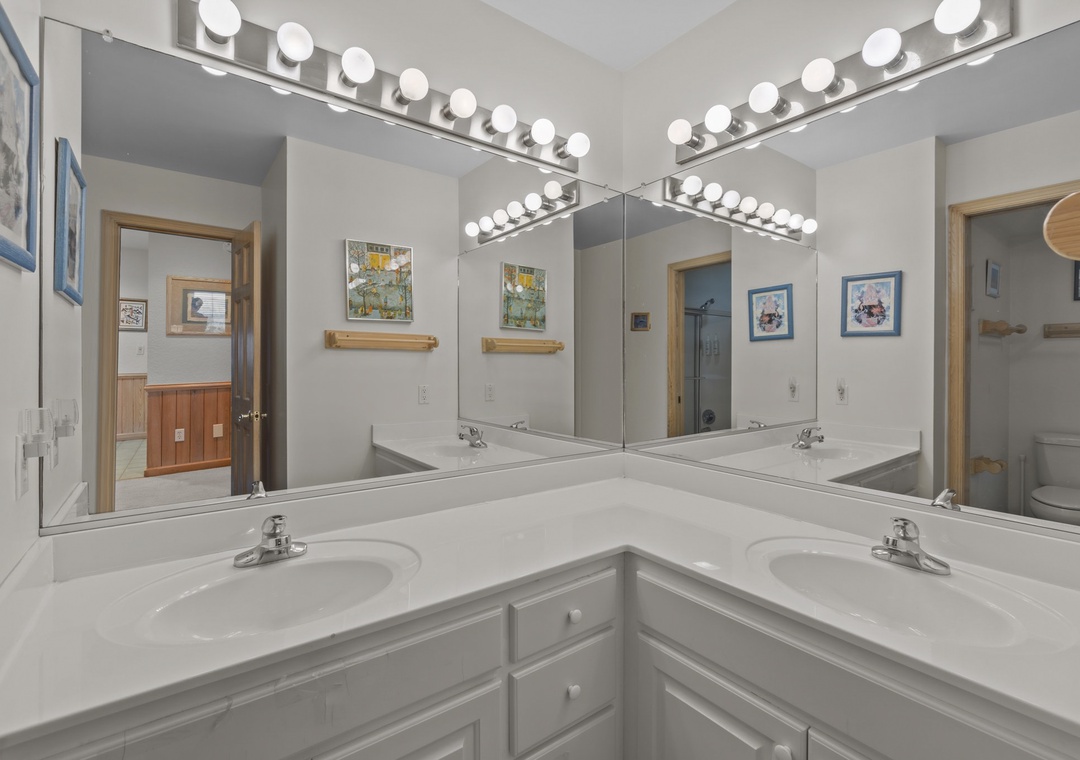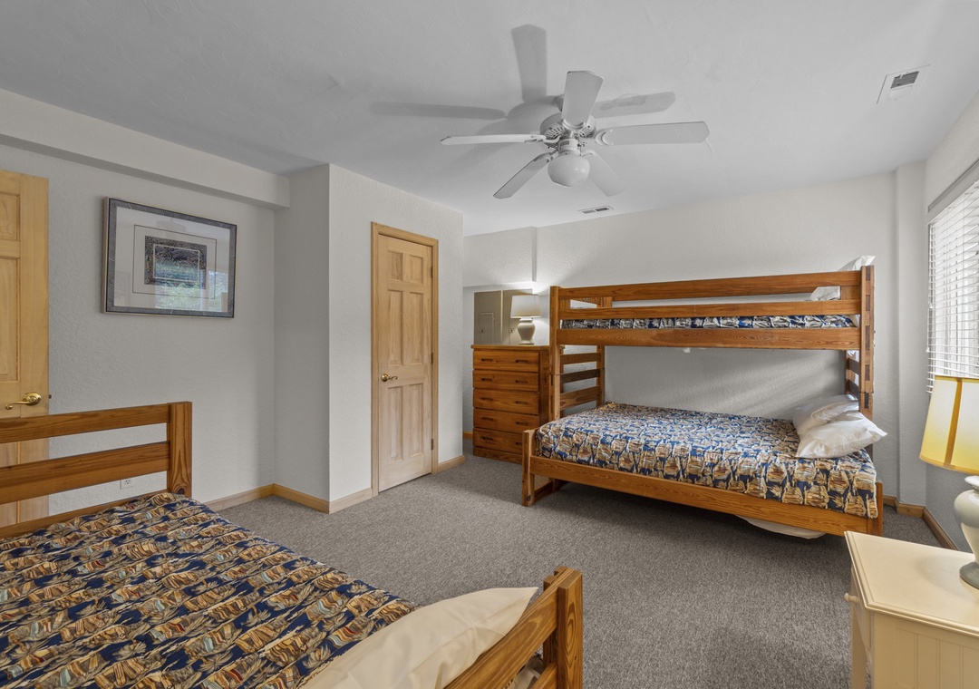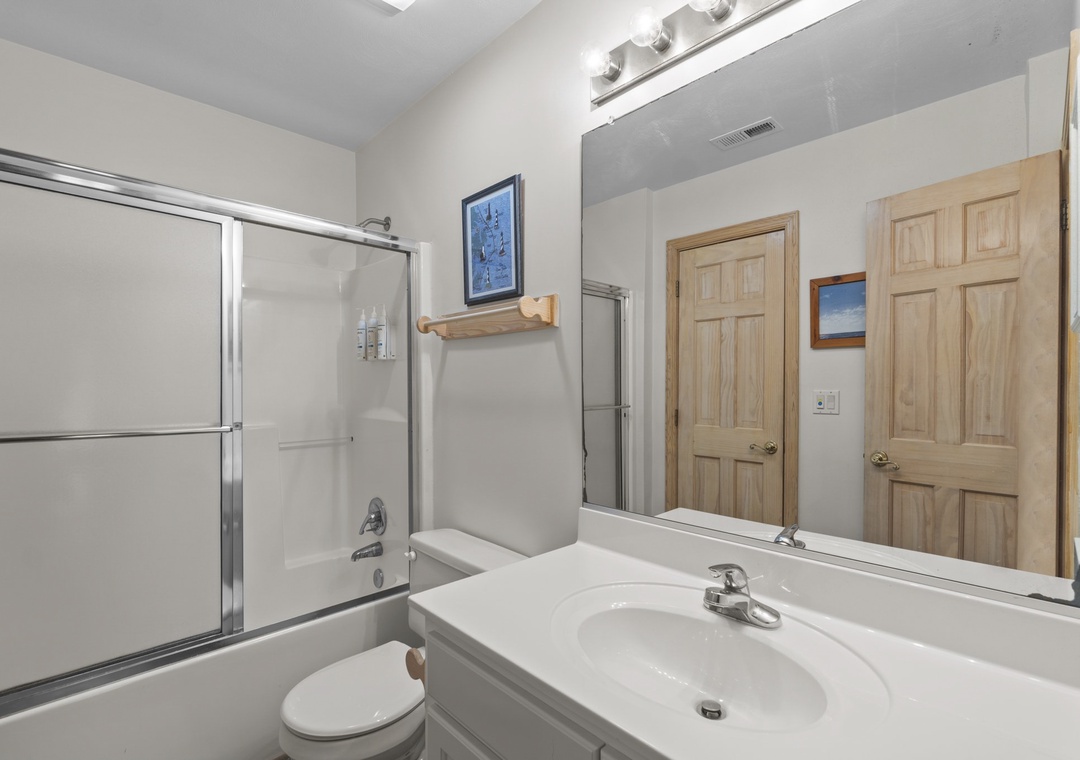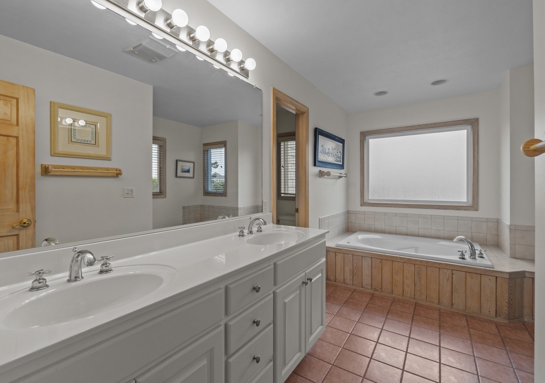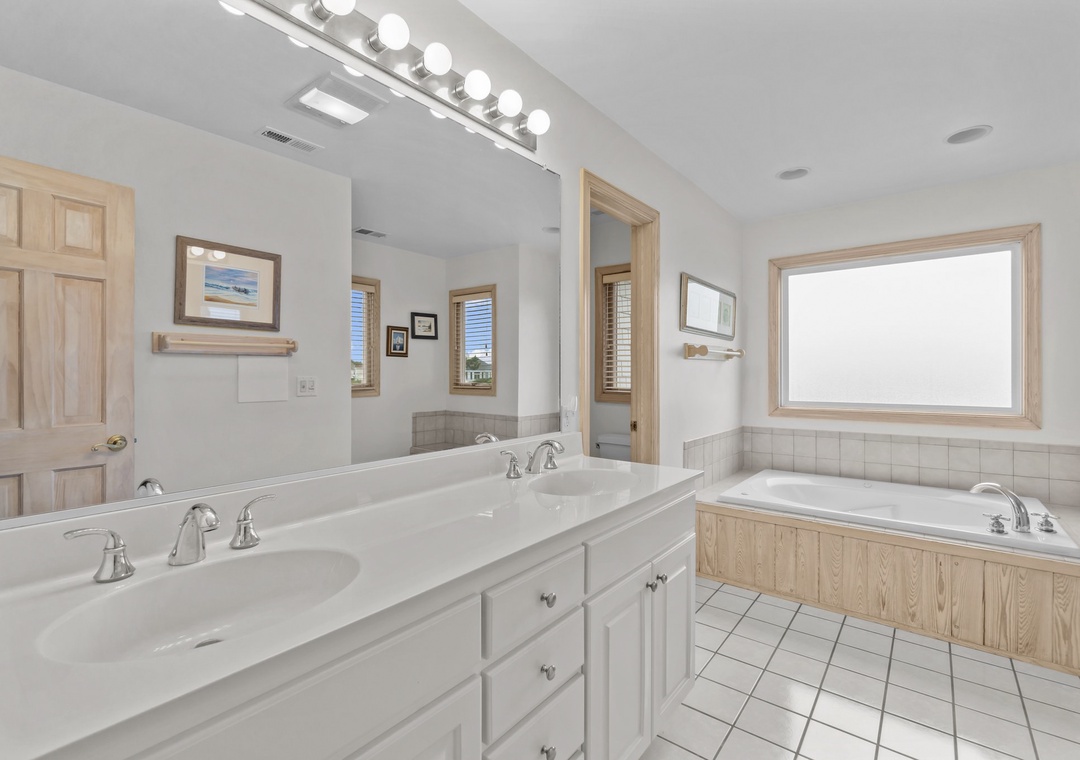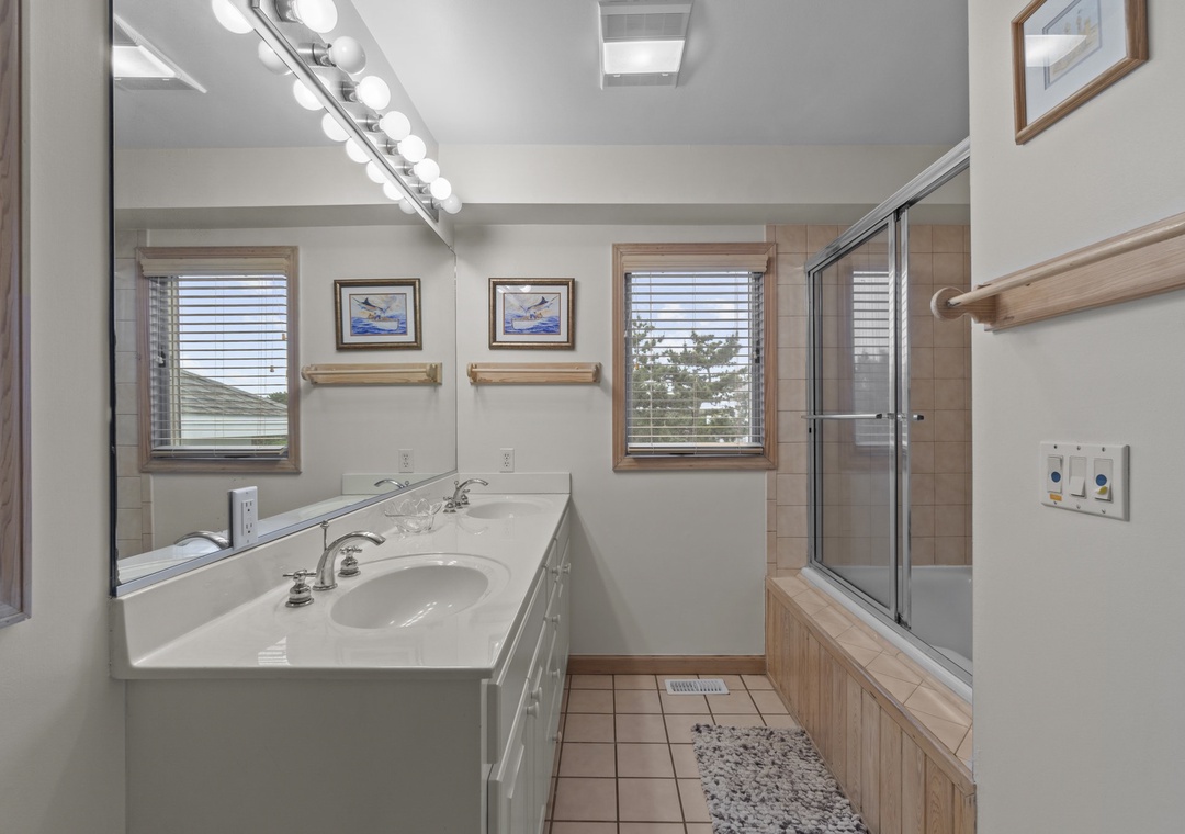 Back inside on the middle level you are met with two luxurious king bedrooms with whirlpool tubs and TVs offer a spa-like retreat. A room with two singles (with trundles) and another with two bunk sets share a bathroom across the hall. The secluded hot tub deck between the ground and mid-level is perfect for stargazing or unwinding after a beach day. Swing your cares away on the middle deck’s double swings while soaking in the ocean breeze.