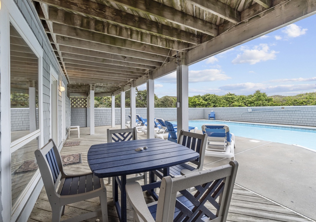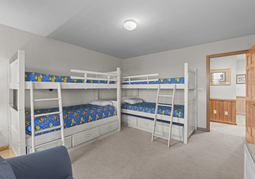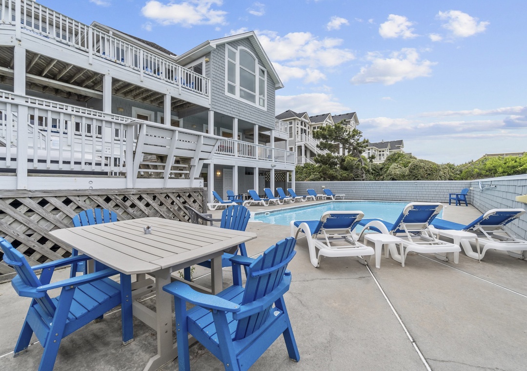 Dive into vacation mode on the pool deck, surrounded by loungers, outdoor speakers, and two polywood dining tables perfect for poolside meals. Inside, challenge your crew to a game of pool in the rec room, complete with a TV, stereo, and fridge for cold drinks. Need a quiet escape? The cozy den offers a sofa bed, full bath, and TV/DVD. A large bedroom with a pyramid bunk and another full bath makes this level ideal for kids or teens. Rinse off in the private outdoor showers or prep your catch of the day at the fish station. From here, stroll down your private beach walk with a foot wash at the gate.