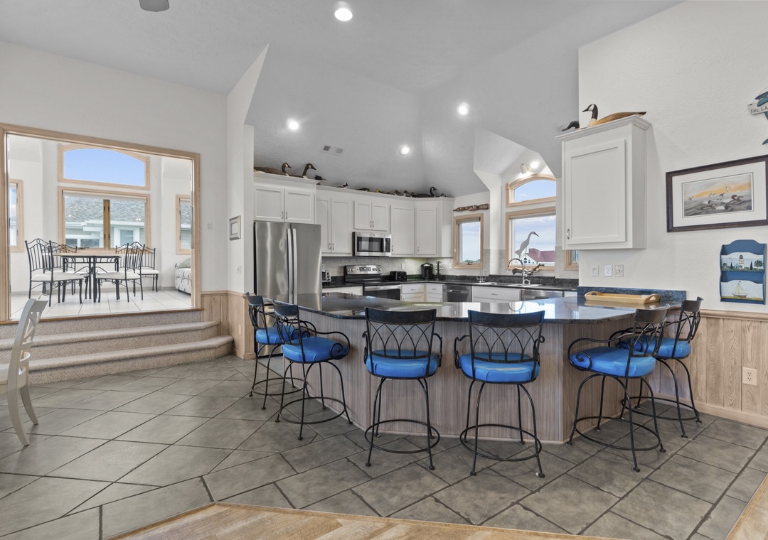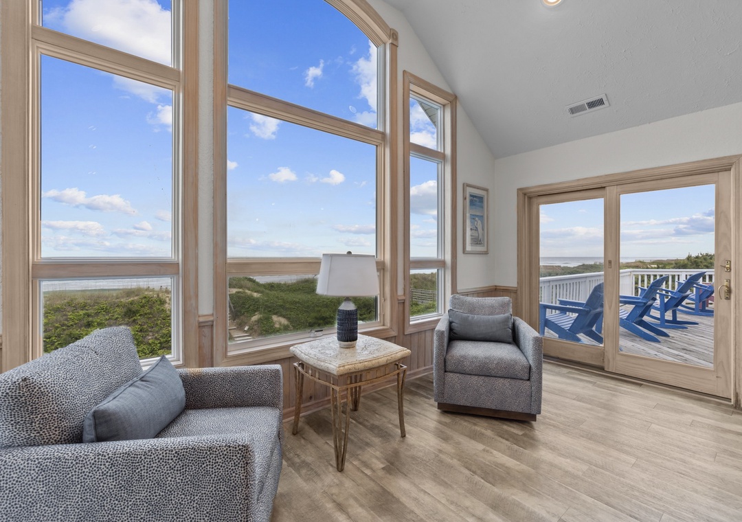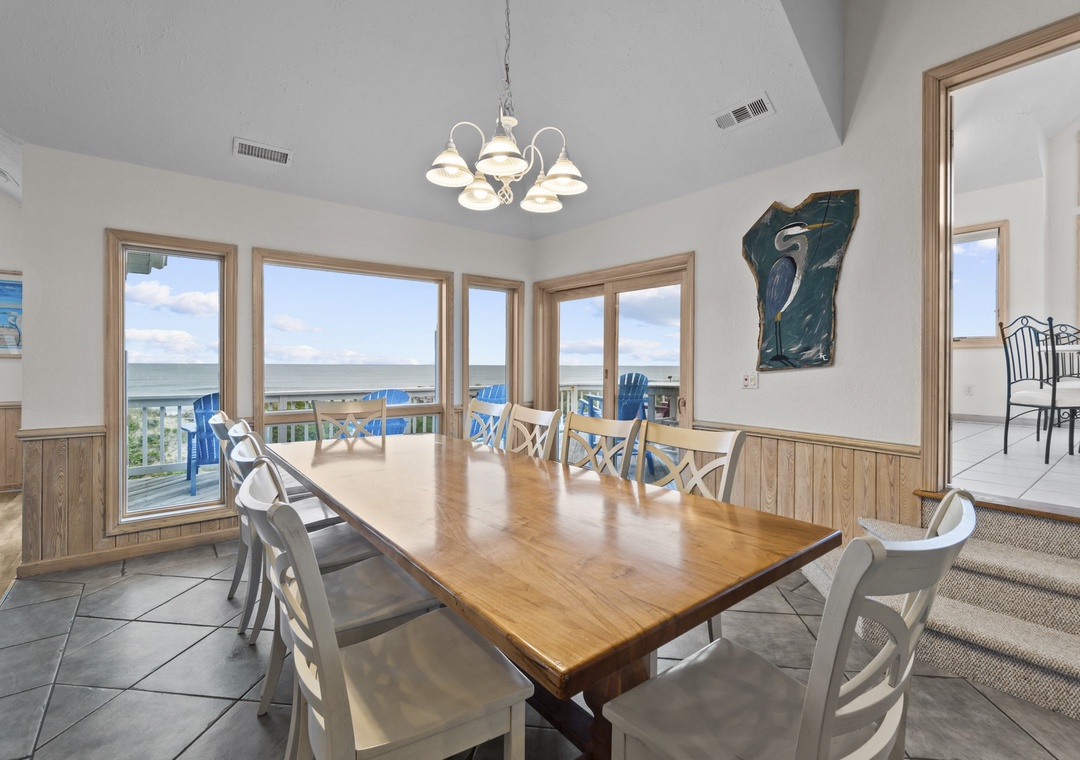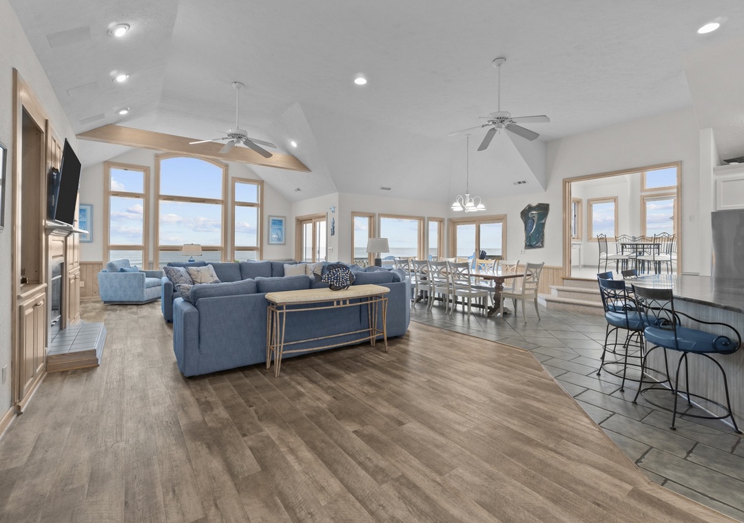 Stepping upstairs into the heart of the home! Enjoy sweeping ocean views from the open great room with a large U-shaped couch, swivel chairs, and a gas fireplace. The sunroom with glass doors adds extra seating and a round table for games or snacks. The kitchen is a dream with two dishwashers, a large pantry, and island seating for six. The dining table seats ten and offers panoramic views. A King main bedroom with whirlpool and TV completes this level. Step out onto the wraparound deck with Adirondack chairs and a high-top table, perfect for dolphin and pelican watching.