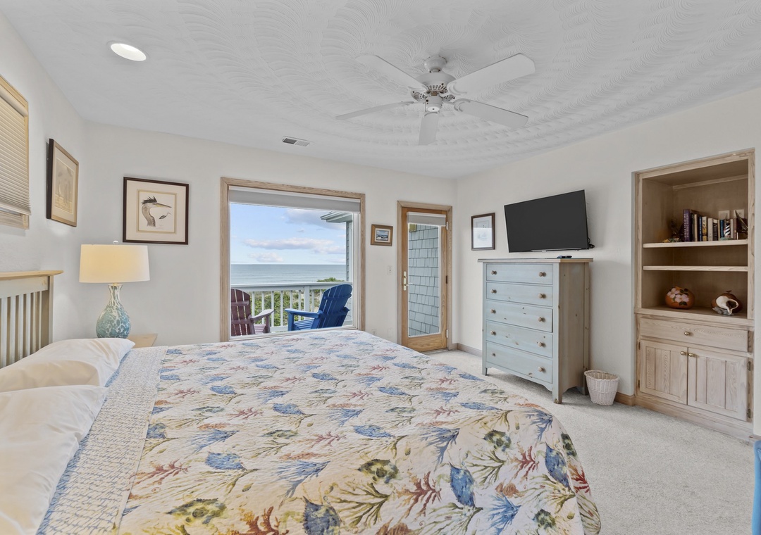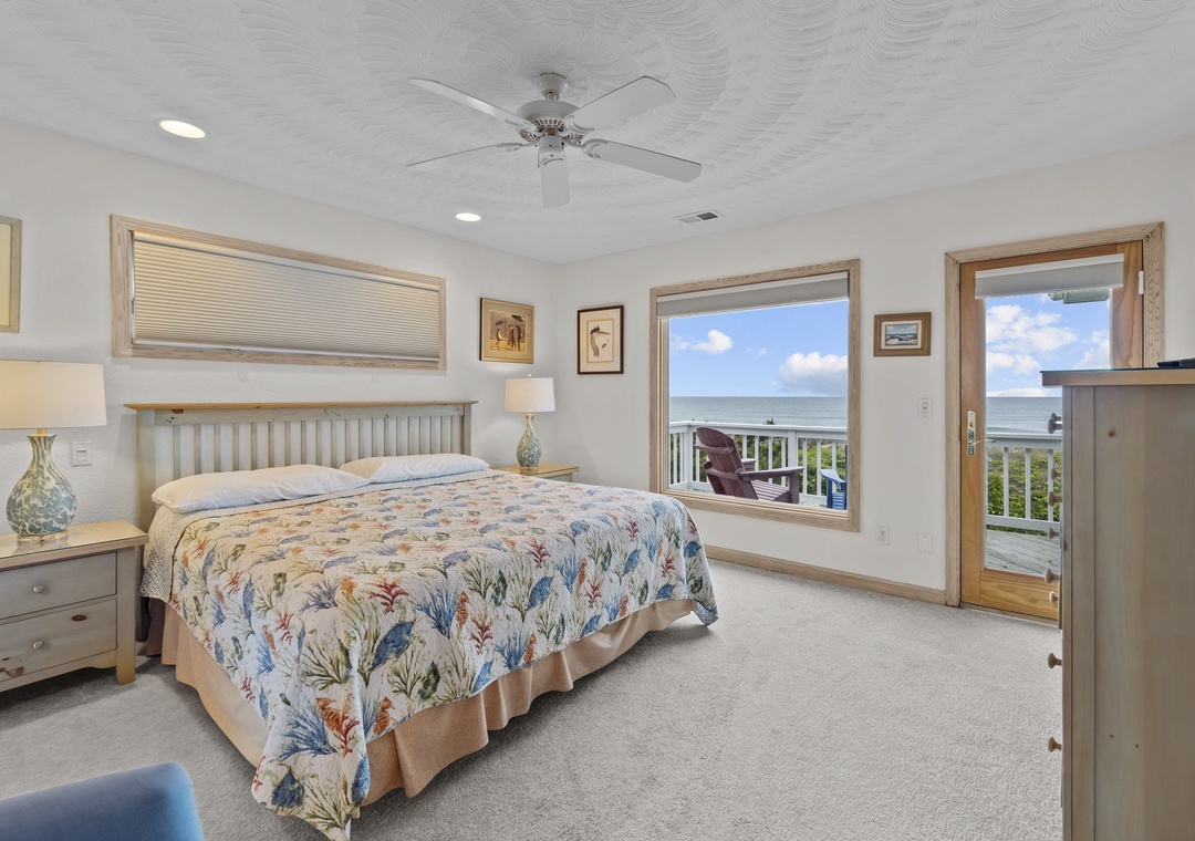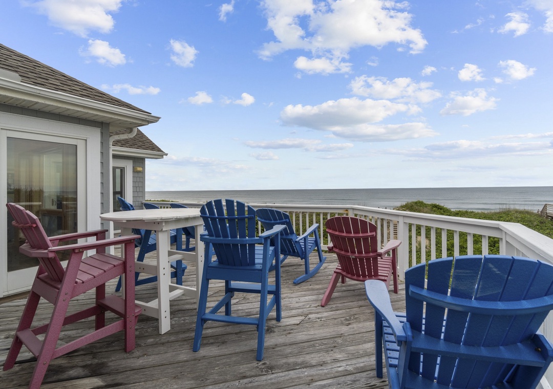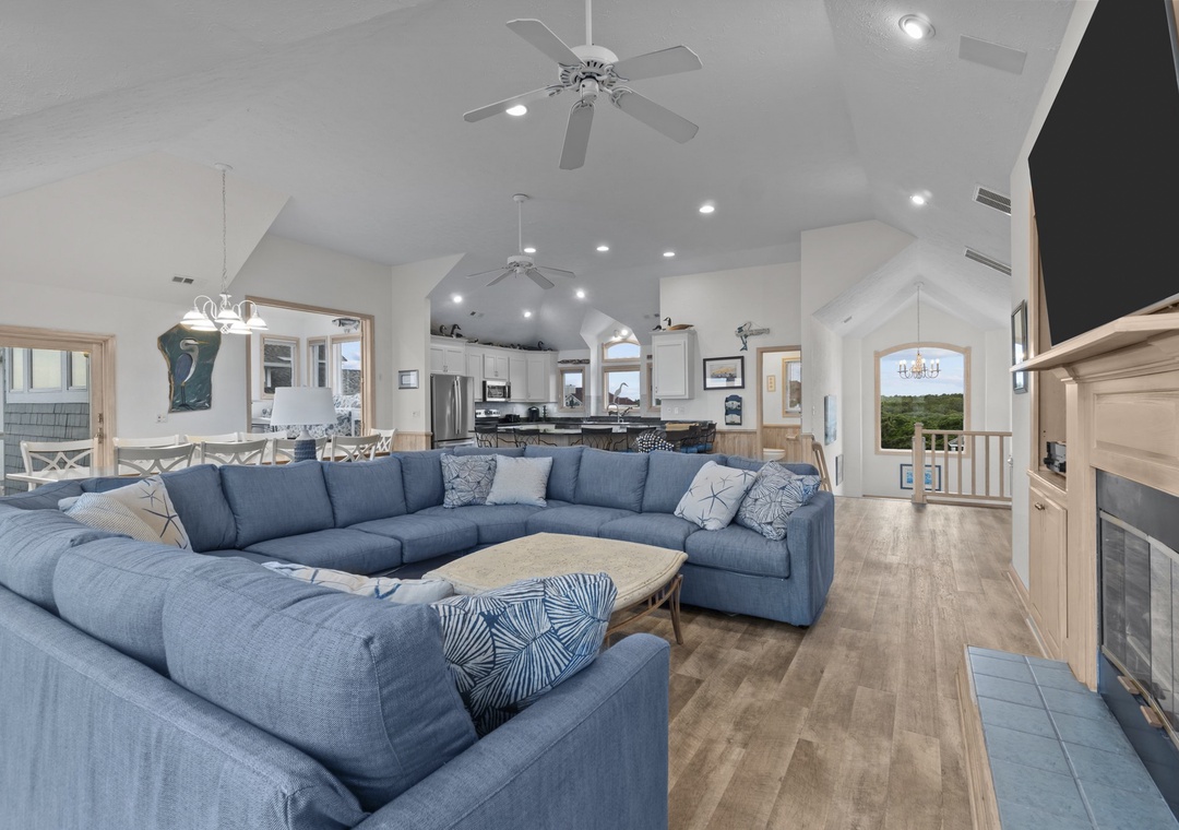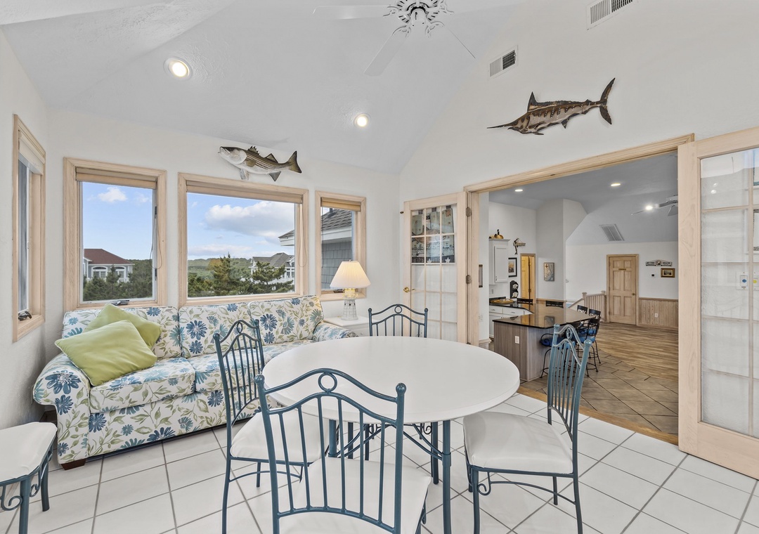 Stepping upstairs into the heart of the home! Enjoy sweeping ocean views from the open great room with a large U-shaped couch, swivel chairs, and a gas fireplace. The sunroom with glass doors adds extra seating and a round table for games or snacks. The kitchen is a dream with two dishwashers, a large pantry, and island seating for six. The dining table seats ten and offers panoramic views. A King main bedroom with whirlpool and TV completes this level. Step out onto the wraparound deck with Adirondack chairs and a high-top table, perfect for dolphin and pelican watching.