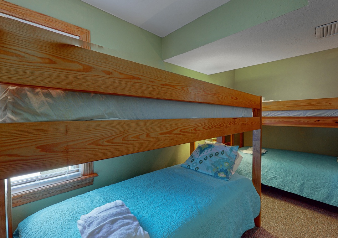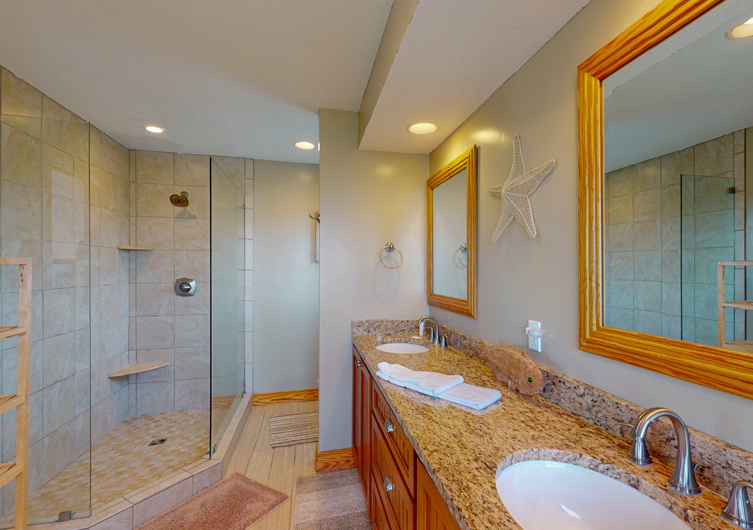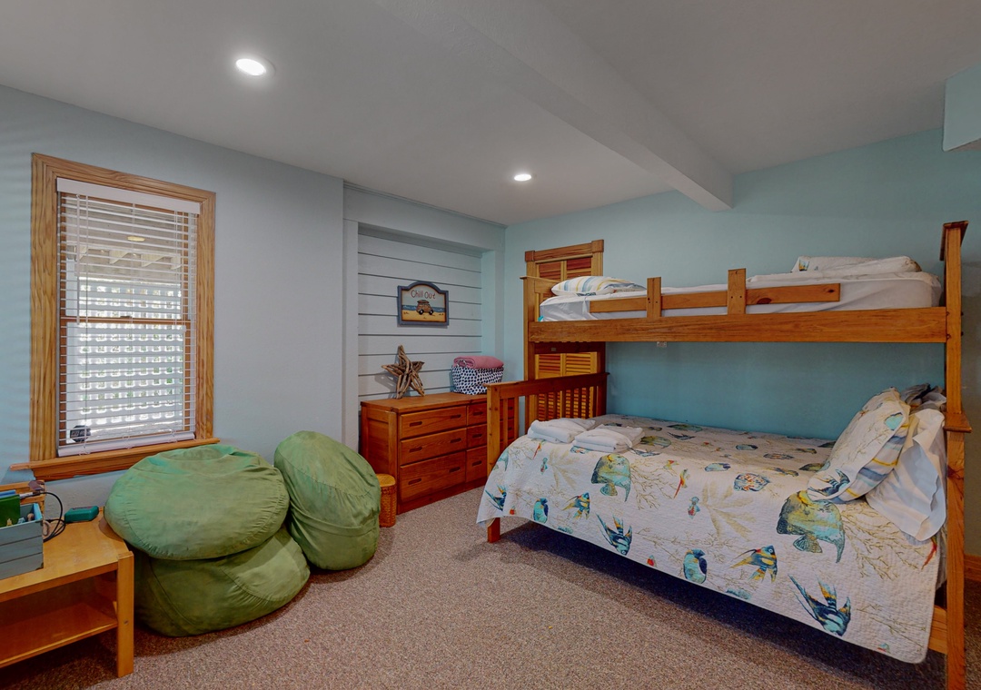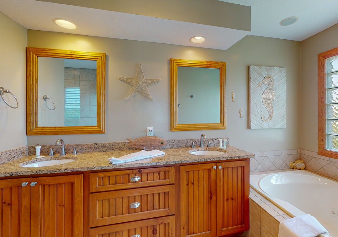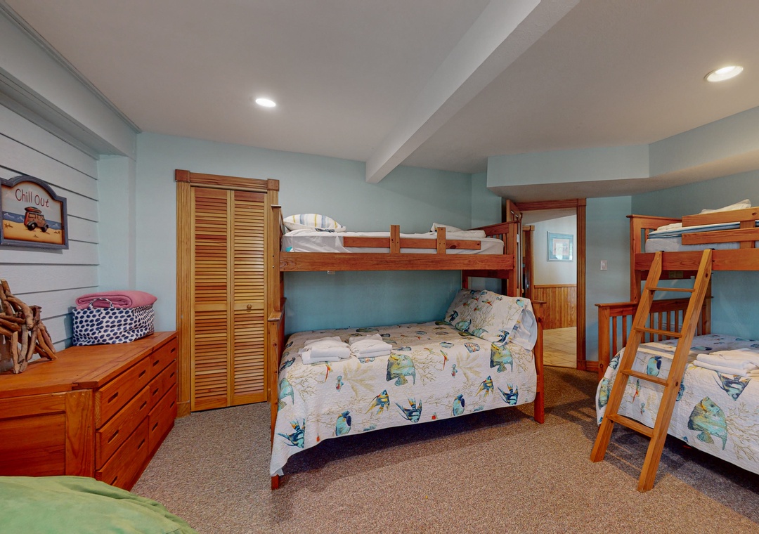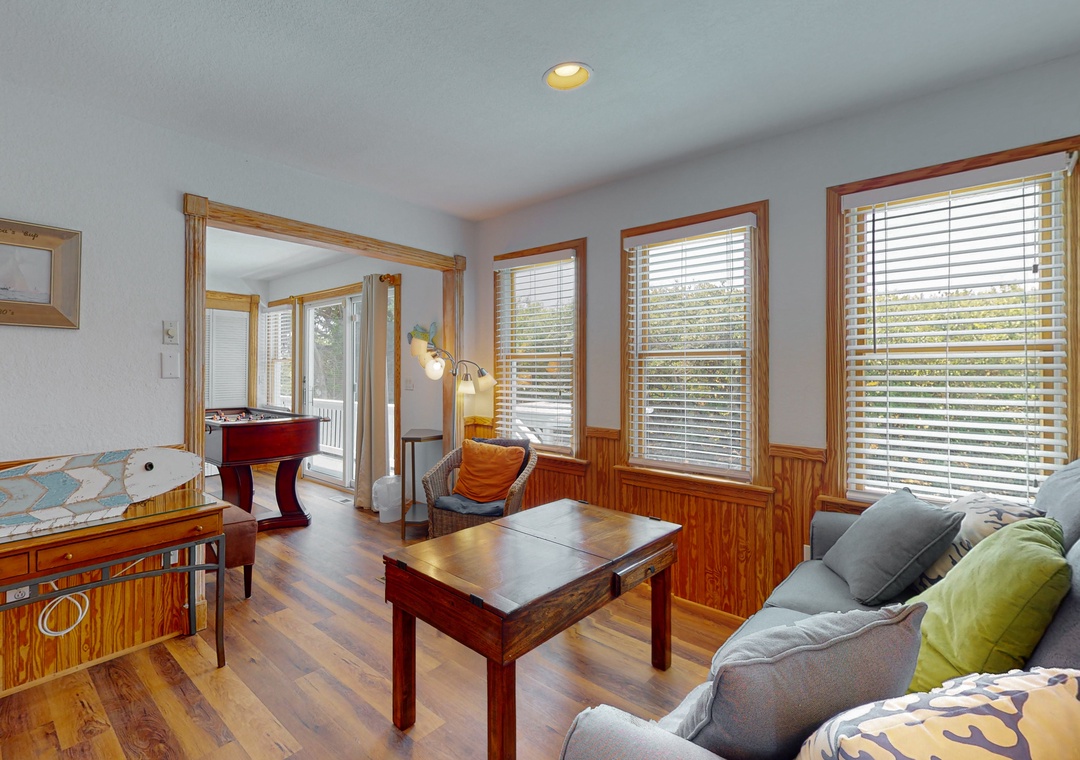 The ground level offers two bedrooms, one with a TV and gaming console for the kids, two full baths, a recently renovated recreation room with a pool table, a TV, a DVD player, a full-size fridge, and a freestanding Scotsman Ice Maker. The pool deck has an outside shower, storage area, and plenty of seating around the pool. The second level has a main bedroom with a private deck, another bedroom that shares a full bath with a room with a queen bedroom. The den has a queen sofa bed and a foosball table that gives the kids an area all their own. Deck access on this level leads out to the eight-person hot tub, a hammock, and a two-person hammock swing. On the top level, the bright and spacious great room is comfortably furnished and features a TV, a stereo, a gas fireplace, dining areas, a half bath, and an elevated ship’s watch stocked with games, puzzles, and books. The newly remodeled kitchen has all-new stainless steel appliances, cabinets, and granite countertops. The main bedroom has a newly remodeled full bath with a walk-in shower, new cabinets and sinks, and a jetted tub. The gas grill and picnic table are located outside on the wraparound deck. You'll also have beach access just 40 yards away.