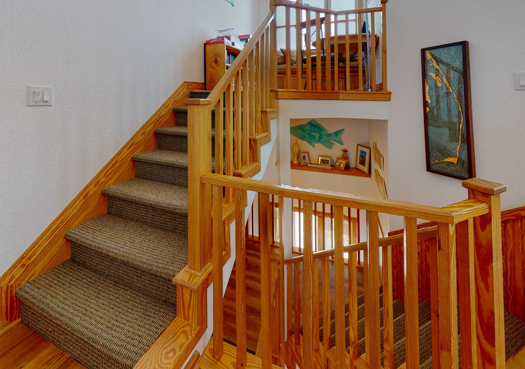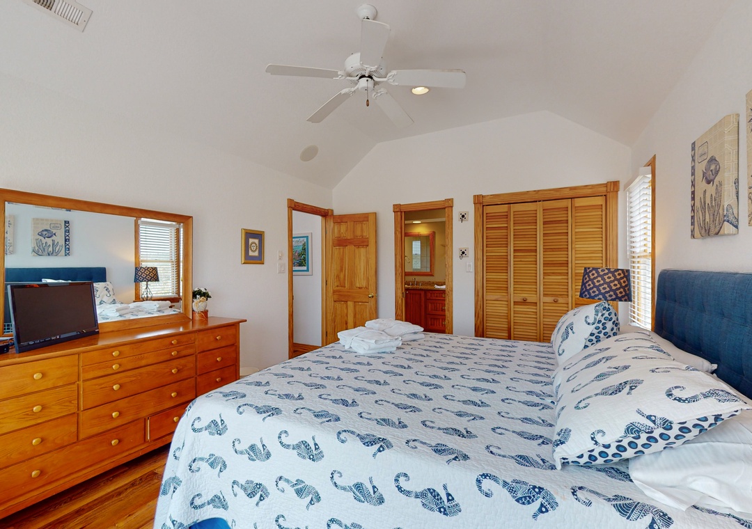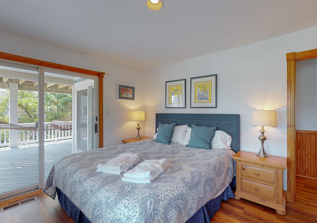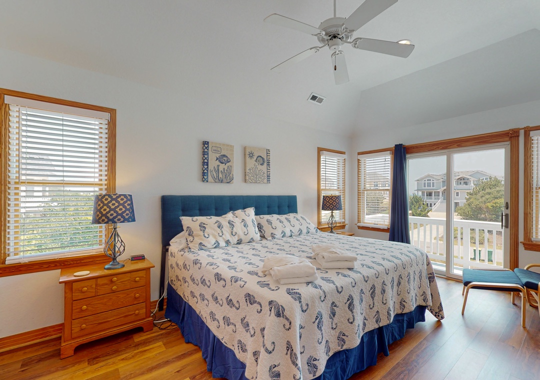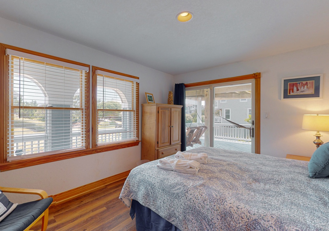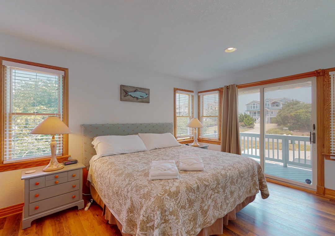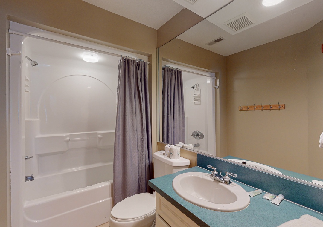 The ground level offers two bedrooms, one with a TV and gaming console for the kids, two full baths, a recently renovated recreation room with a pool table, a TV, a DVD player, a full-size fridge, and a freestanding Scotsman Ice Maker. The pool deck has an outside shower, storage area, and plenty of seating around the pool. The second level has a main bedroom with a private deck, another bedroom that shares a full bath with a room with a queen bedroom. The den has a queen sofa bed and a foosball table that gives the kids an area all their own. Deck access on this level leads out to the eight-person hot tub, a hammock, and a two-person hammock swing. On the top level, the bright and spacious great room is comfortably furnished and features a TV, a stereo, a gas fireplace, dining areas, a half bath, and an elevated ship’s watch stocked with games, puzzles, and books. The newly remodeled kitchen has all-new stainless steel appliances, cabinets, and granite countertops. The main bedroom has a newly remodeled full bath with a walk-in shower, new cabinets and sinks, and a jetted tub. The gas grill and picnic table are located outside on the wraparound deck. You'll also have beach access just 40 yards away.