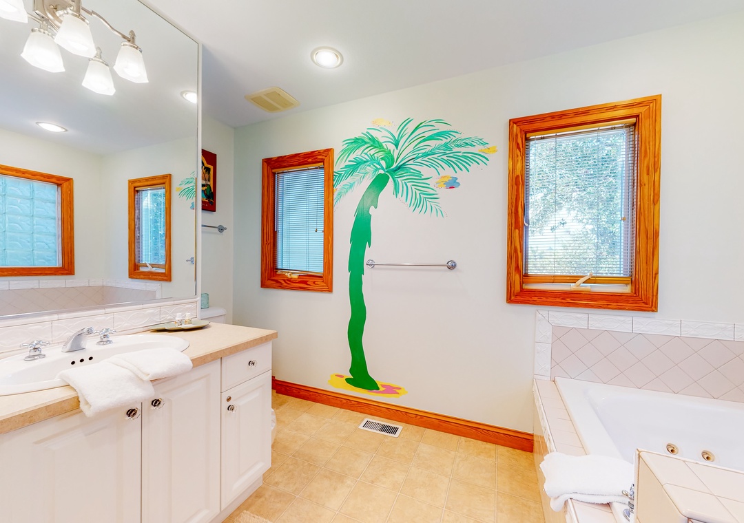 Mid-Level: main bedroom with Jacuzzi tub and shower, TV, and deck access; main bedroom with shower only, TV and deck access; bedroom with TV/DVD and deck access; open sitting area with a queen sofa bed and deck access; full hall bath.