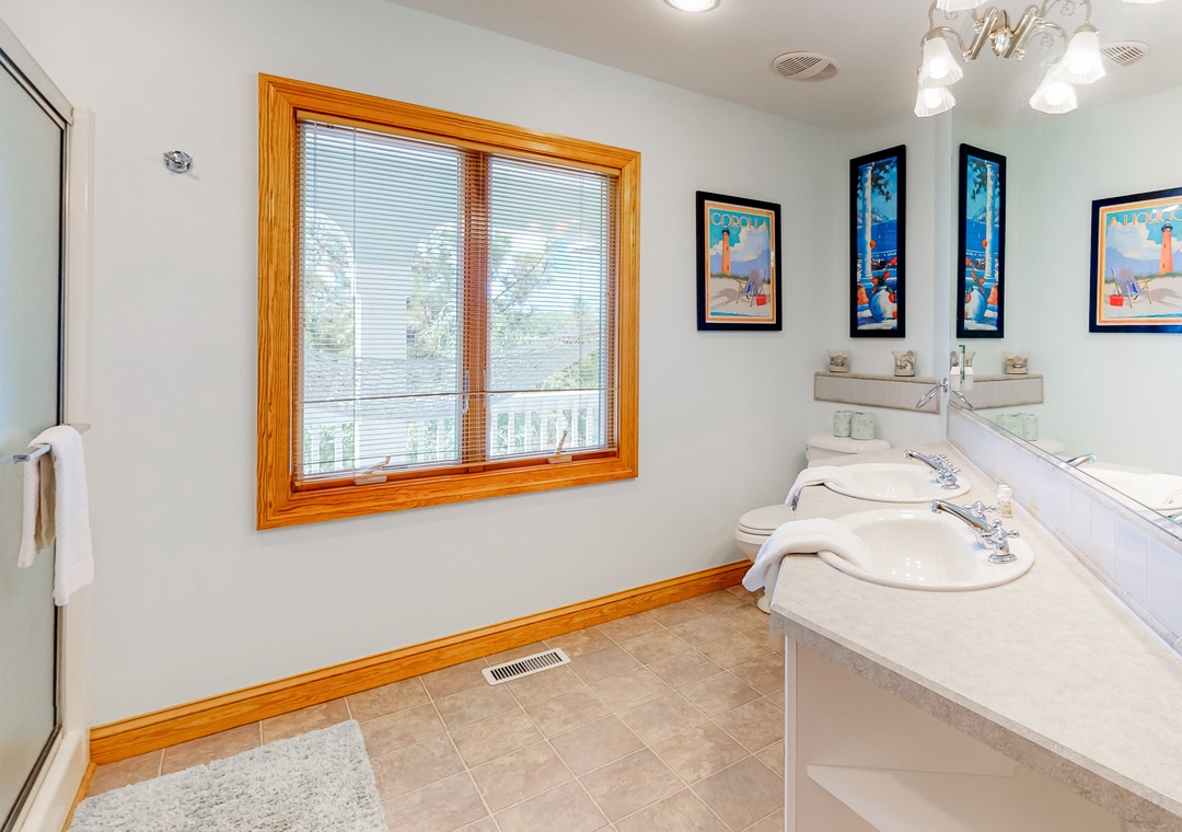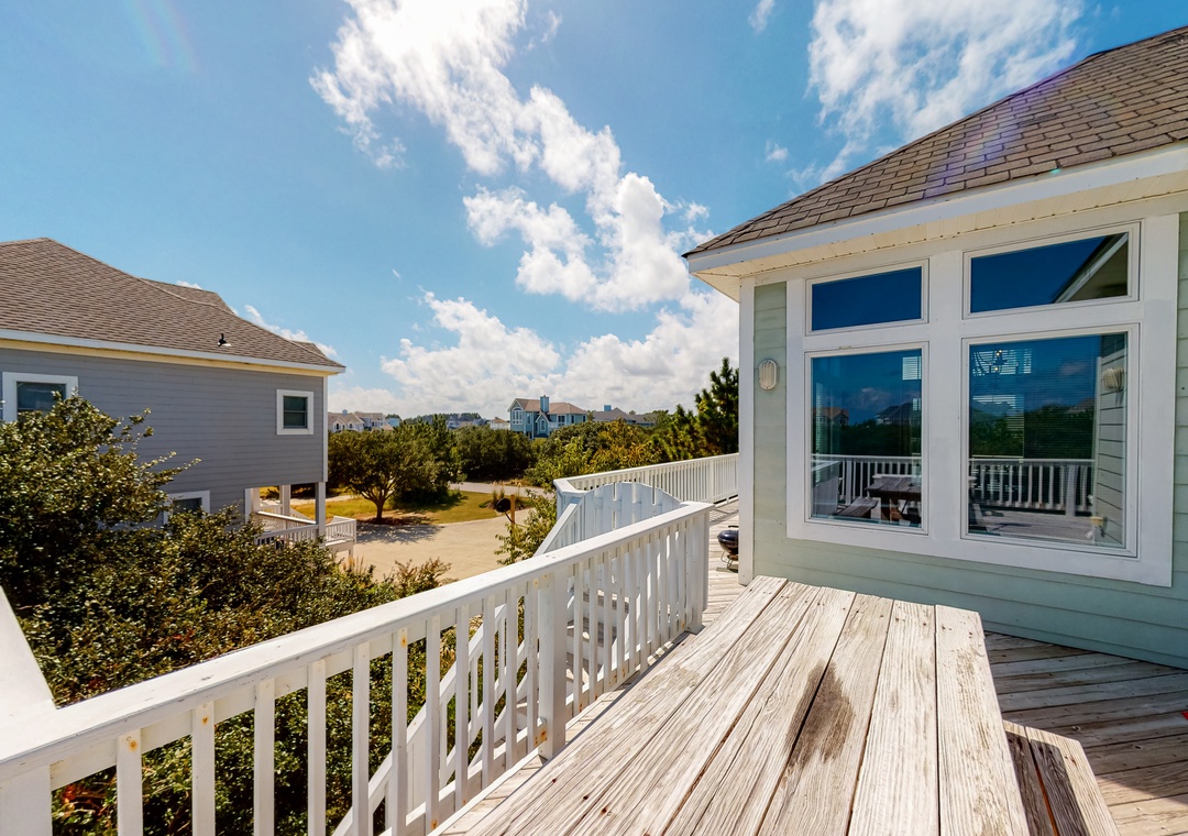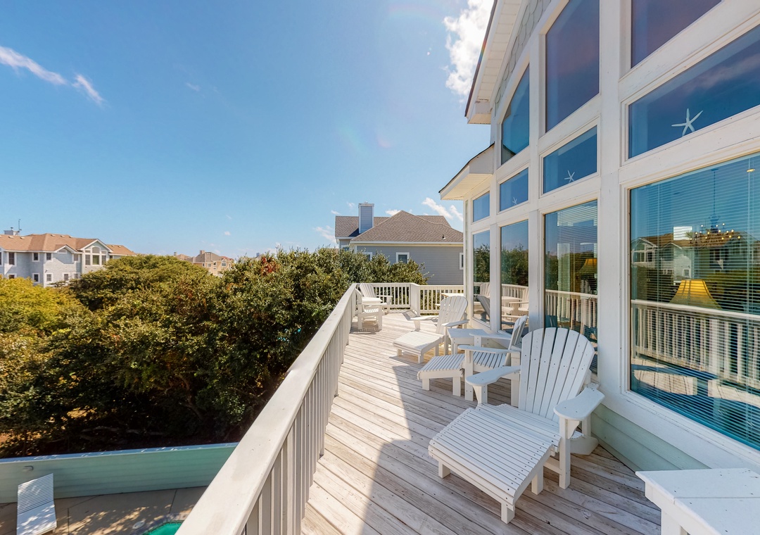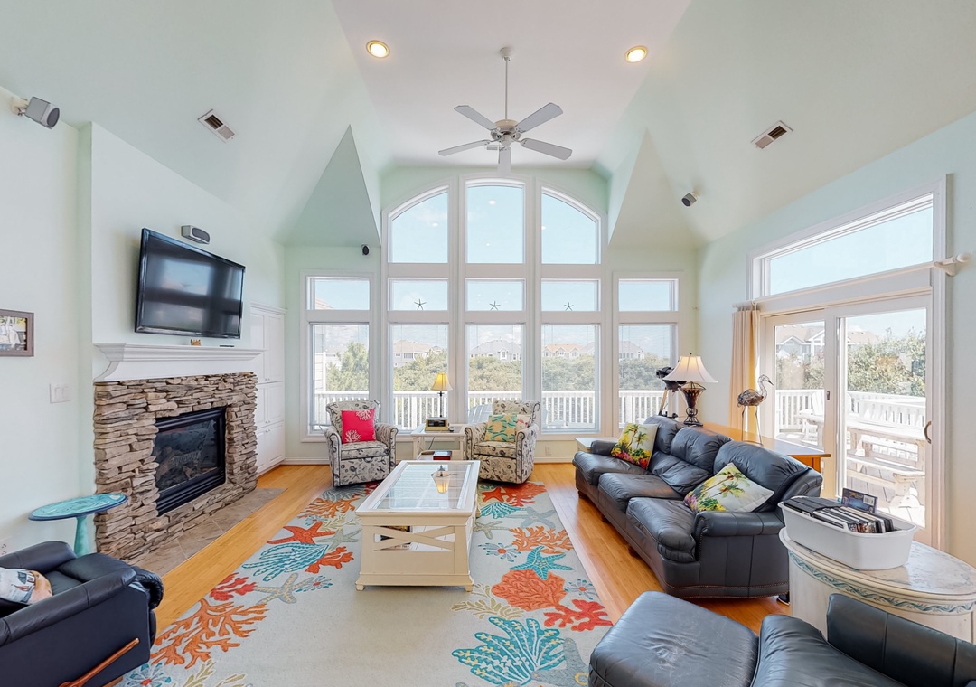 Top Level: main bedroom with TV, large tiled shower and slider access to oceanside deck; great room with gas fireplace, deck access, TV, Blu-ray player; dining room with seating for 12; kitchen with breakfast bar and seating for three; powder room. Ships watch reading nook with library and seating.