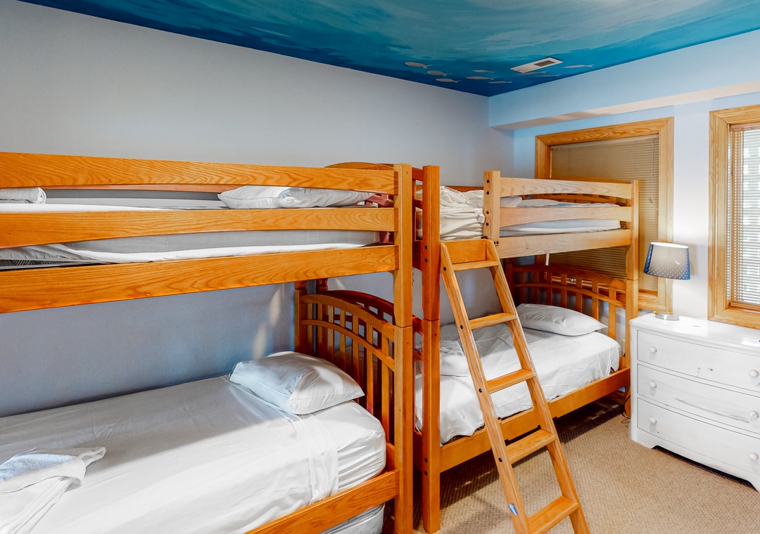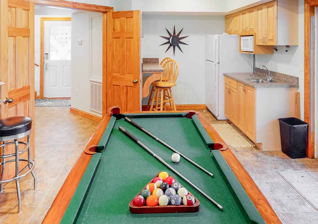 Ground Level: Two bunk sets and trundle bedroom and a TV; hall bath; recreation room with pool table, TV, Blu-ray player, Wii, kitchenette, full-size refrigerator, microwave, outdoor speakers, and door to the pool area.