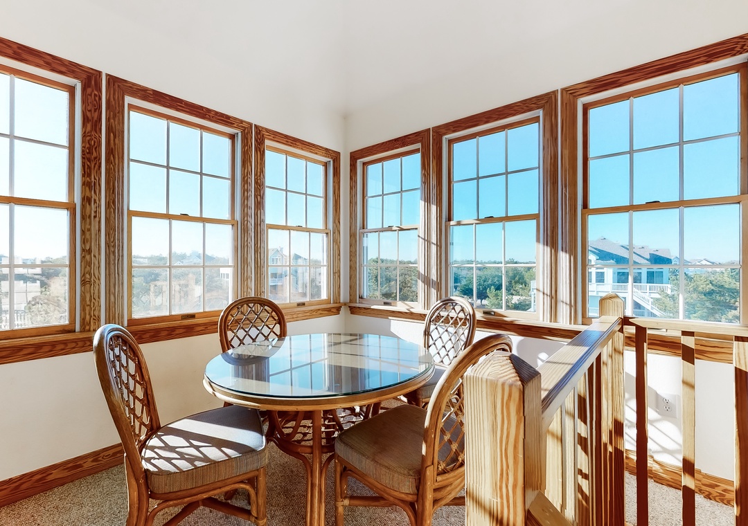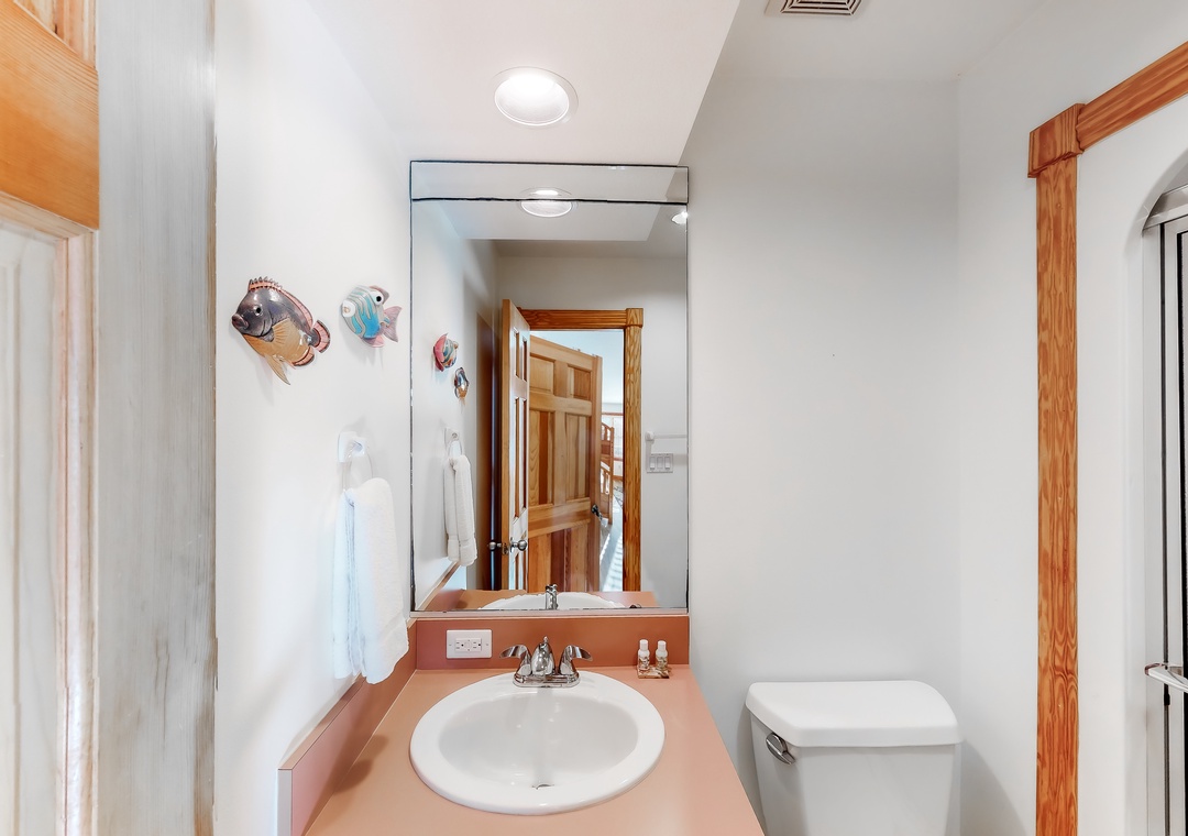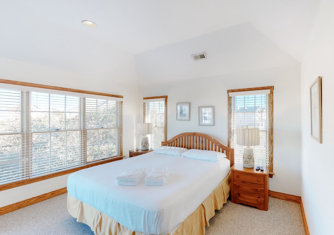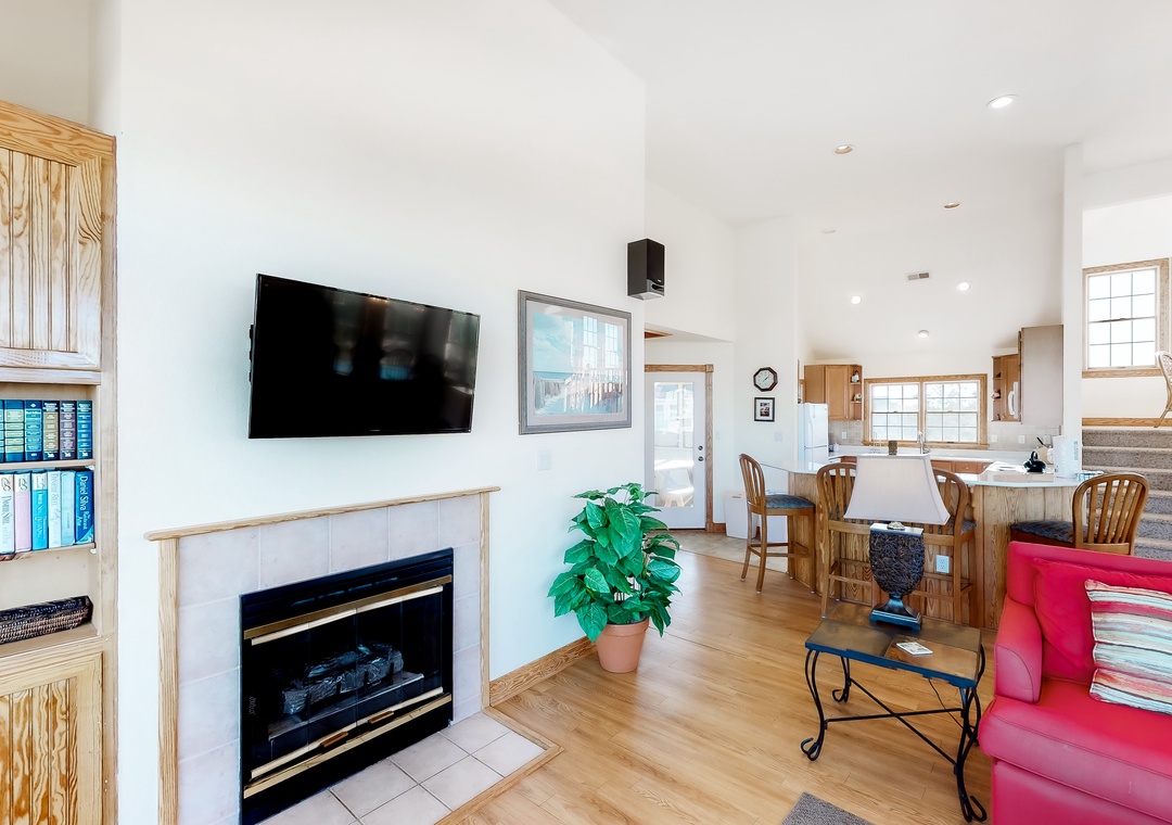 Top Level: This floor offers a living room with an electric fireplace and entertainment center, a well-equipped kitchen, dining area, half bath, and a ship's watch with a game table. The main bedroom with a TV is located here. The ocean views add to this home's appeal, as well as the screened porch with a picnic table off of the kitchen.
