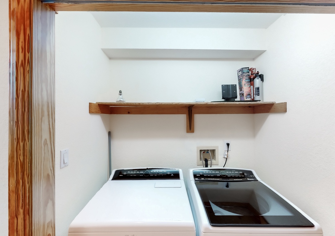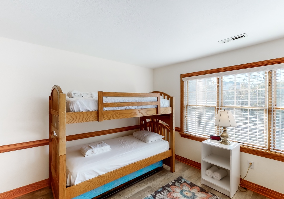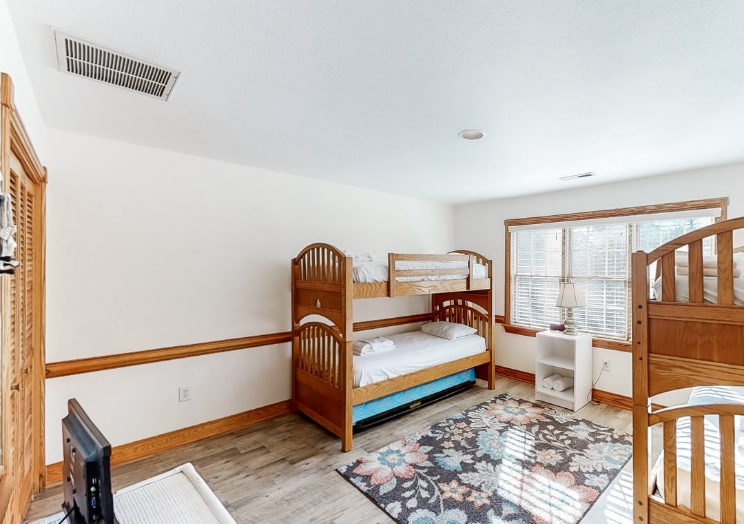 Ground Level: This level offers a room with two bunk sets and two trundles, a TV, a full bathroom, and laundry.