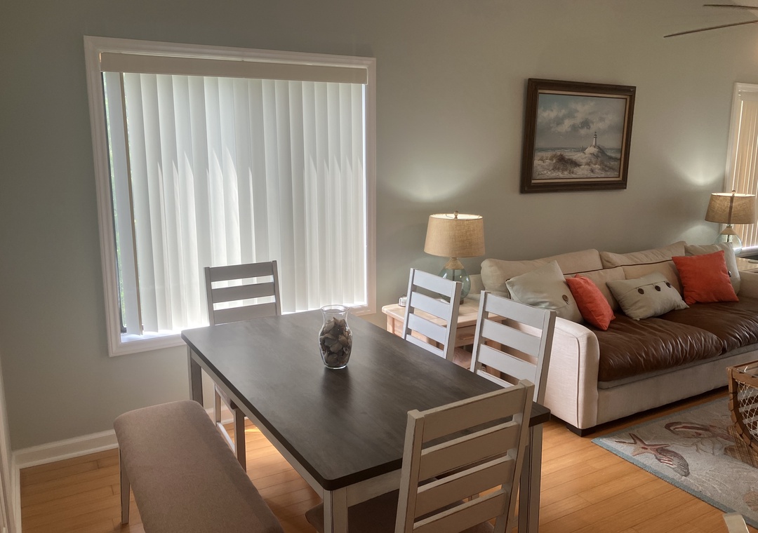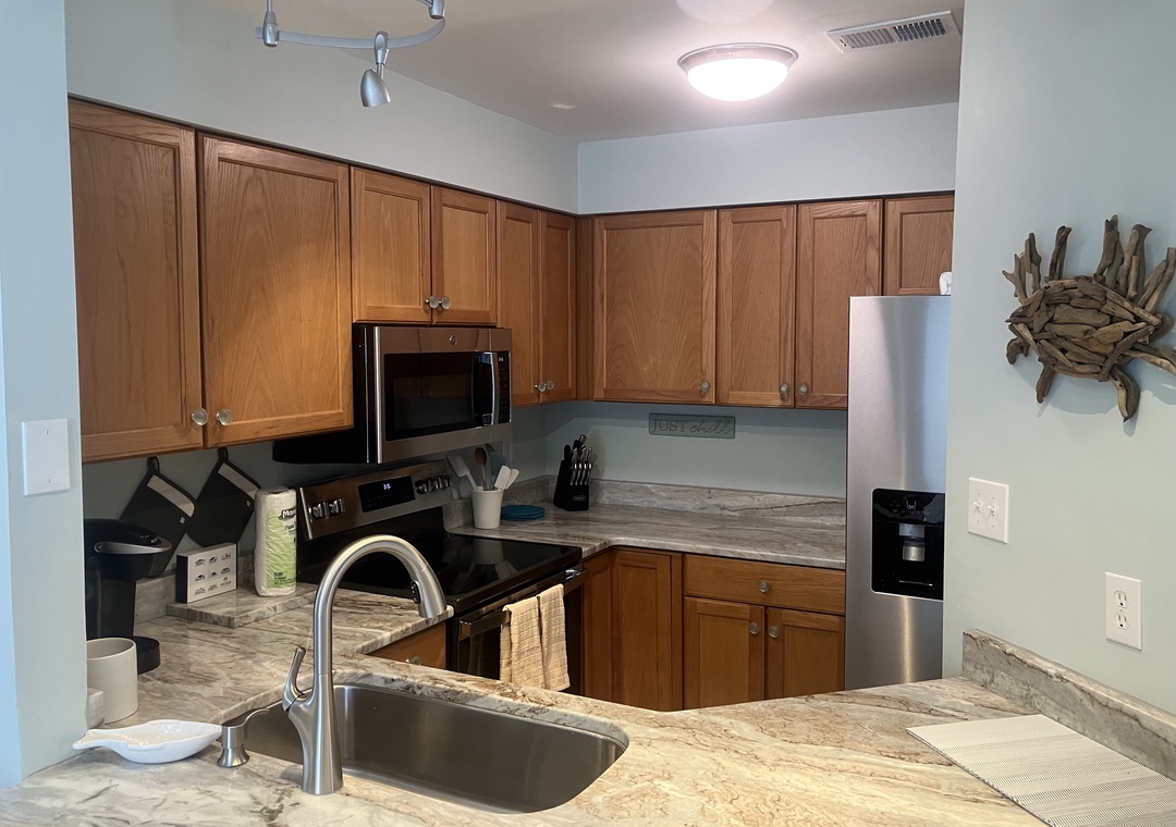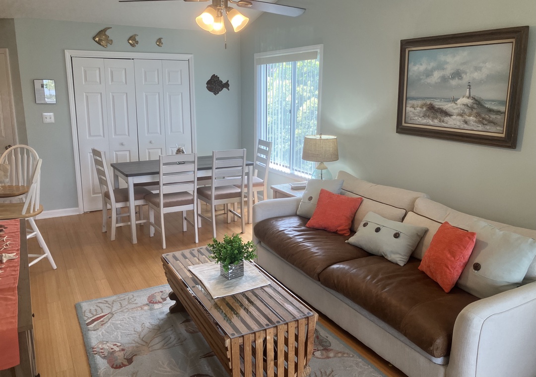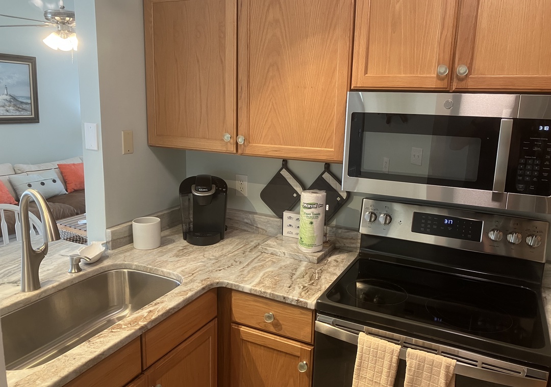 When you enter this sound-view condo, you are greeted by a bright open floor plan that seamlessly combines all living spaces into one with several windows flooding the space with natural light. Unwind in the welcoming living room featuring an inviting sofa and a TV while the chef of the group prepares exquisite homemade meals in the well-appointed kitchen, complete with all stainless steel appliances and a Keurig coffee maker. The living area opens onto a spacious covered balcony with spectacular views of the sound. Additional perks include a washer/dryer.