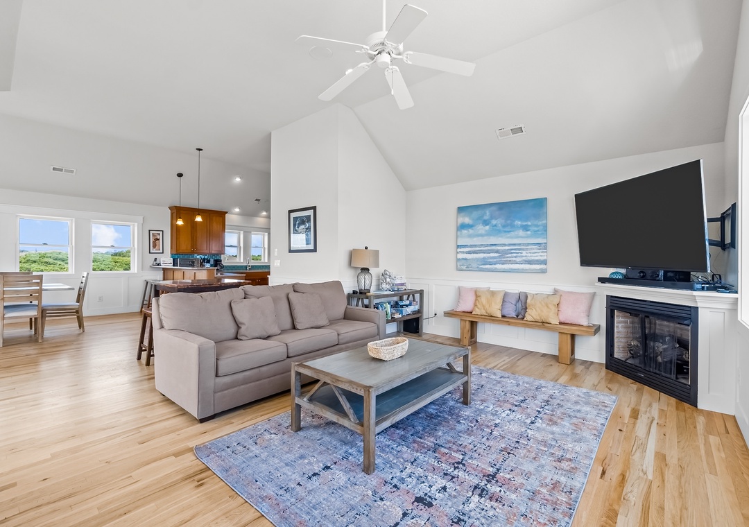 The mid-level boasts 2 King Master Bedrooms with smart TVs and private bathrooms, a Queen Master Bedroom with deck access, and a Master Bedroom with 2 Bunk Sets, perfect for the kids. On the top level, the spacious kitchen with stainless appliances and granite countertops opens up to the dining room seating 11-12, while the Great room offers stunning ocean views, a smart TV/DVD, and deck access. A King Master Bedroom with a smart TV and a large private bathroom completes the top level.