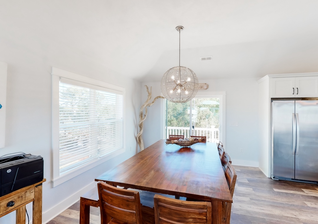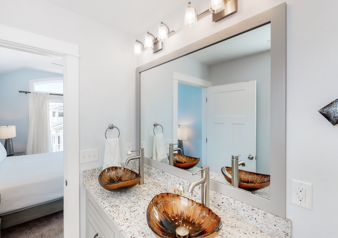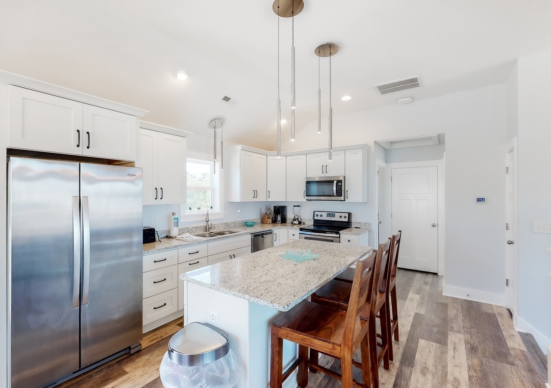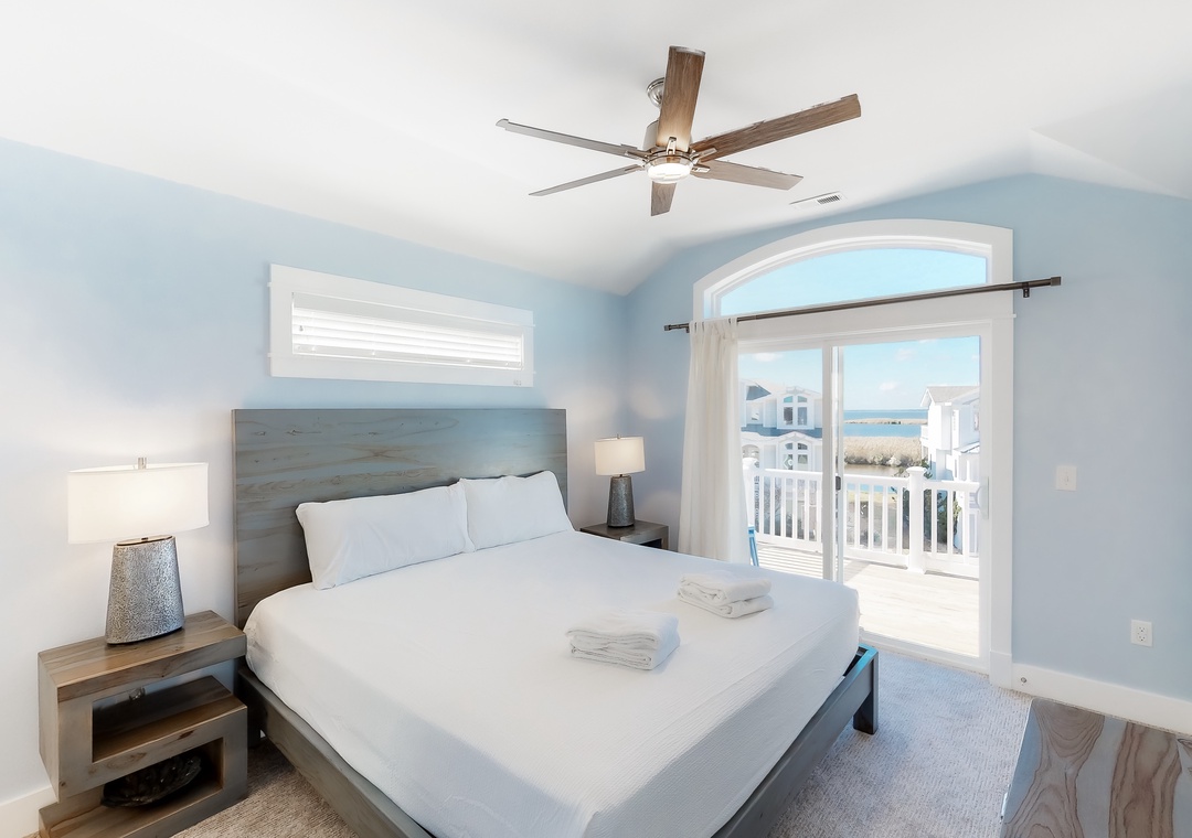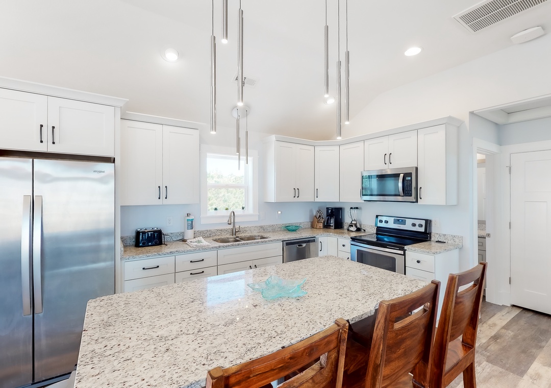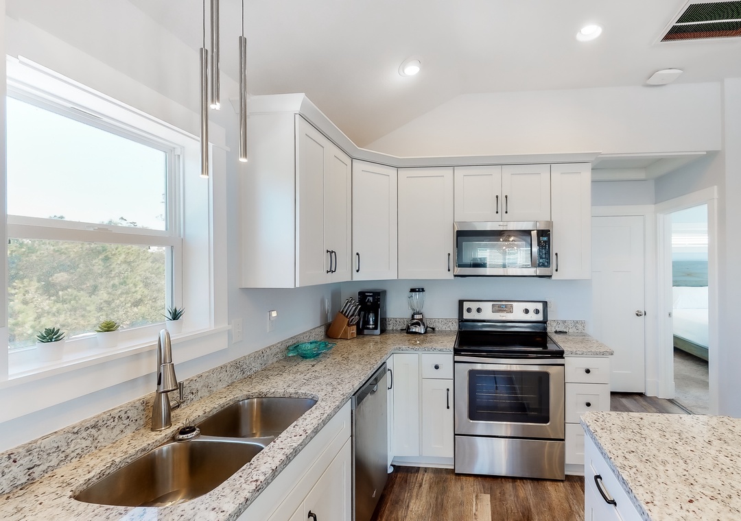 Top Level: The open concept custom kitchen, dining area and great room form the focal point for gathering and socializing in this spectacular home. The kitchen showcases stainless steel appliances, a spacious island with bar seating for 3, and extra storage stocked with all the amenities of home. There is an eight foot dining table with chairs for 6 and a bench to accommodate up to 4 more. The great room offers a TV and fireplace with lots of comfortable seating for family and friends. The front-side deck off the great room boasts amazing views of the sun setting over the sound. The living space also extends seamlessly onto a spacious back-side deck overlooking the private pool. The main master suite is located on this level and offers a King bed, custom bathroom with dual basin sinks, shower, TV, and a private deck allowing for incredible views of the sunset.