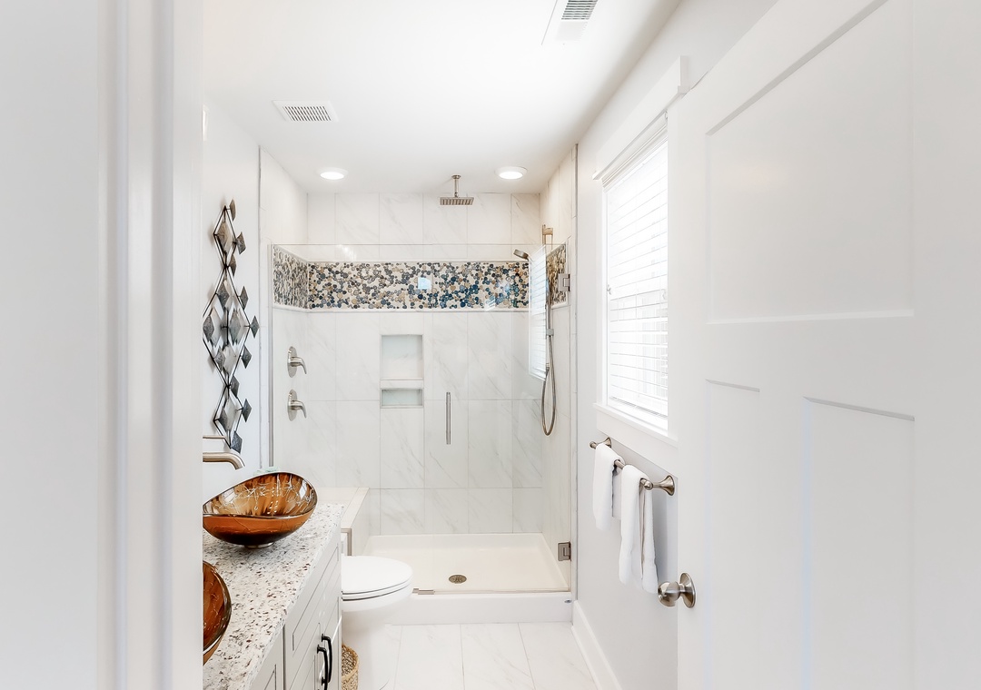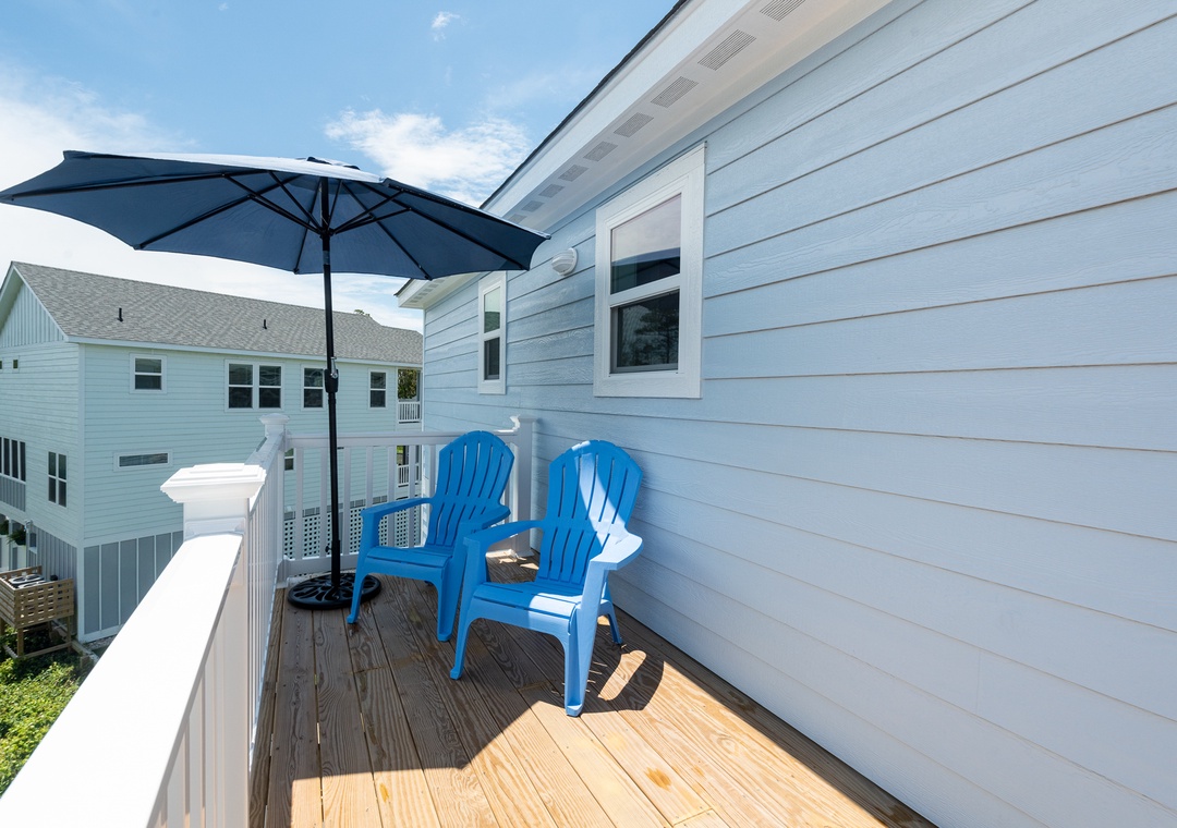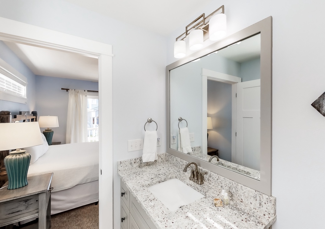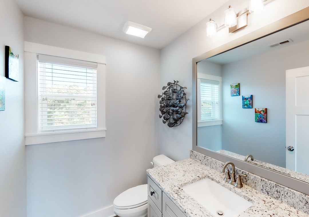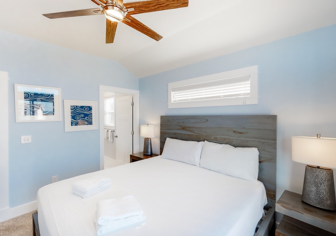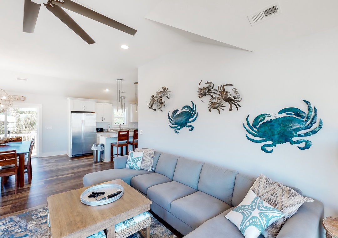 Top Level: The open concept custom kitchen, dining area and great room form the focal point for gathering and socializing in this spectacular home. The kitchen showcases stainless steel appliances, a spacious island with bar seating for 3, and extra storage stocked with all the amenities of home. There is an eight foot dining table with chairs for 6 and a bench to accommodate up to 4 more. The great room offers a TV and fireplace with lots of comfortable seating for family and friends. The front-side deck off the great room boasts amazing views of the sun setting over the sound. The living space also extends seamlessly onto a spacious back-side deck overlooking the private pool. The main master suite is located on this level and offers a King bed, custom bathroom with dual basin sinks, shower, TV, and a private deck allowing for incredible views of the sunset.