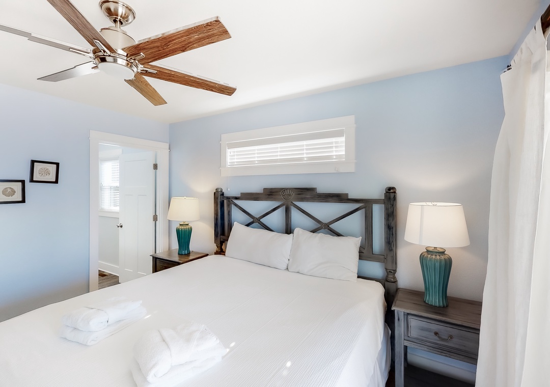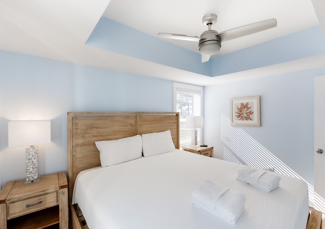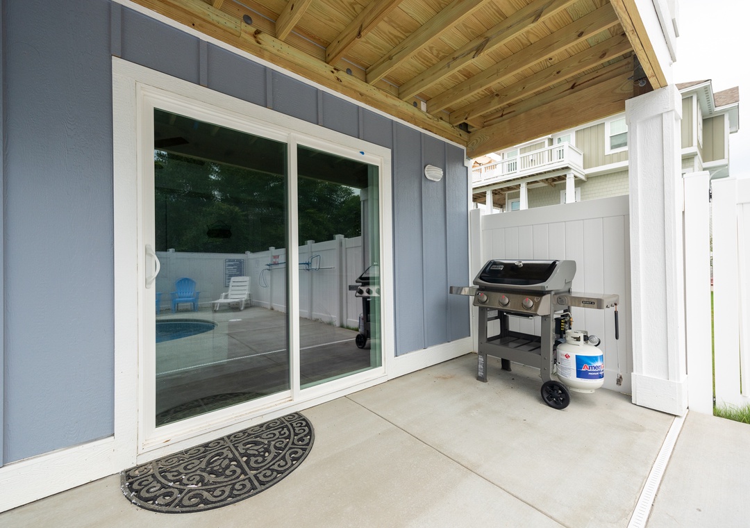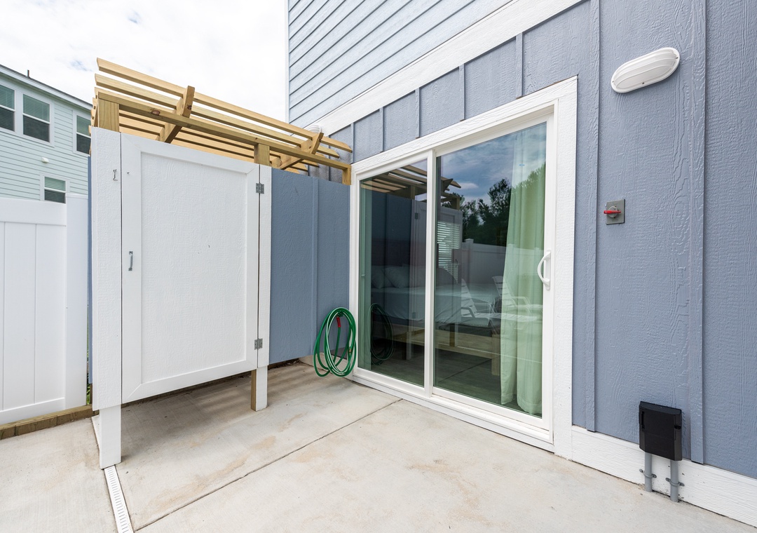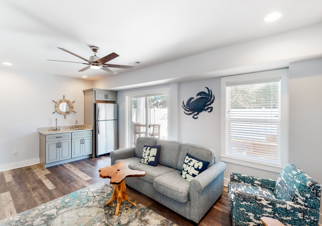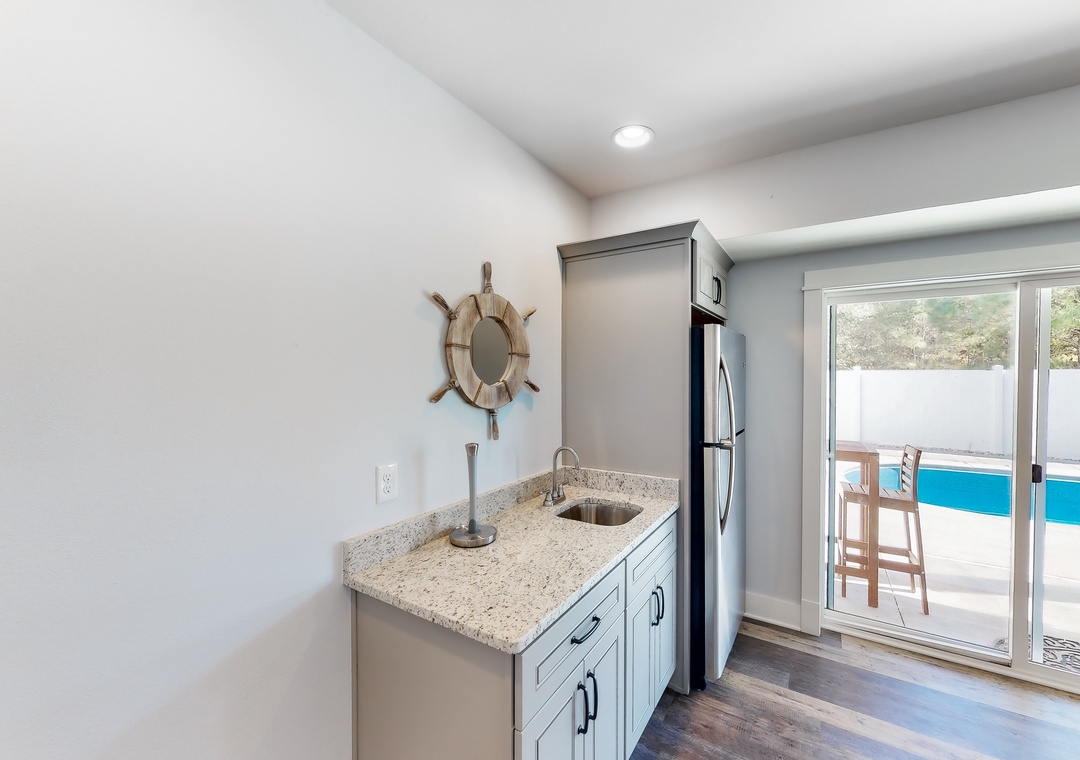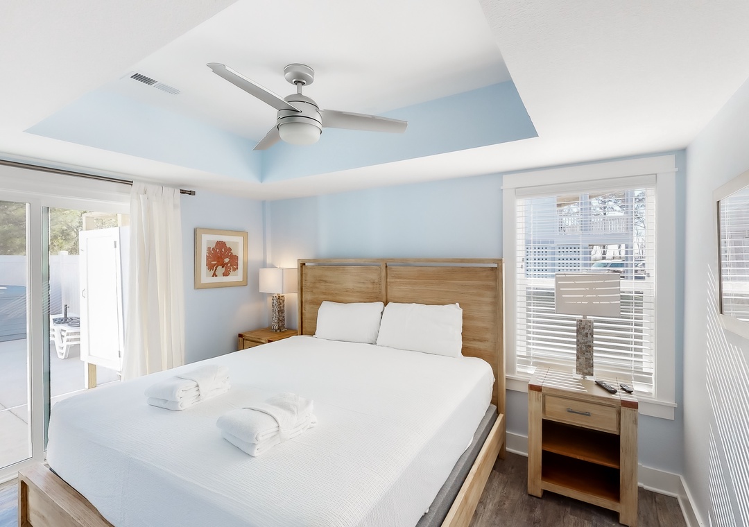Ground Level: A fully enclosed garage enters into the recreation room. The rec. room has a queen sleeper sofa, TV, mini kitchenette, and hall bath with shower. This floor also has a bedroom with a King Bed. Both the rec room and the bedroom have a patio that allows access to the private pool, hot tub and outdoor shower.