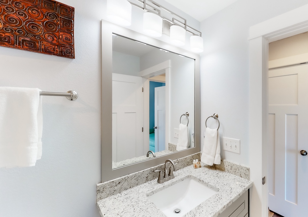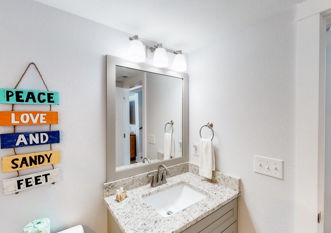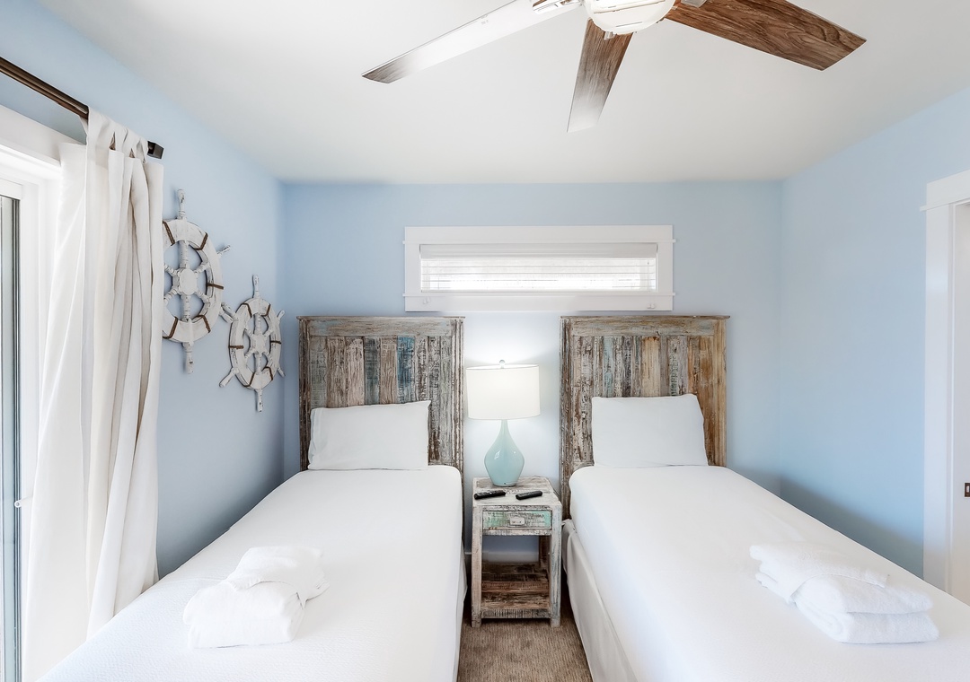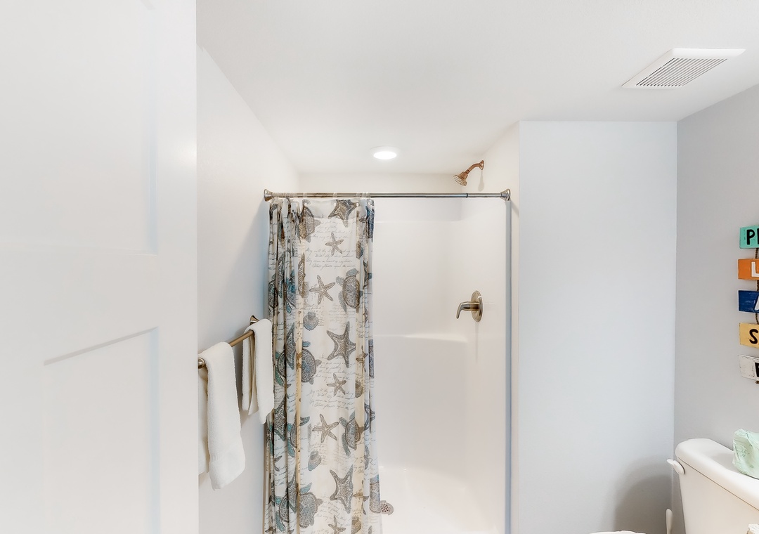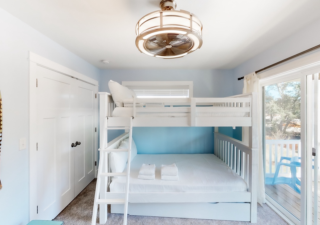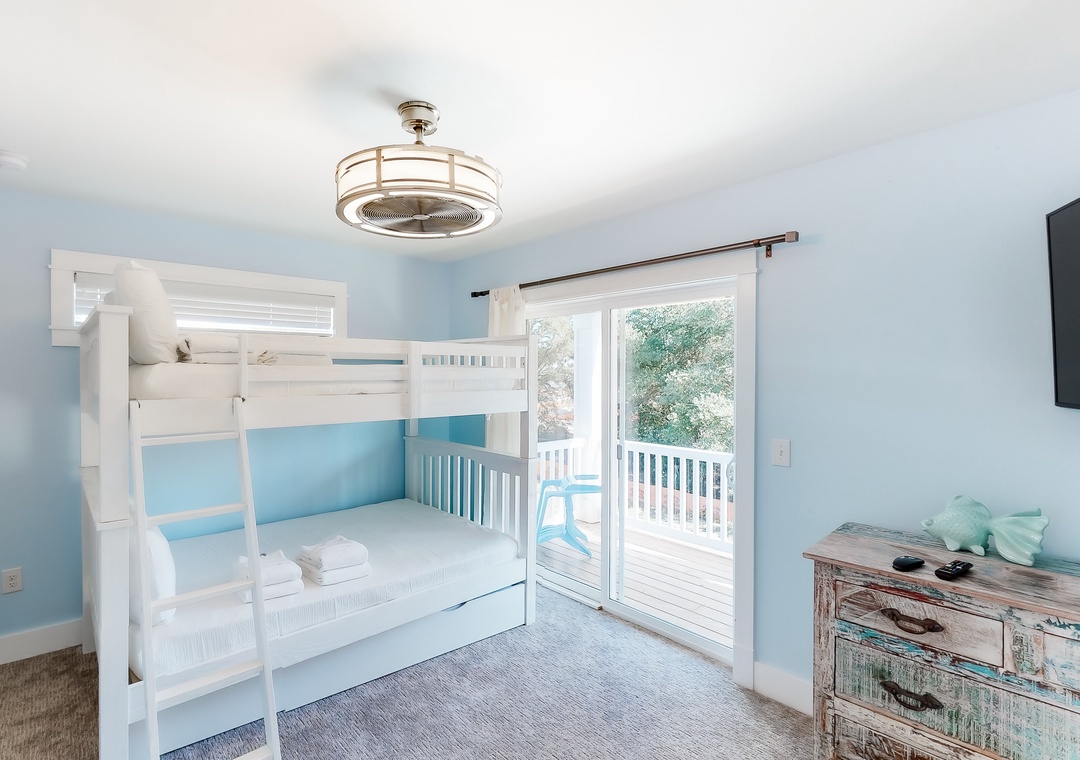 Mid Level: This level features three master suites and a laundry room. Suite 1 has a King bed, TV, custom bath with shower, and a private deck. Suite 2 has two twin beds, TV, bath with tub & shower, and a private deck. The children’s suite has a full over full bunk bed with a twin trundle, a single chair sleeper (no linens for chair sleeper), bath with shower, TV, and a private deck.