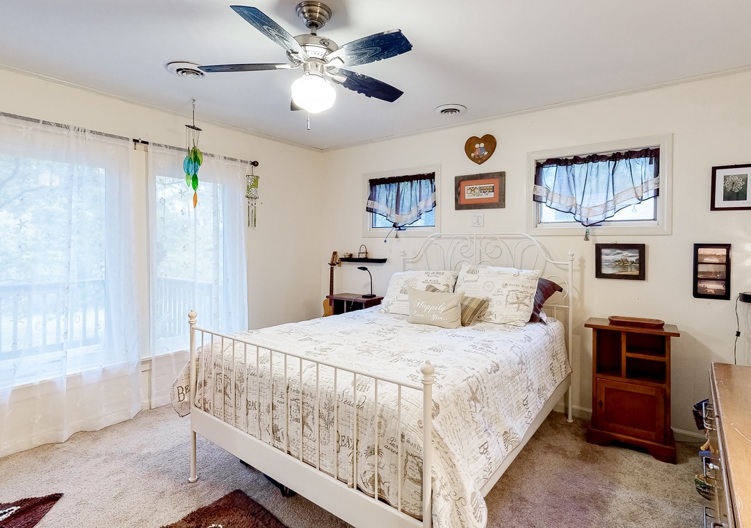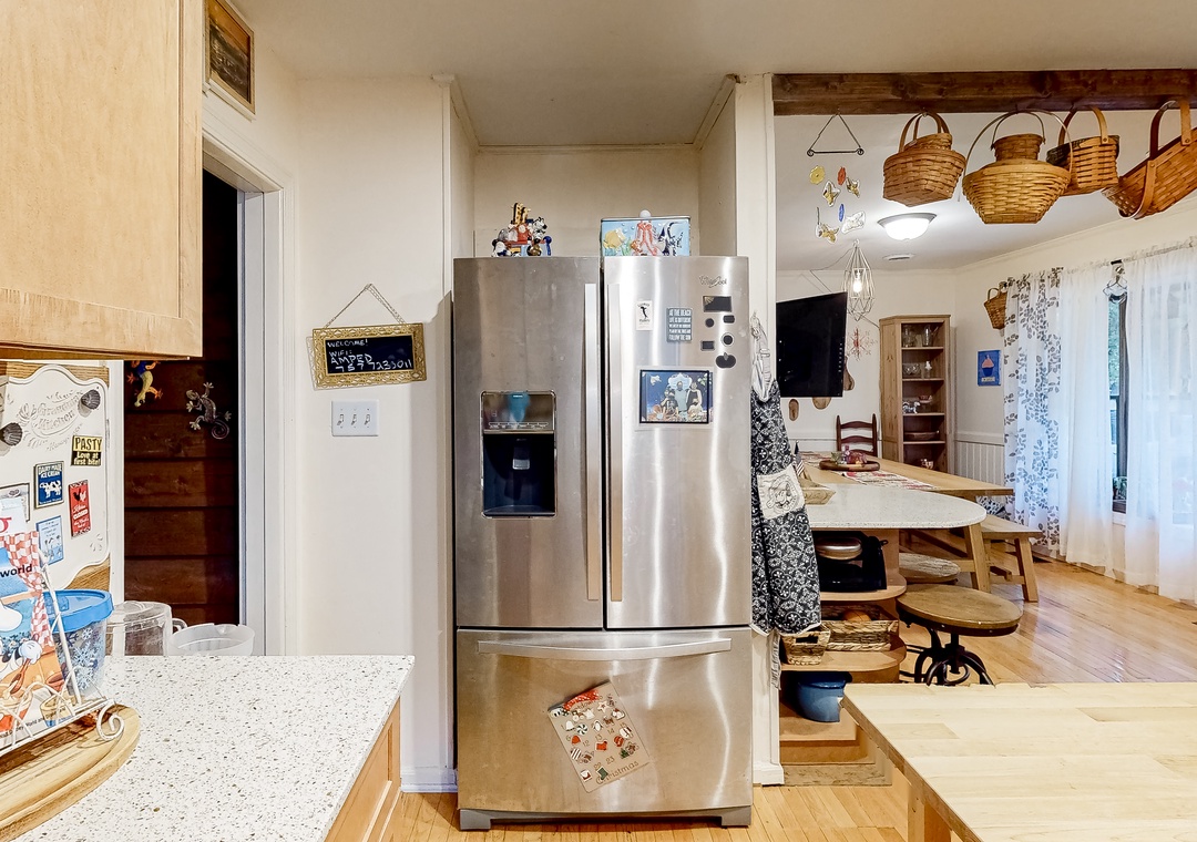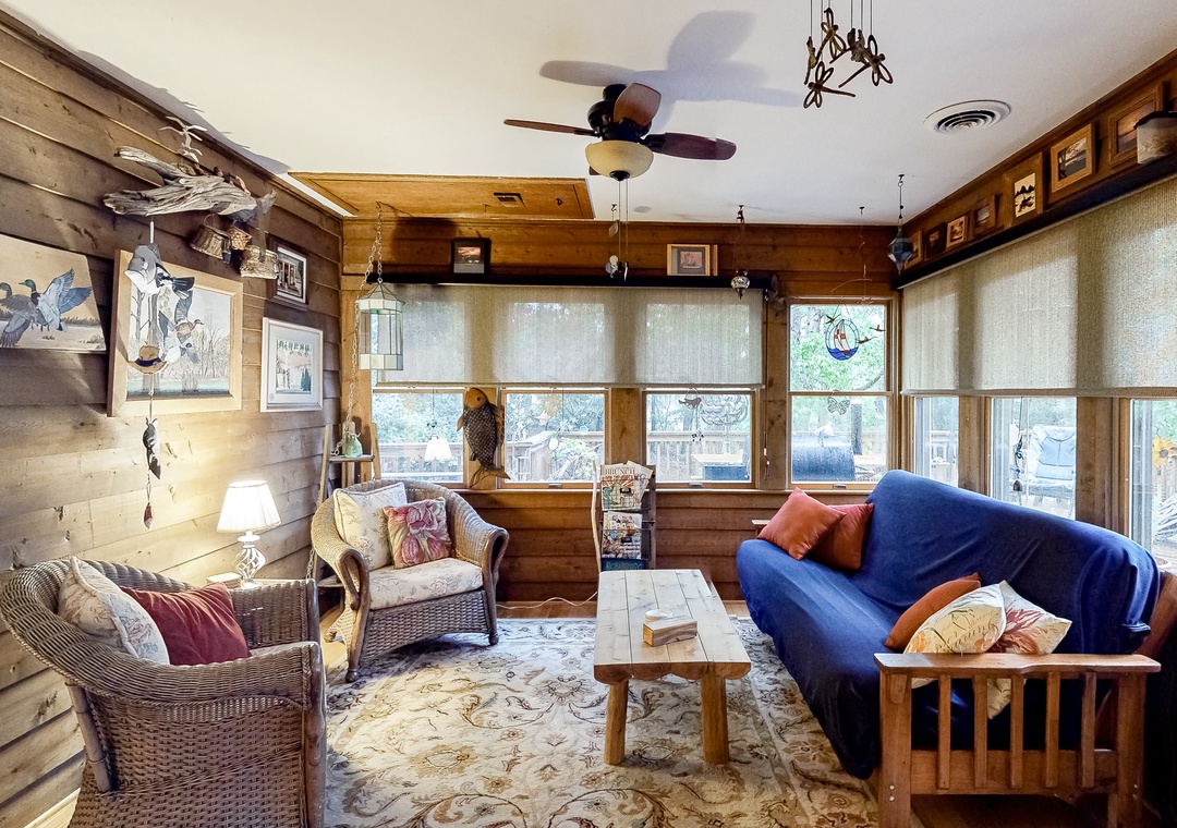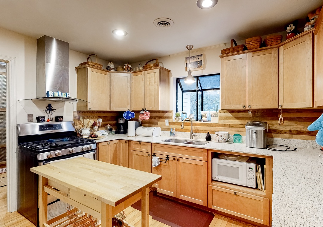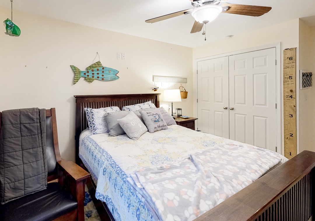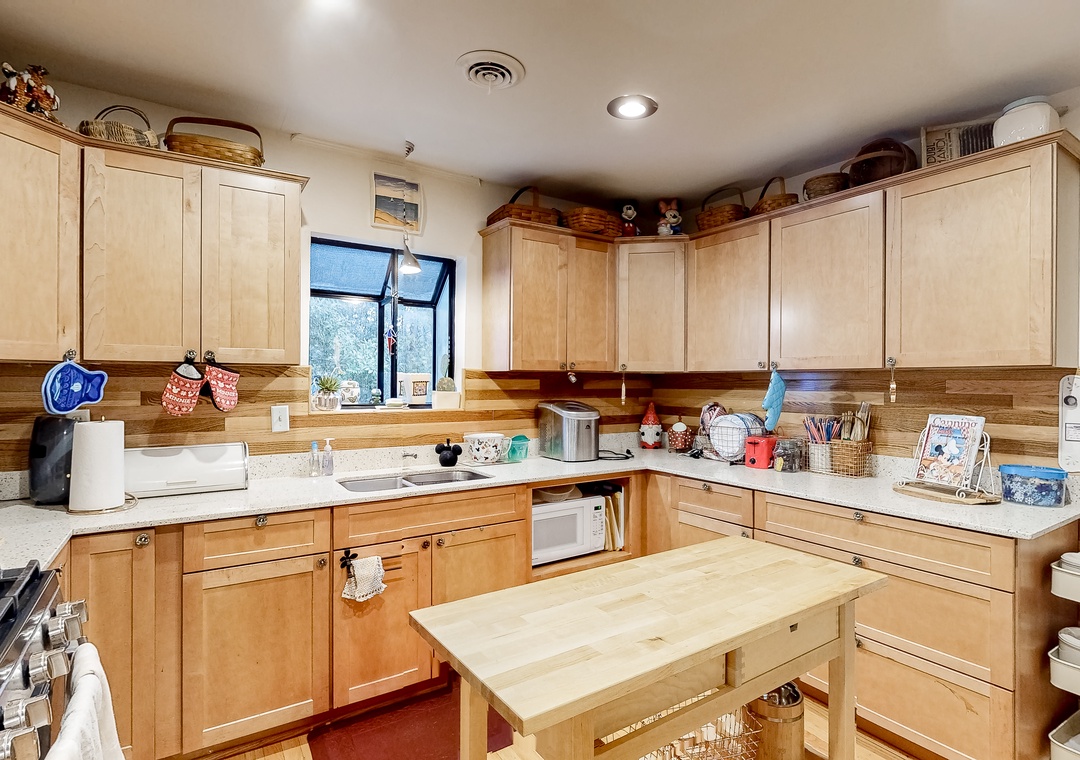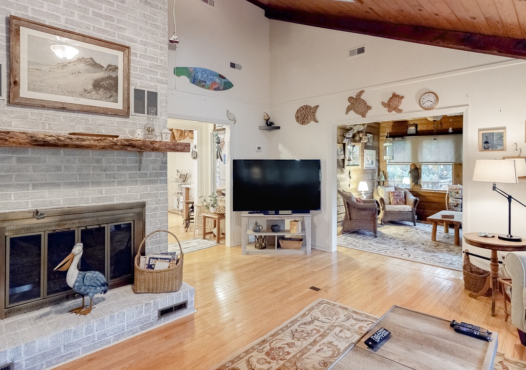 Inside, everyone can spread out with ease in the single-story layout. The living area features vaulted ceilings, a fireplace, plush furnishings, and a mounted flatscreen TV with streaming capabilities, so kicking back for a ballgame with the whole gang will be a breeze. Step into the full kitchen when hunger strikes and whip up anything from a snack to a four-course meal on modern appliances. The adjacent dining area has plenty of room for everyone to gather for formal meals and game nights, yet there will be no better place to end the day than outside under starry skies.