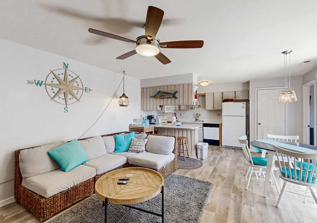 It's all about sand, world class fishing, golfing, and soothing sea breezes here at this charming, nautical-themed home close to shopping, restaurants, and of course, the beach! Perfect for a small family, this ground-floor getaway boasts a well-equipped, full kitchen with a breakfast bar for two, a dining table for mealtimes or game nights, and a cozy living area with a wall-mounted, flatscreen TV and Roku for streaming all your favorite channels. Just outside, relax on your furnished patio and fire up the gas grill for perfect summertime cookouts. And though you may not want to leave the comforts of this adorable oasis, be sure to take advantage of the shared, seasonal pool, tennis/basketball court, and kids play area with swing set/slide, picnic tables, and charcoal grill, all on-site. The fireplace located on the property is not for use.