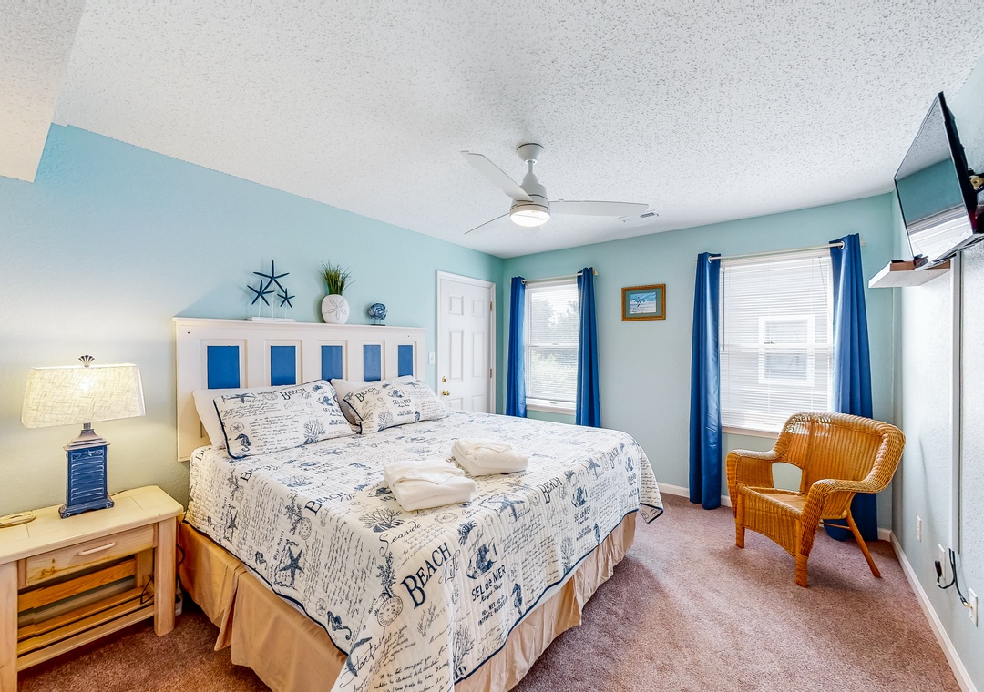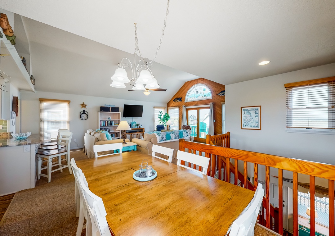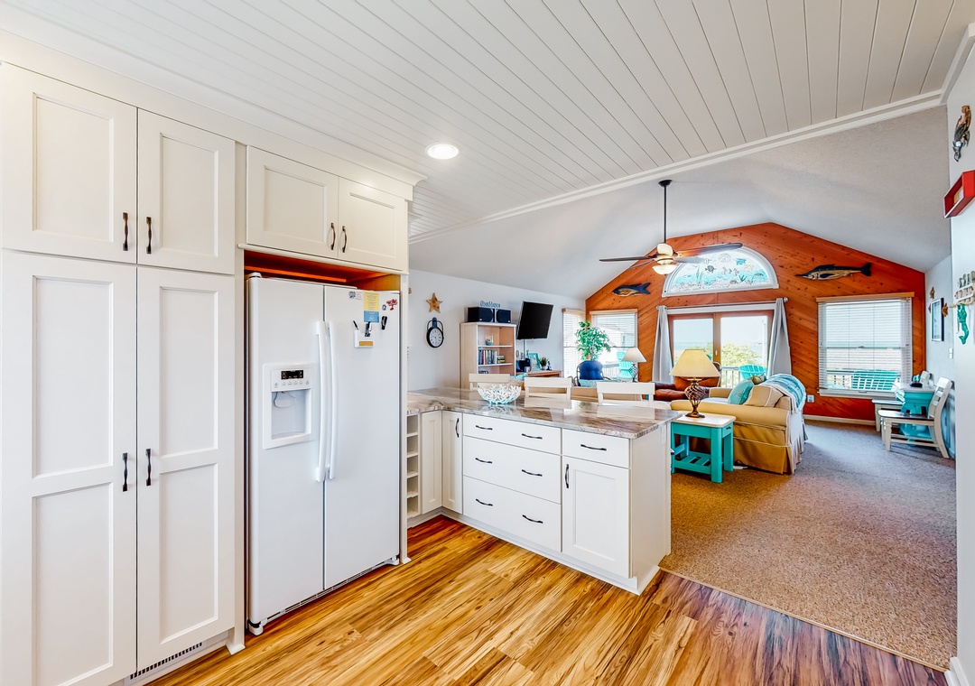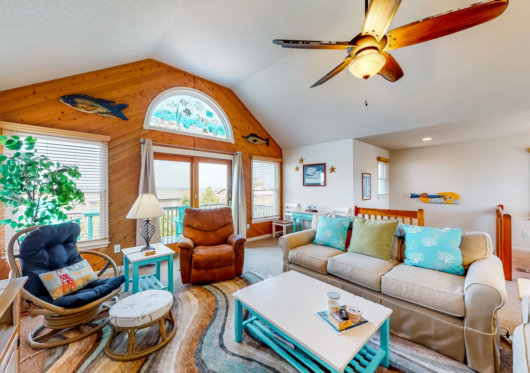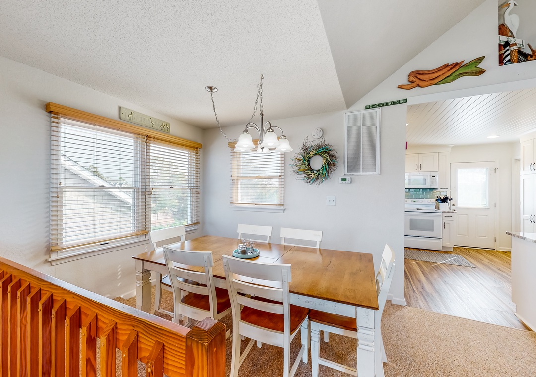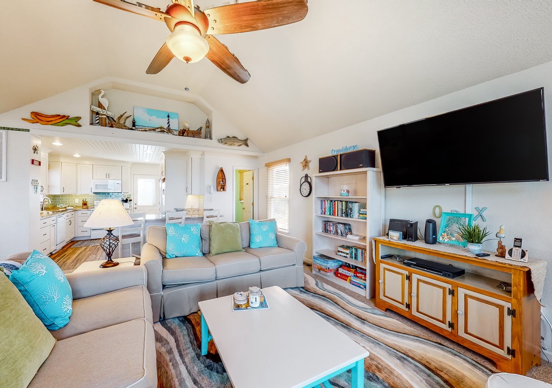 Inside, the fun won't end, as everyone will fall in love with the pops of beach-themed decor, vibrant colors, and spacious layout. Hop into the full kitchen when everyone works up an appetite, and gather for meals at the dining table or outside as you look out to the calm waters of the sound. Don't worry about being disconnected either because the free WiFi will keep everyone entertained and up to date with emails or remote work if need be.