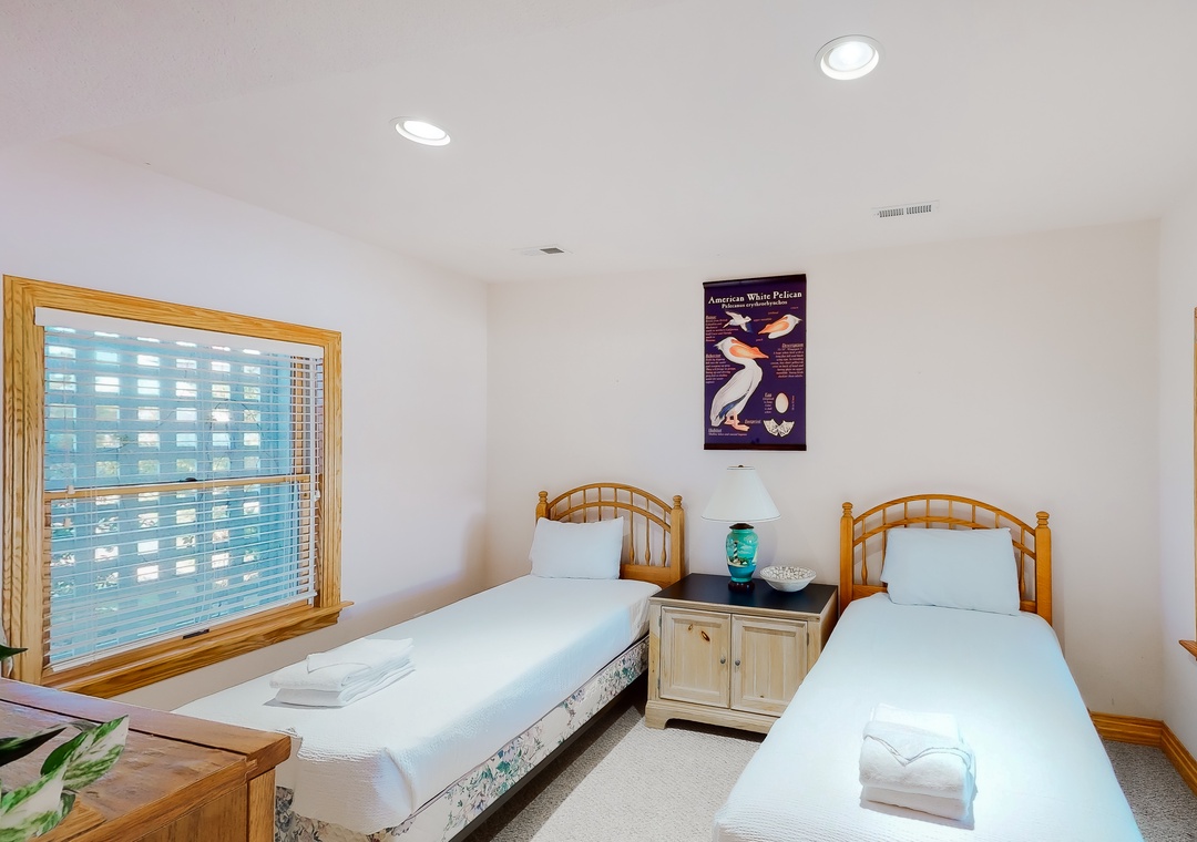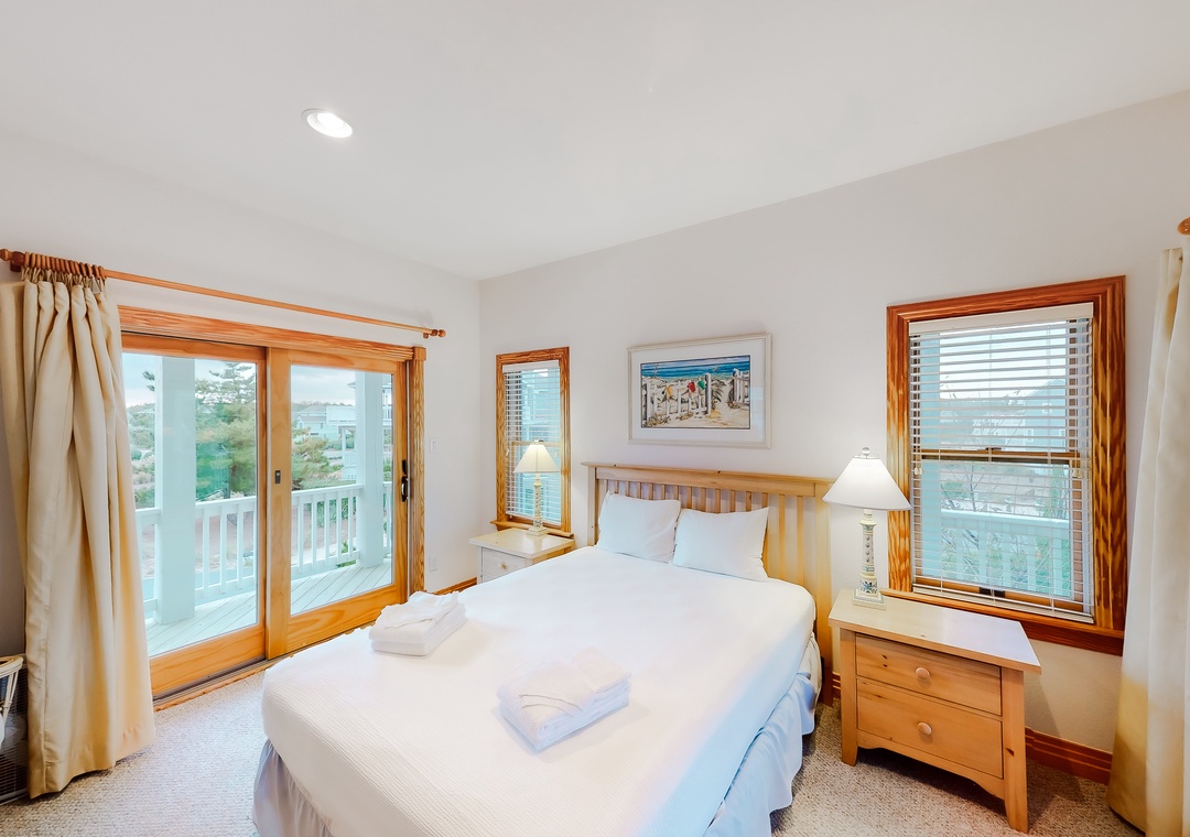 The ground level features a lovely den with a TV, a double sofa bed, and a room with two singles and a full bath. On the main level, you will find a comfortable sitting room, a main bedroom with a beautiful custom-tiled shower, a room with a queen bed, and a room with Duobunk. There also is a full bath. The top level boasts a dining area with great lighthouse and sunset views and an artistically painted kitchen with granite countertops that enhance the experience. There also is a king main bedroom and a half bath. On-site amenities include a private unheated pool, a hot tub, three TVs, two DVDs, a central stereo, outside speakers by the pool and hot tub, video and books, and beach access 460 yards away.