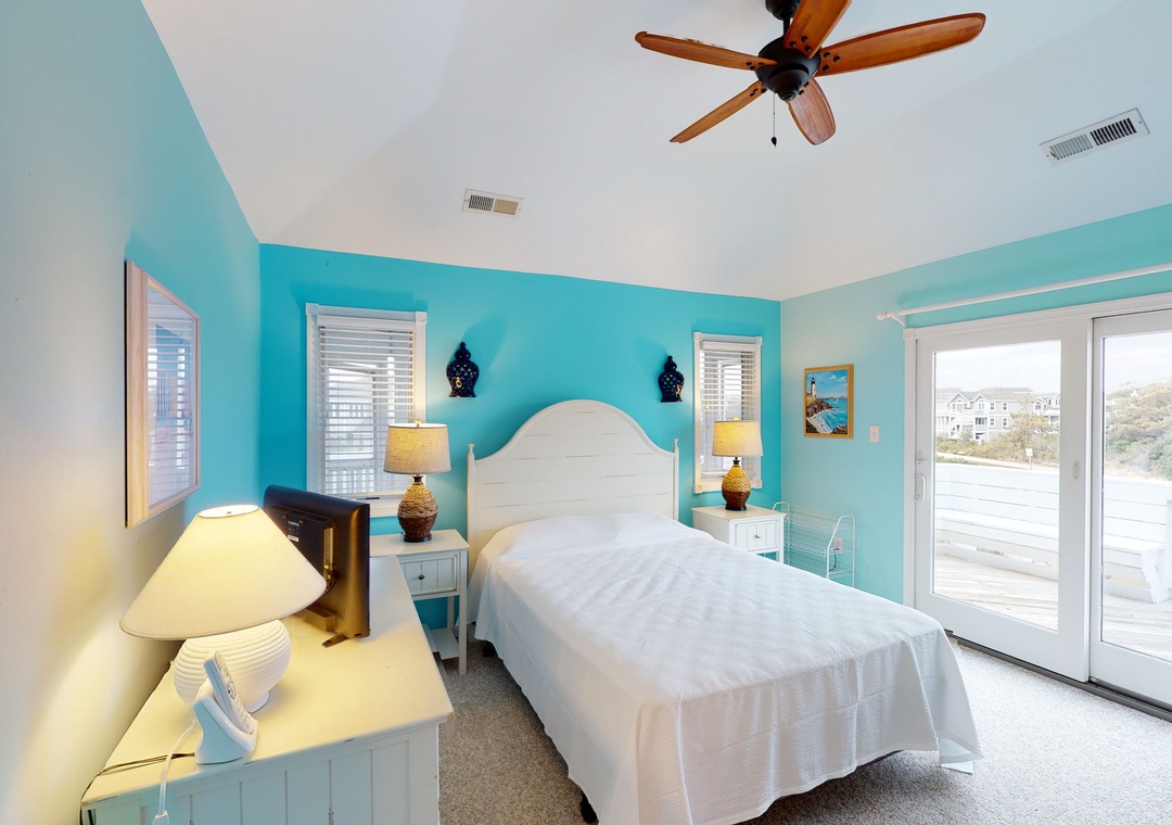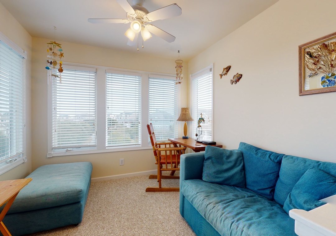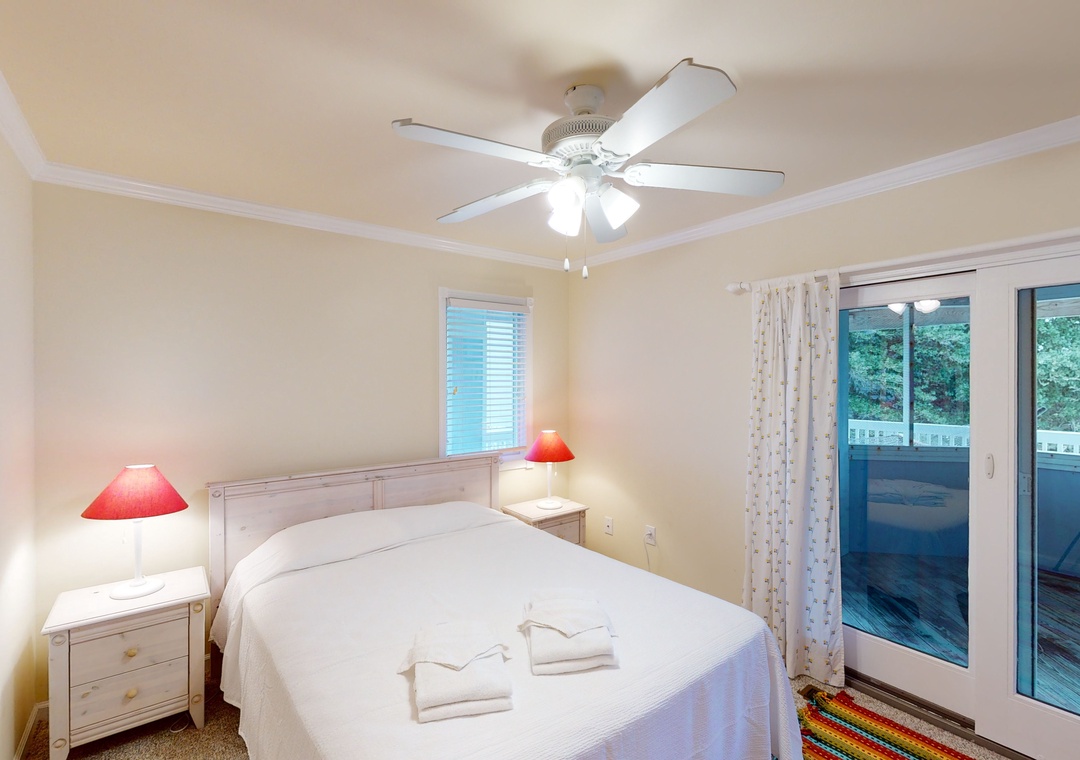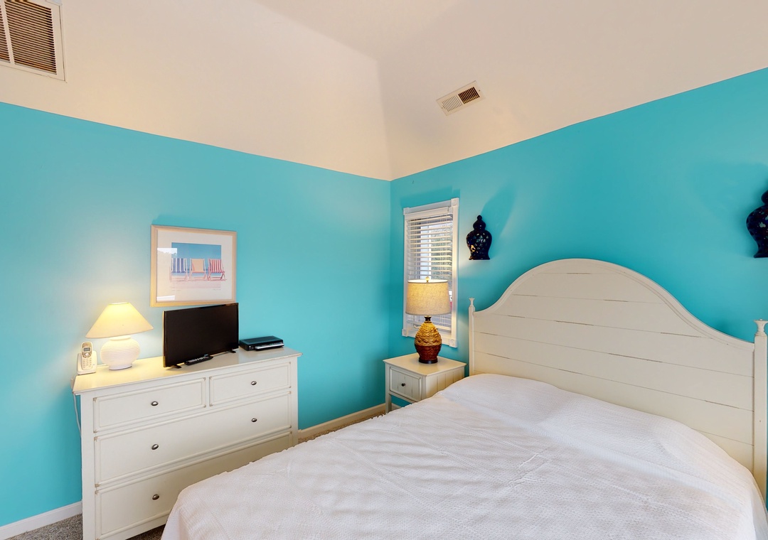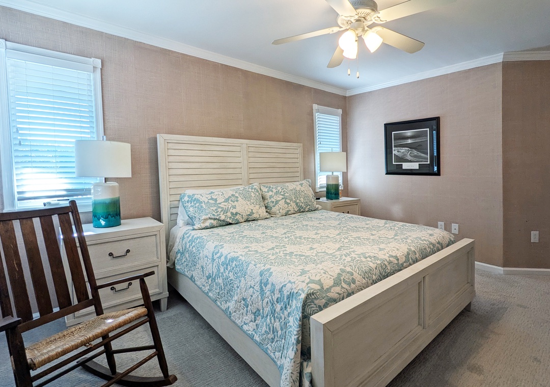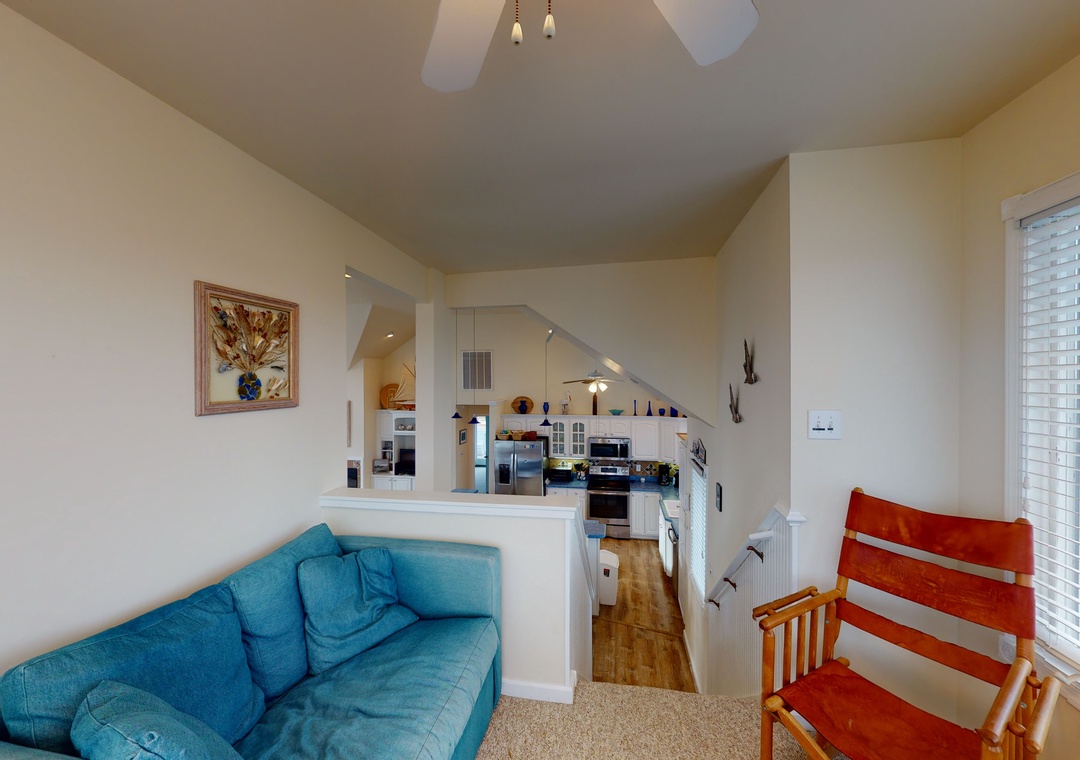 Make your way to the top level and you will find a nicely decorated great room with a TV, DVD player, stereo, gas fireplace, and access to the decks through sliding glass doors. Just off the great room, on the west side of the house, is another screened porch perfect for those family crab feasts! The kitchen is well equipped and the dining area offers a wooden table that seats guests, with seating for more at the kitchen bar. A half bath is located just off the great room as well as a loft for getting away from it all. Rounding out this floor is a lovely primary bedroom with a TV and deck access.