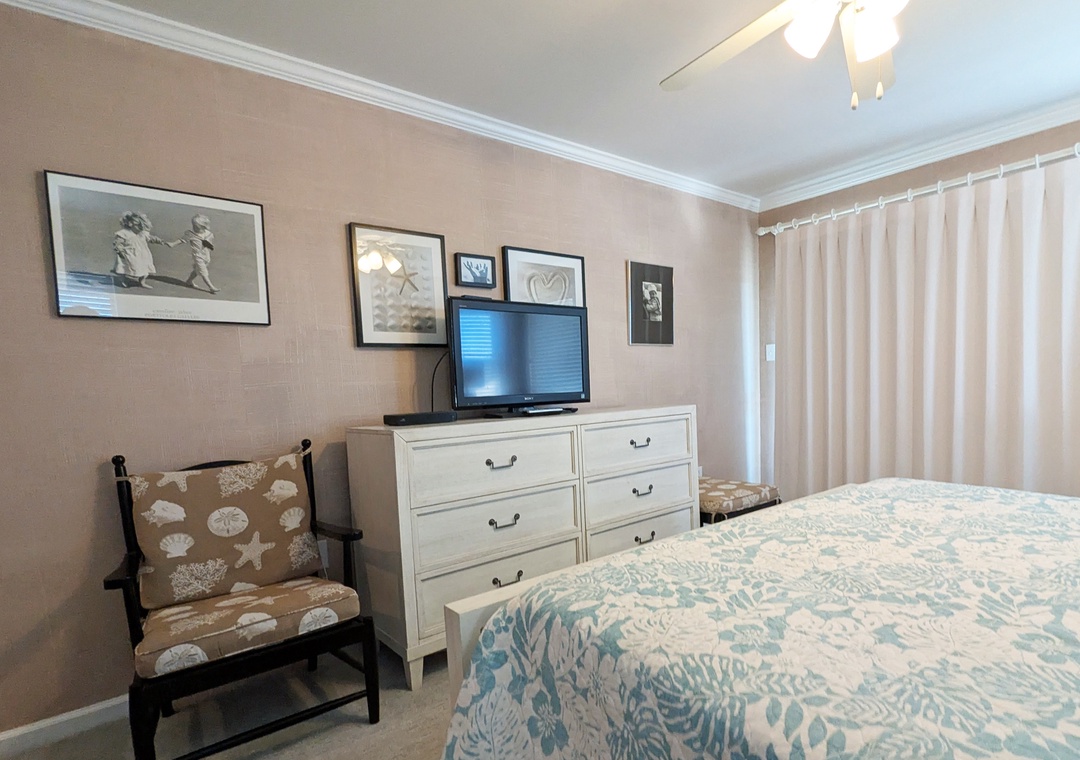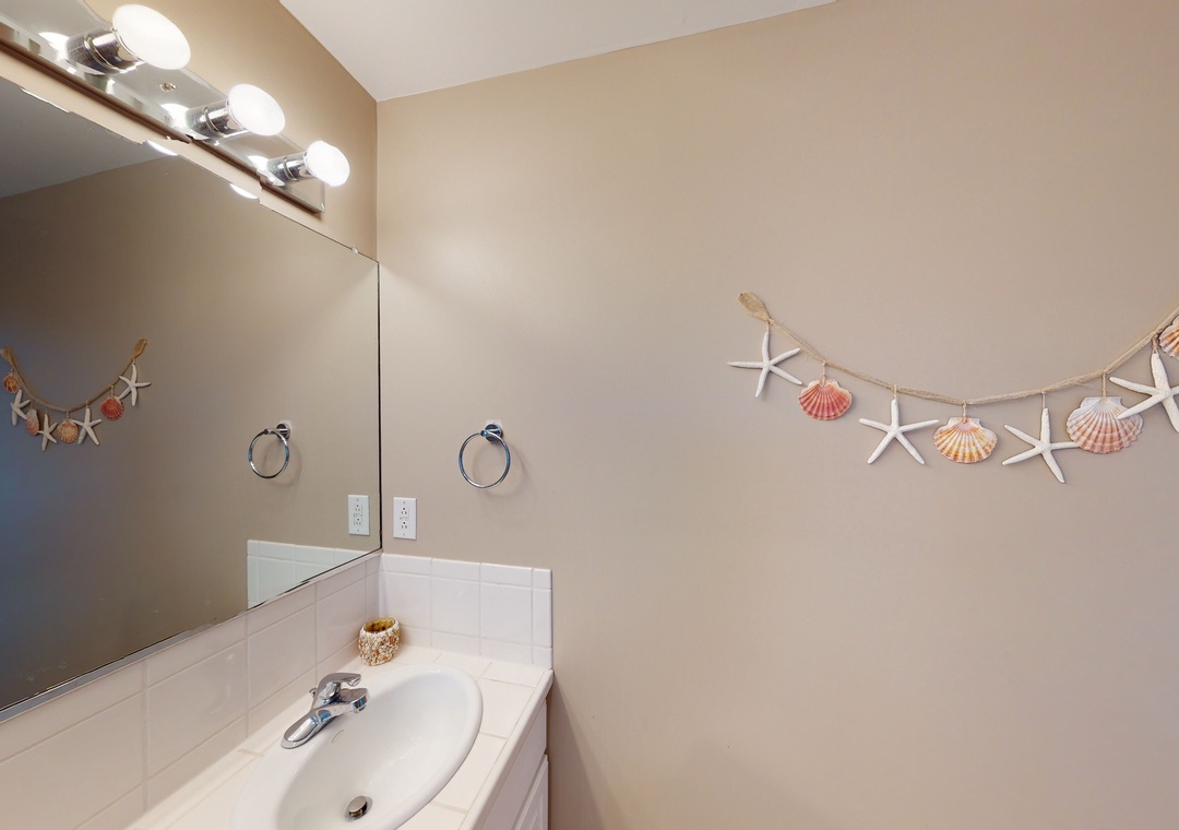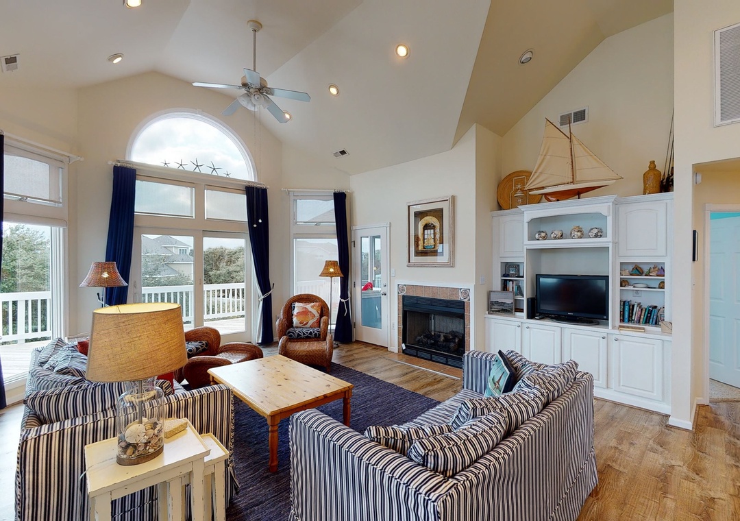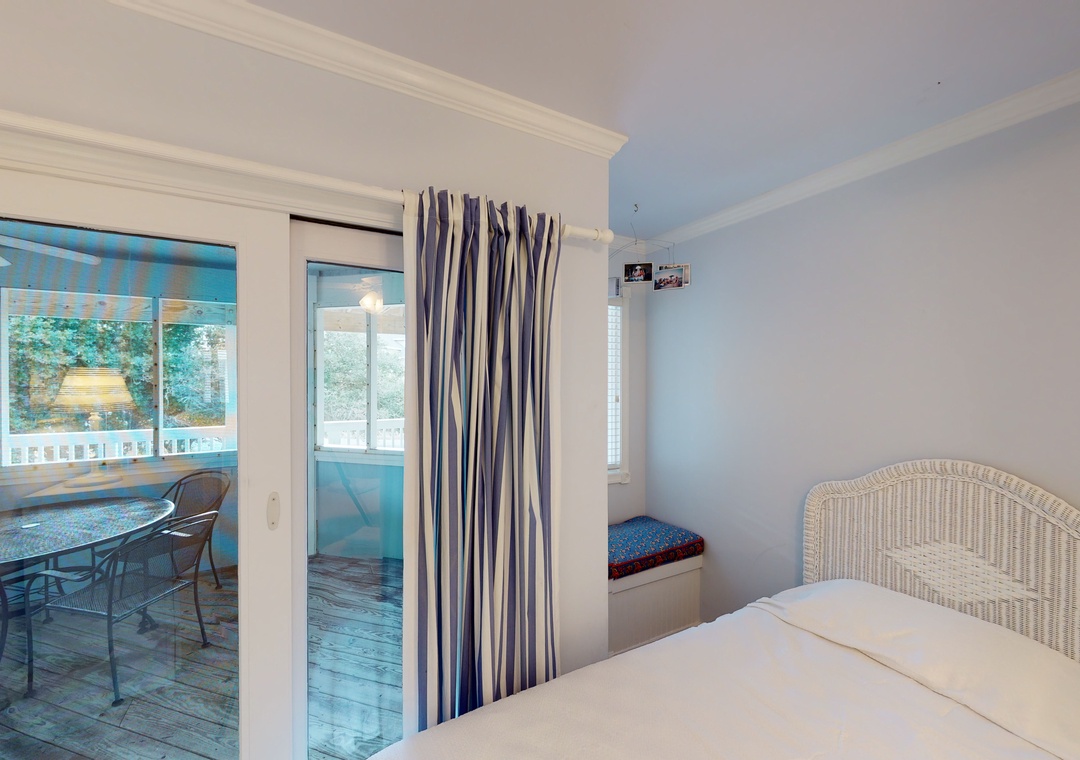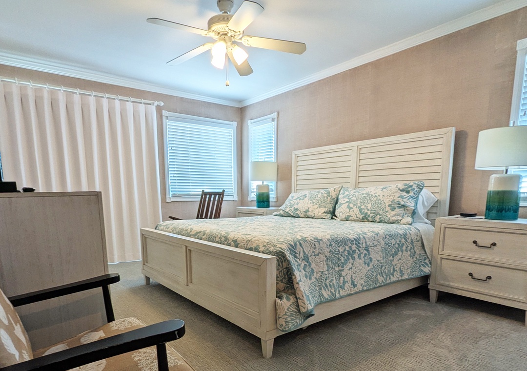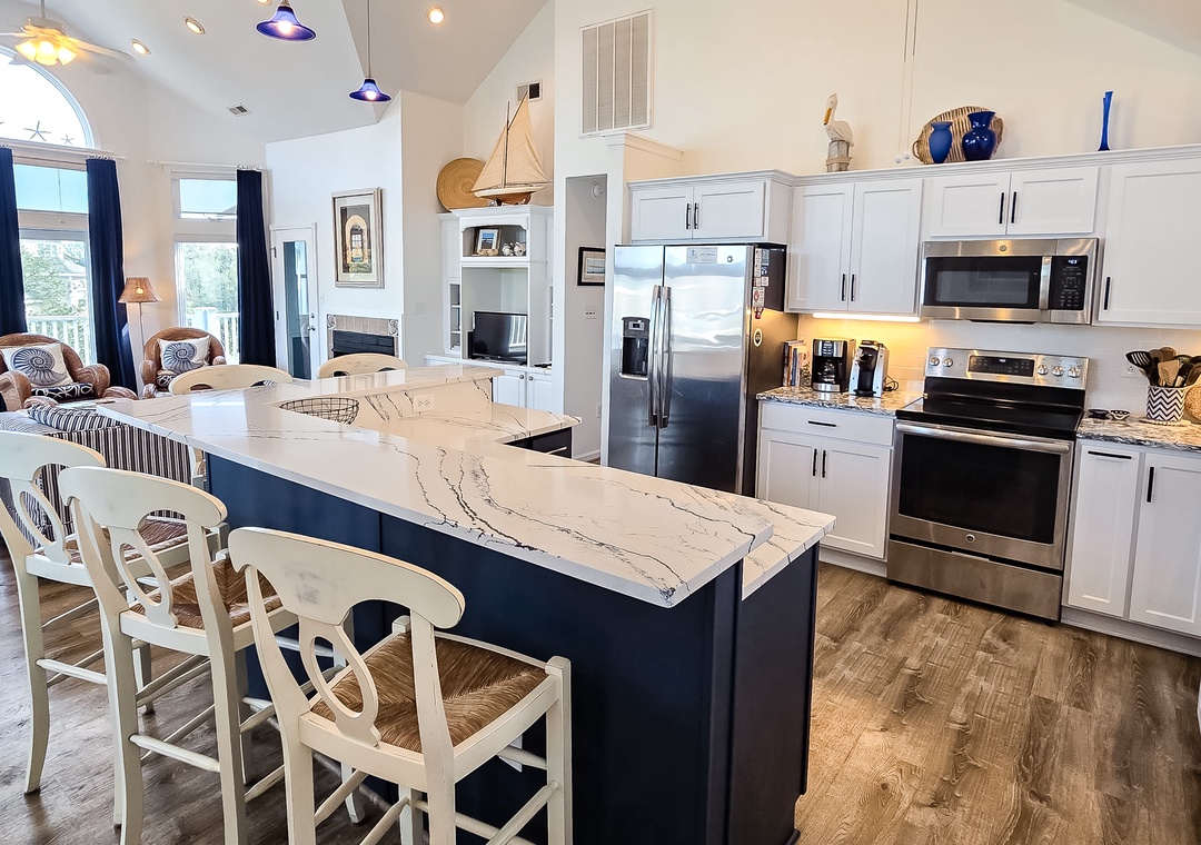 Make your way to the top level and you will find a nicely decorated great room with a TV, DVD player, stereo, gas fireplace, and access to the decks through sliding glass doors. Just off the great room, on the west side of the house, is another screened porch perfect for those family crab feasts! The kitchen is well equipped and the dining area offers a wooden table that seats guests, with seating for more at the kitchen bar. A half bath is located just off the great room as well as a loft for getting away from it all. Rounding out this floor is a lovely primary bedroom with a TV and deck access.