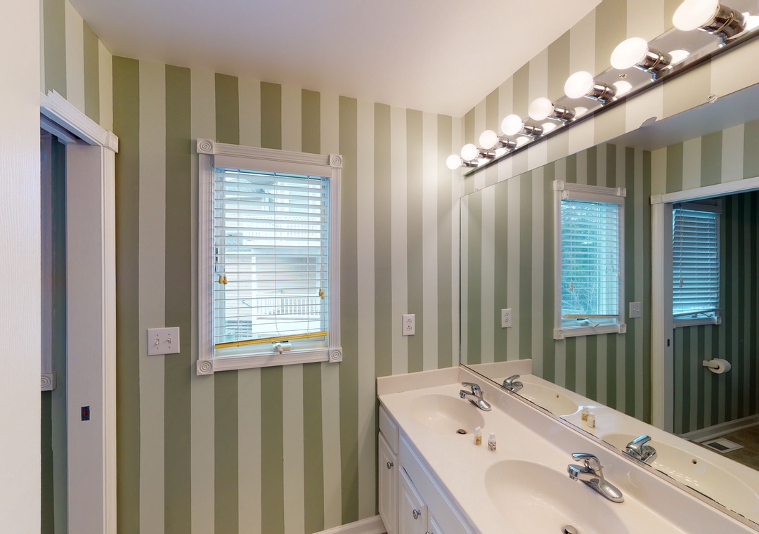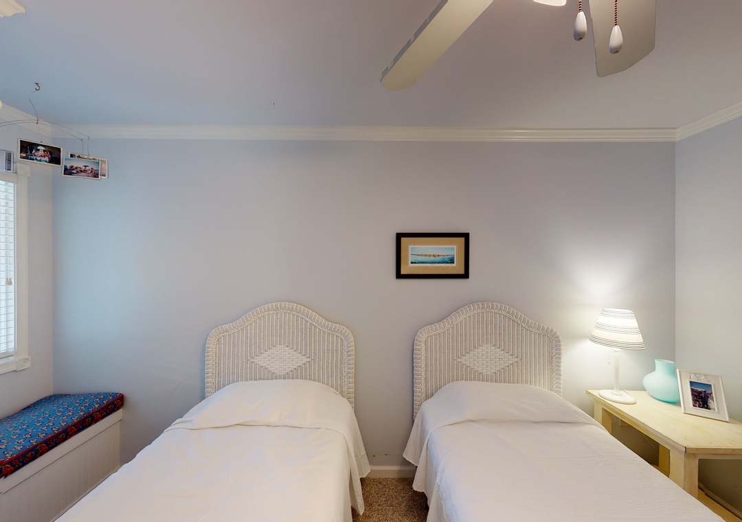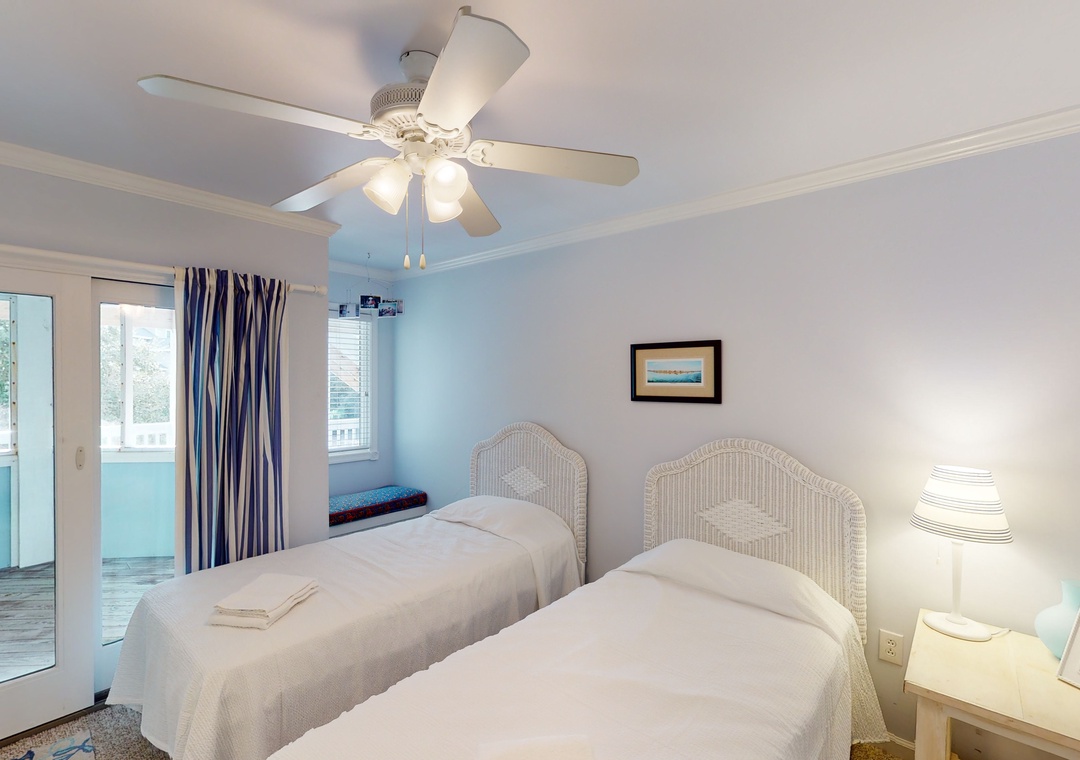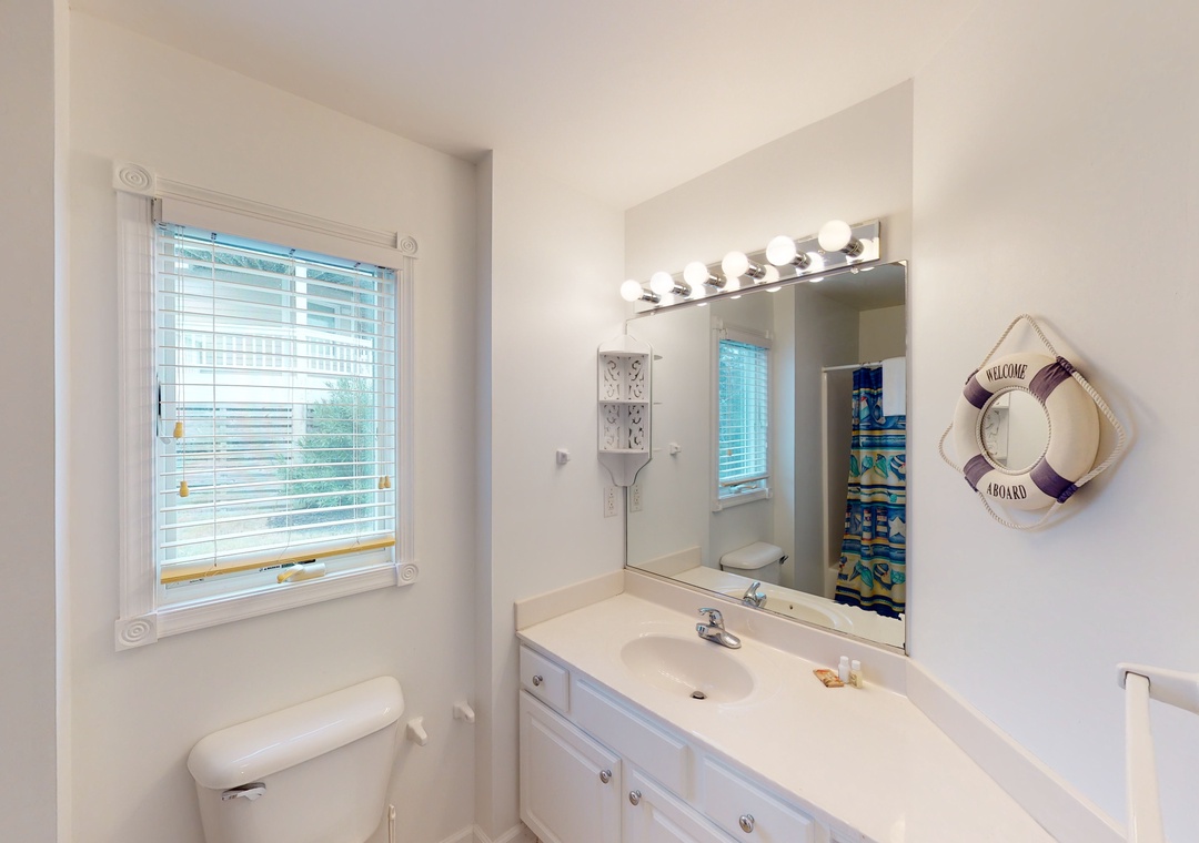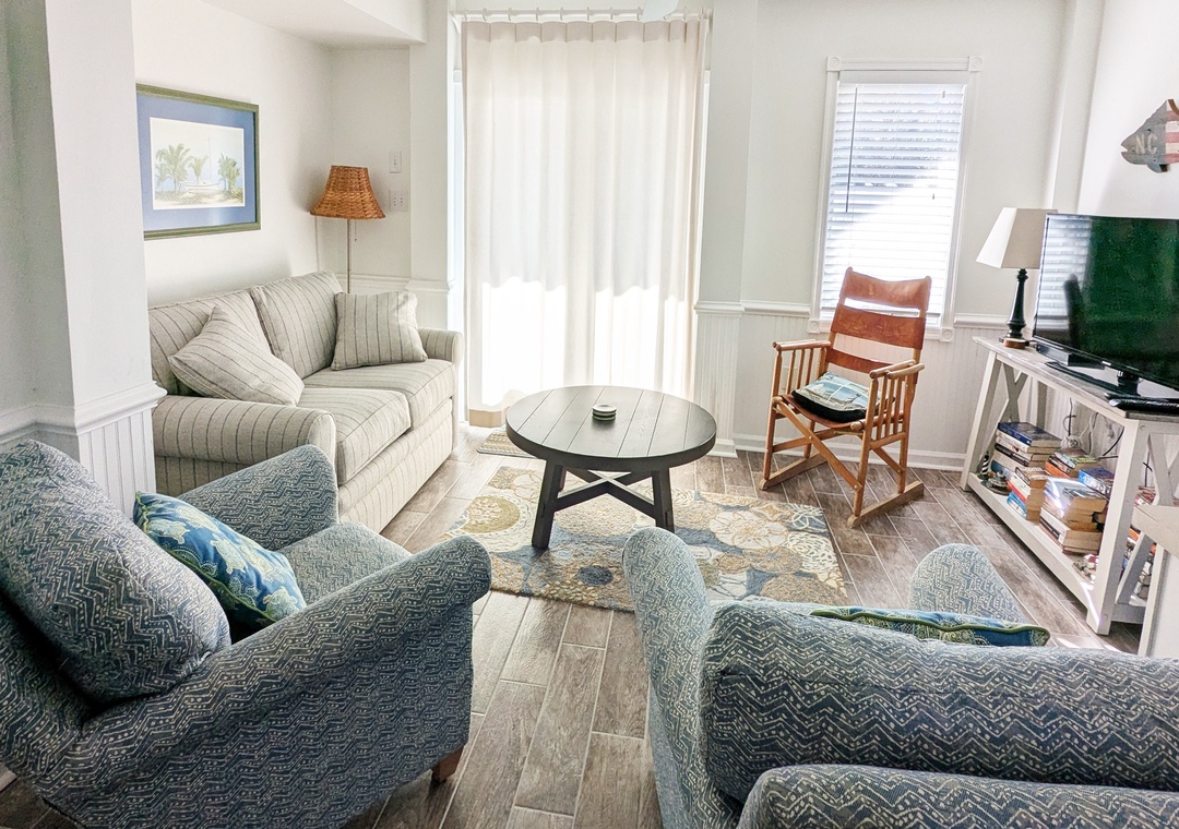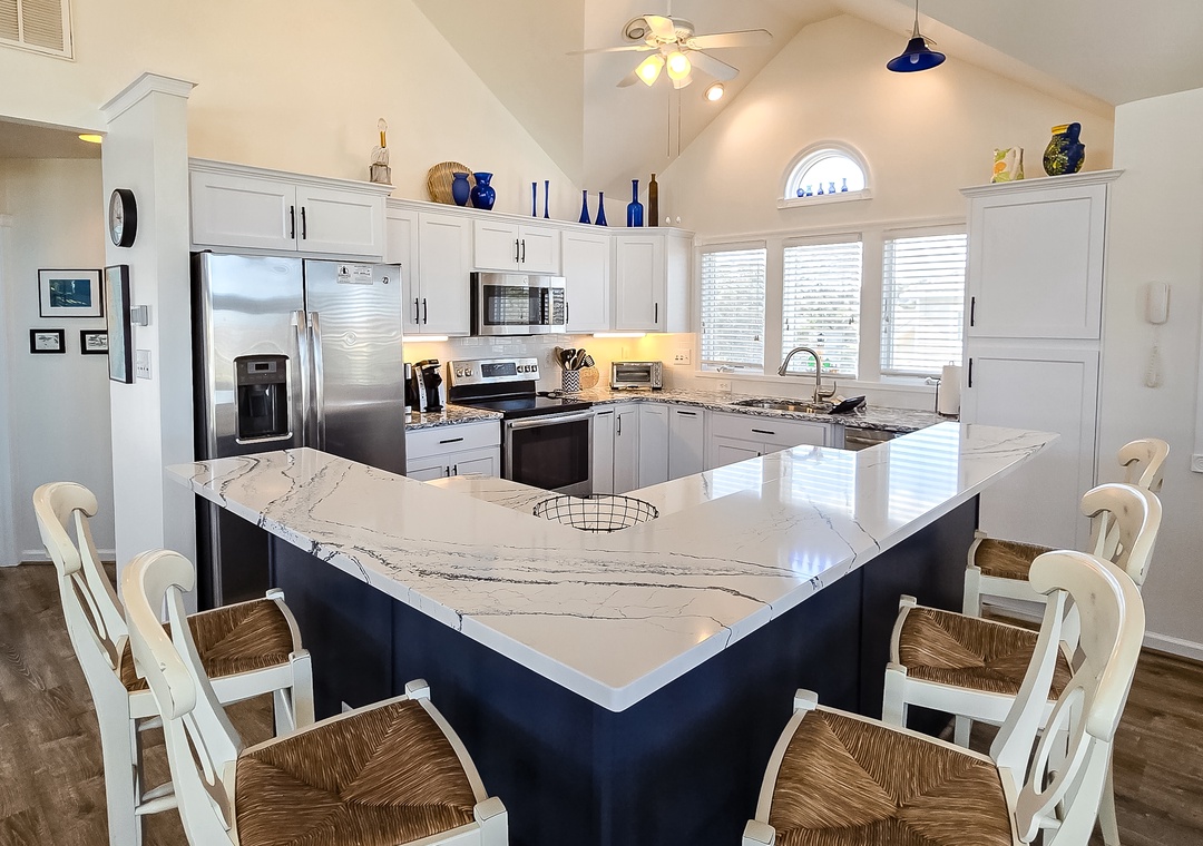 Make your way to the top level and you will find a nicely decorated great room with a TV, DVD player, stereo, gas fireplace, and access to the decks through sliding glass doors. Just off the great room, on the west side of the house, is another screened porch perfect for those family crab feasts! The kitchen is well equipped and the dining area offers a wooden table that seats guests, with seating for more at the kitchen bar. A half bath is located just off the great room as well as a loft for getting away from it all. Rounding out this floor is a lovely primary bedroom with a TV and deck access.