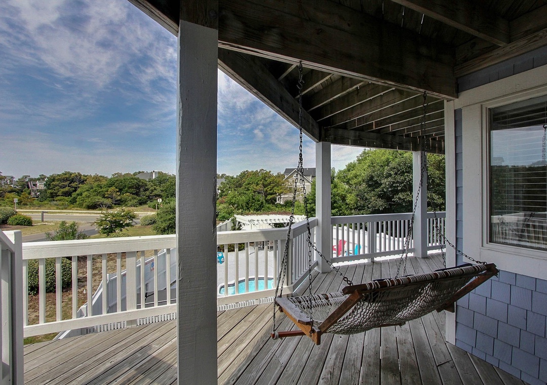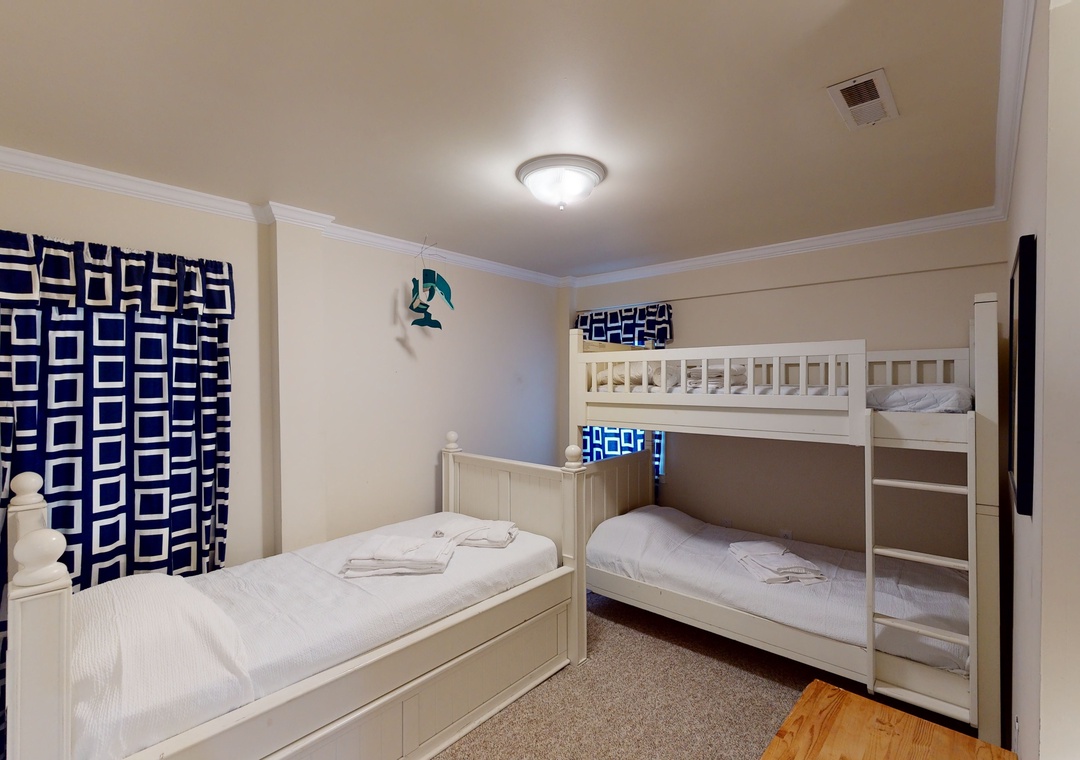 The ground level features a media room with a TV, sofa bed, and club chairs. Guests will enjoy the mini-fridge and wet bar that makes it easy to access from the totally gated private pool and hot tub located just outside the sliding glass door. You will also find a bedroom with a Bunk Set and Twin bed with Trundle and a full bath in the hall. Rounding out this level is the laundry closet. You'll find three bedrooms on the middle level. These rooms also have access to the decks outside through a screened porch. You will love the hammock and hammock swing located on the deck!