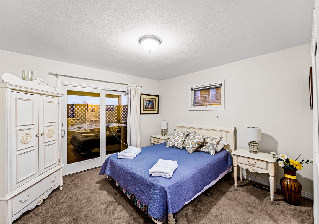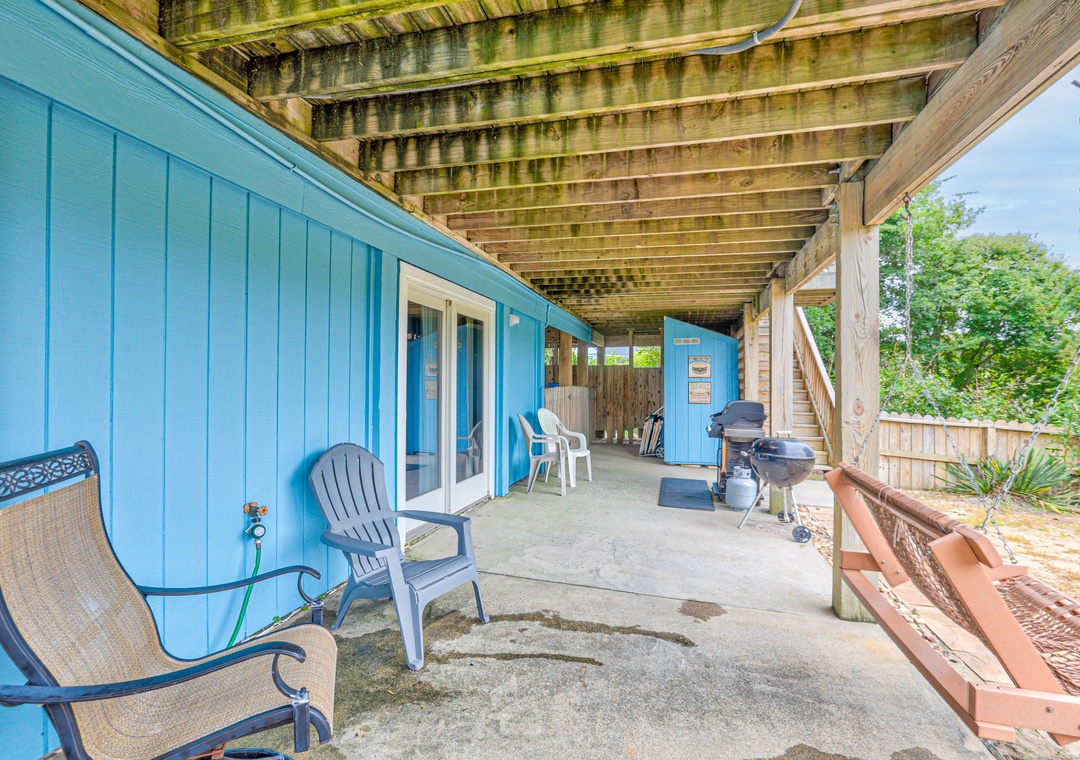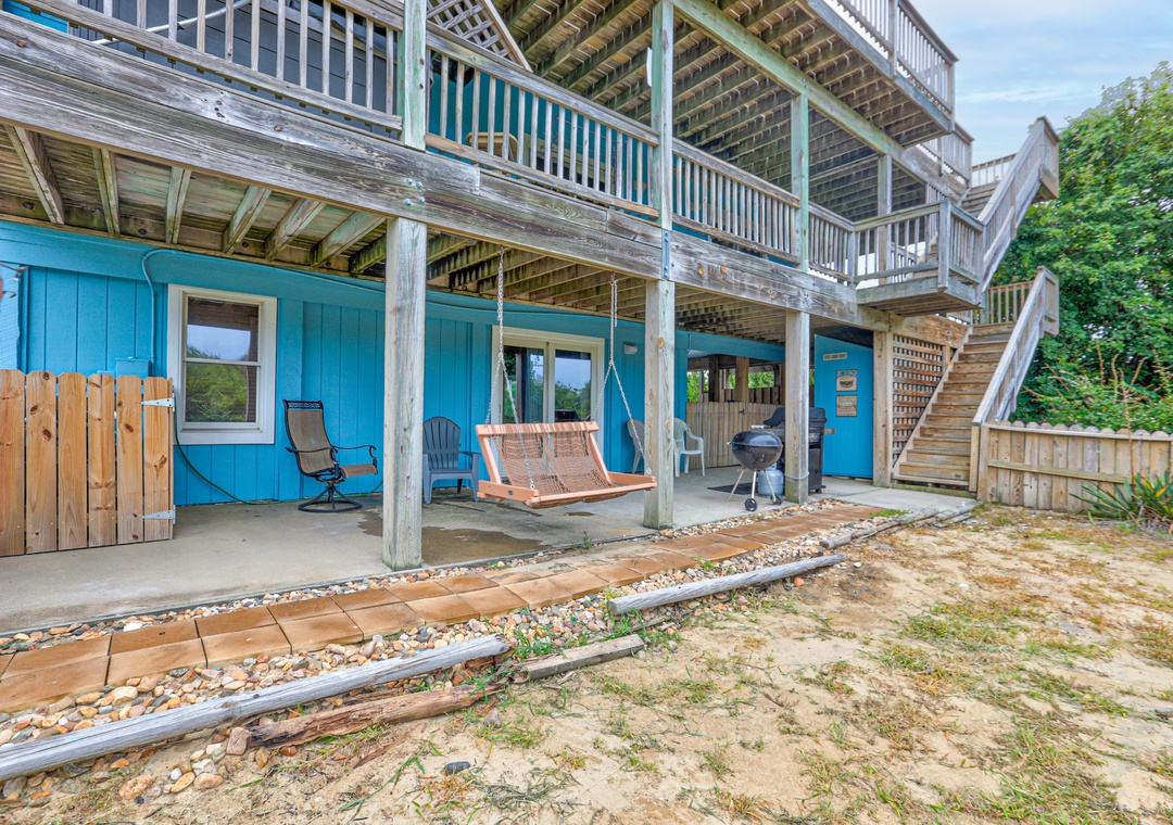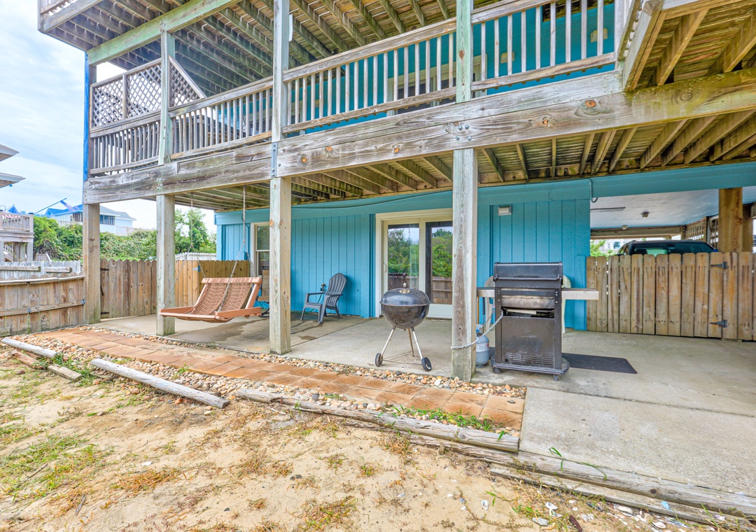Each floor leads out to a separate outdoor area offering both covered and open-air options. A gas grill is equipped for backyard barbecues and there's an outdoor dining table on the pool deck for enjoying alfresco meals.