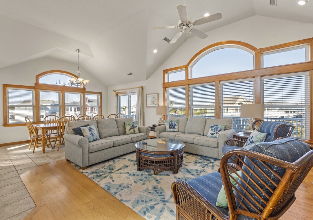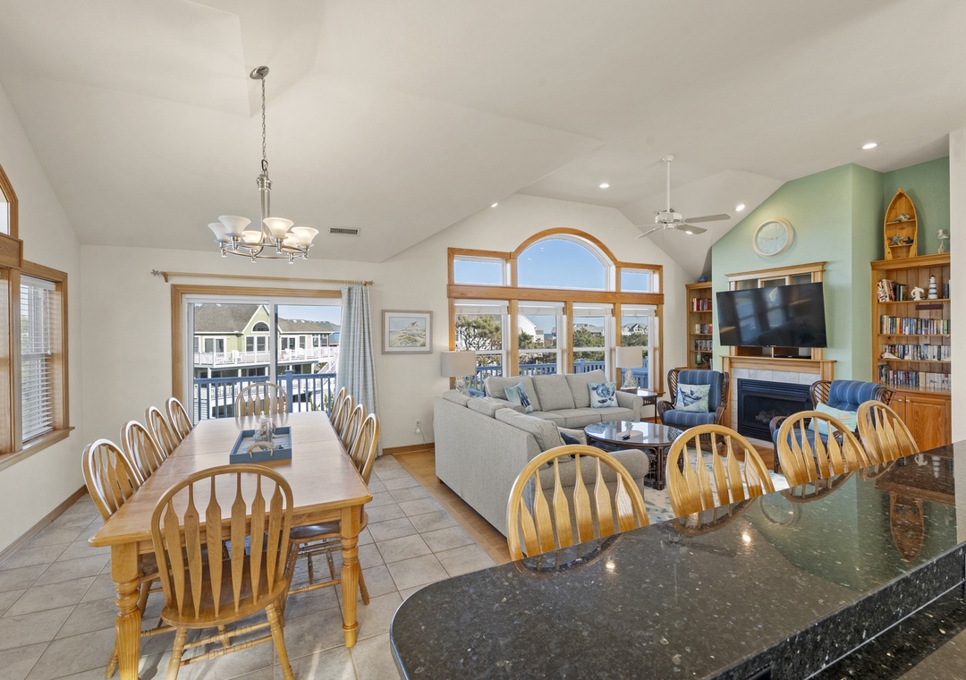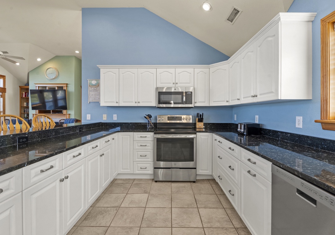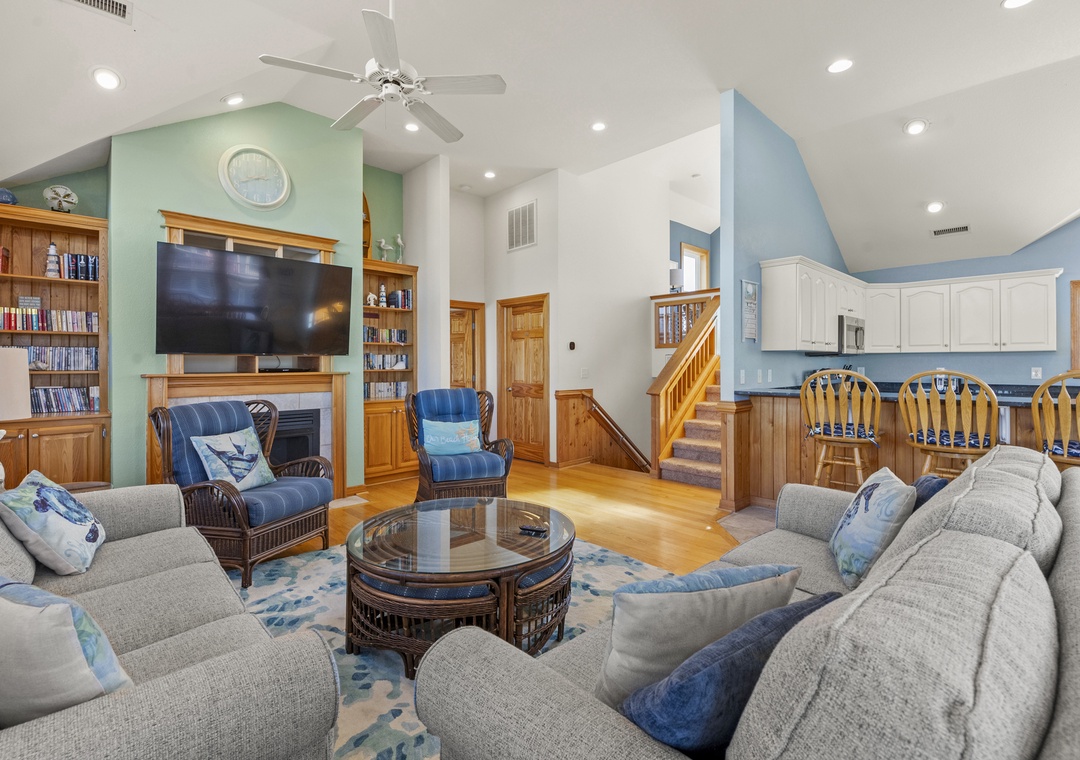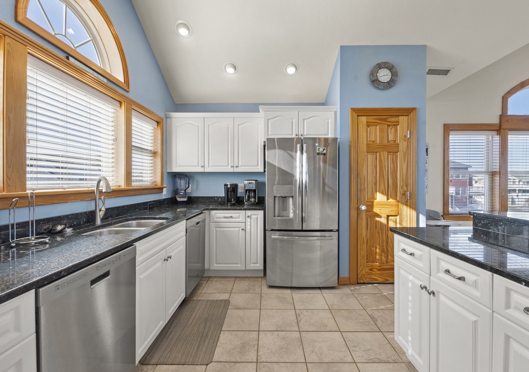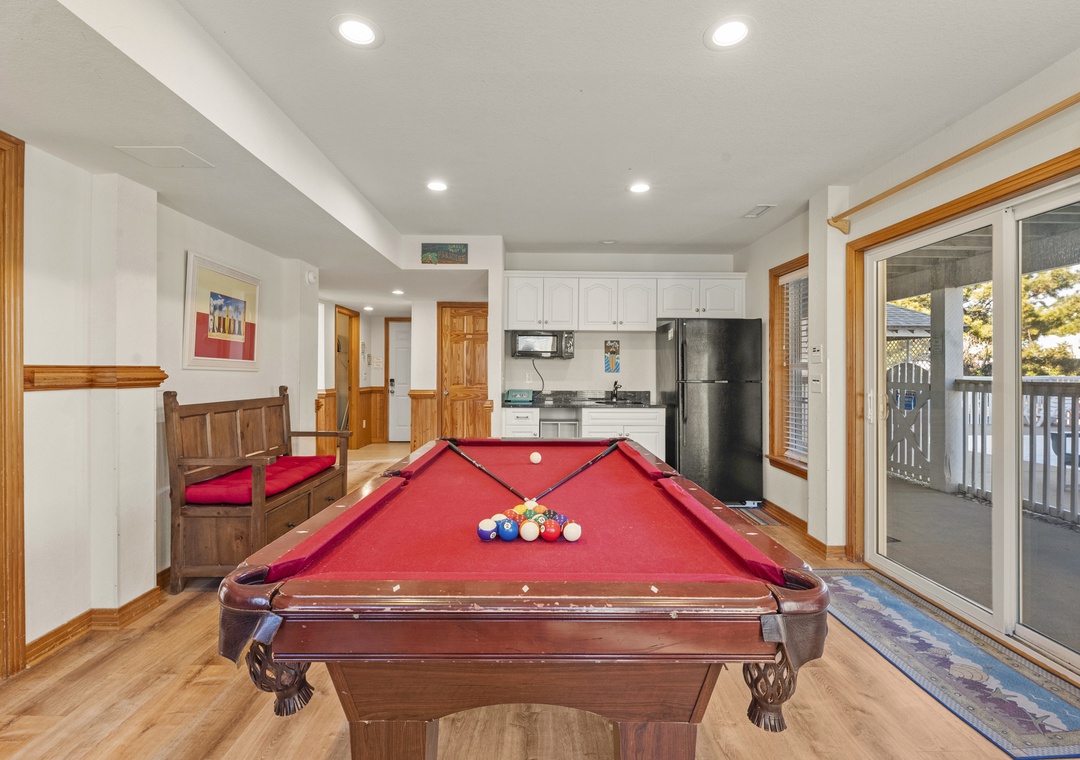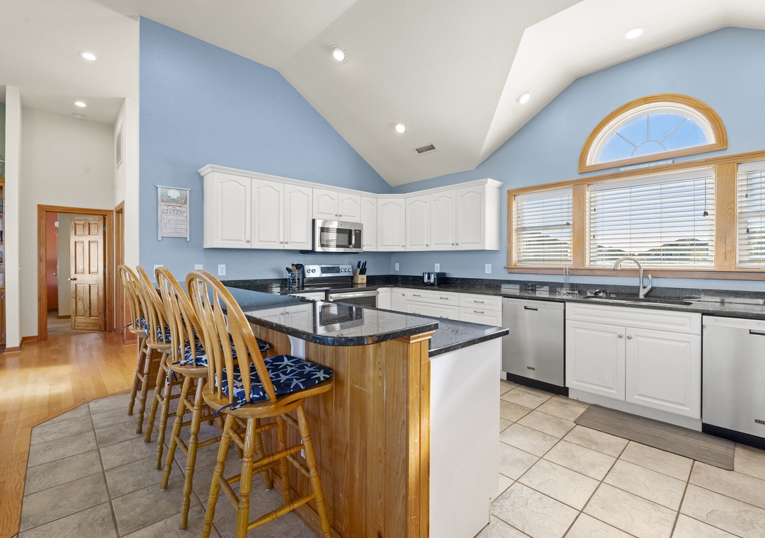 The home's interior is designed for vacation comfort and is made up of seven bedrooms, seven full bathrooms, and two half bathrooms. The game room is furnished for friendly competition and happy hour lounging, featuring a TV, pool table, and a wet bar equipped with a full-size fridge, a blender, a microwave, and a dishwasher. Multiple decks allow for leisurely outdoor gatherings, while separate living rooms offer flexibility for indoor occasions. The kitchen comes equipped with an impressive suite of stainless steel appliances, including double dishwashers for ultimate family meal planning and easy cleanup. A gas grill is equipped on the main-floor deck for cooking up fresh seafood feasts.