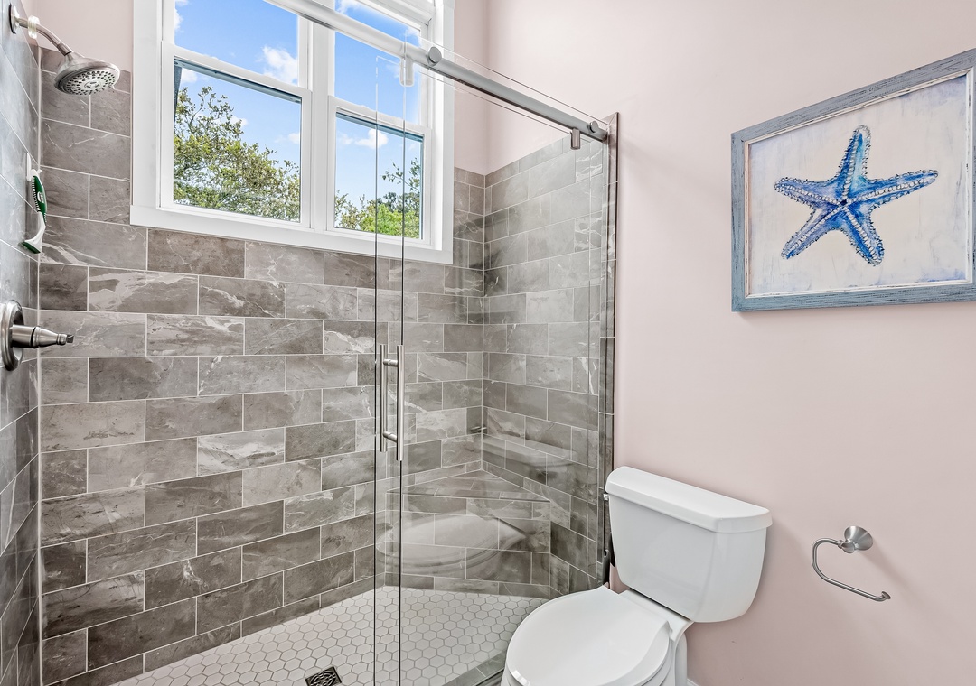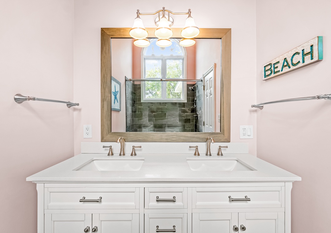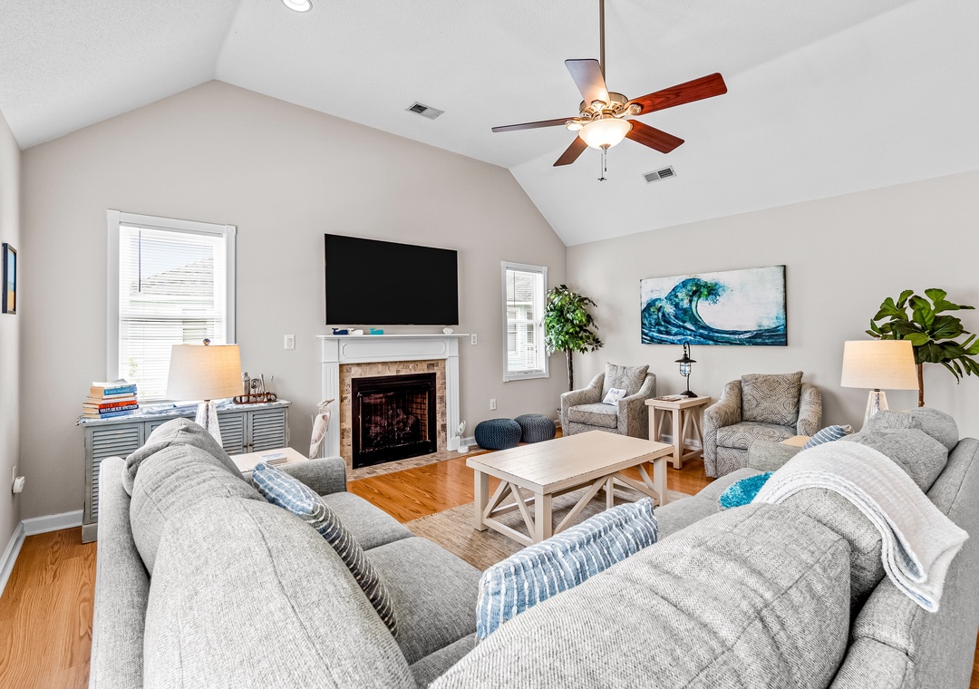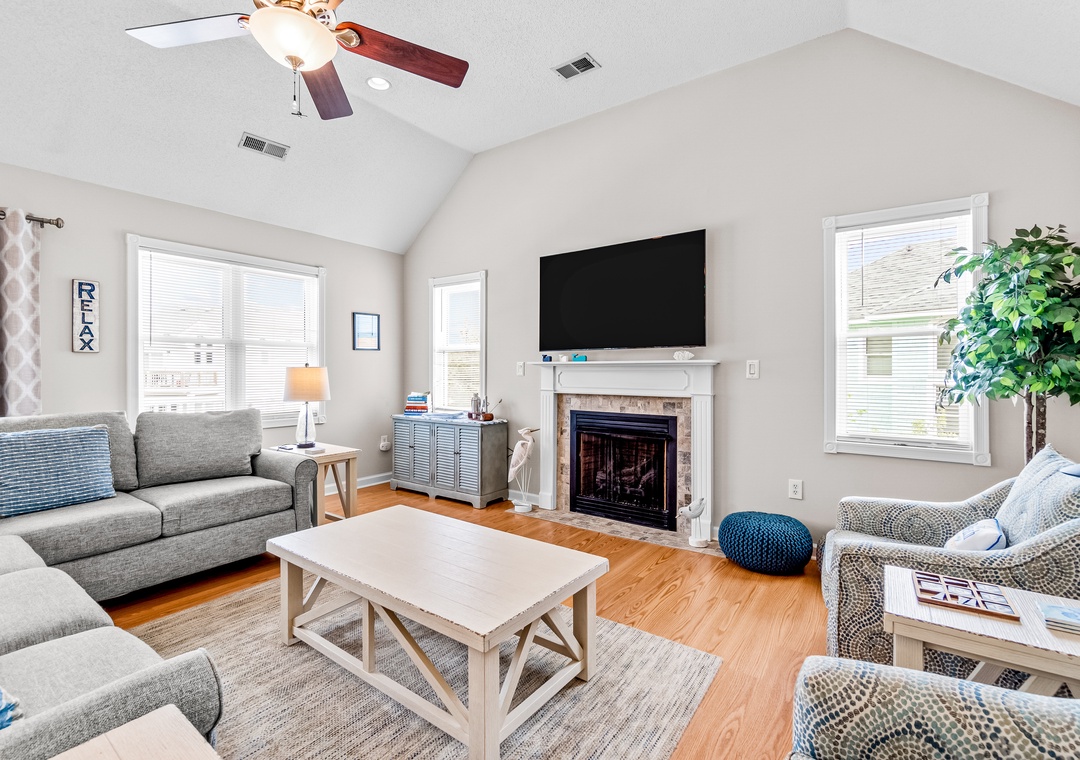 Step inside this tastefully appointed home to find an open-concept living room with a cozy gas fireplace, a modern kitchen with custom stone backsplash and quartz countertops, and a dining area perfect for hosting family gatherings. Relax on the screened porch or spacious sun decks overlooking the private pool area. The top floor also features a primary room en suite with a private deck and dual vanities, offering a serene retreat after a day of beach activities.