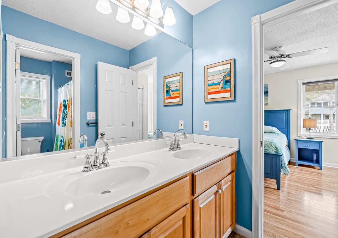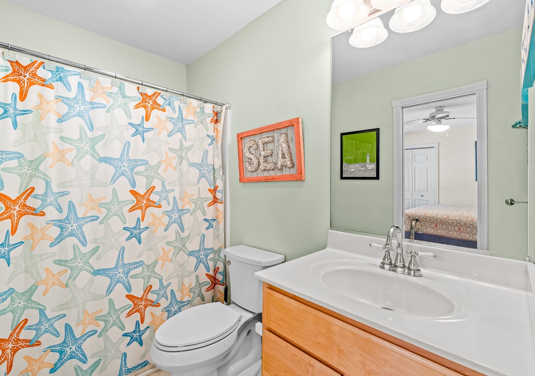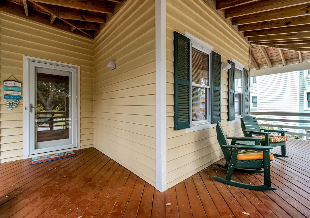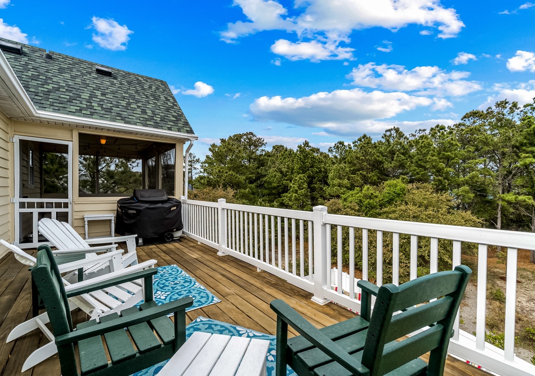 Step inside this tastefully appointed home to find an open-concept living room with a cozy gas fireplace, a modern kitchen with custom stone backsplash and quartz countertops, and a dining area perfect for hosting family gatherings. Relax on the screened porch or spacious sun decks overlooking the private pool area. The top floor also features a primary room en suite with a private deck and dual vanities, offering a serene retreat after a day of beach activities.