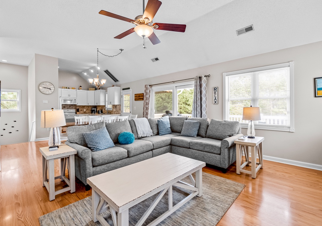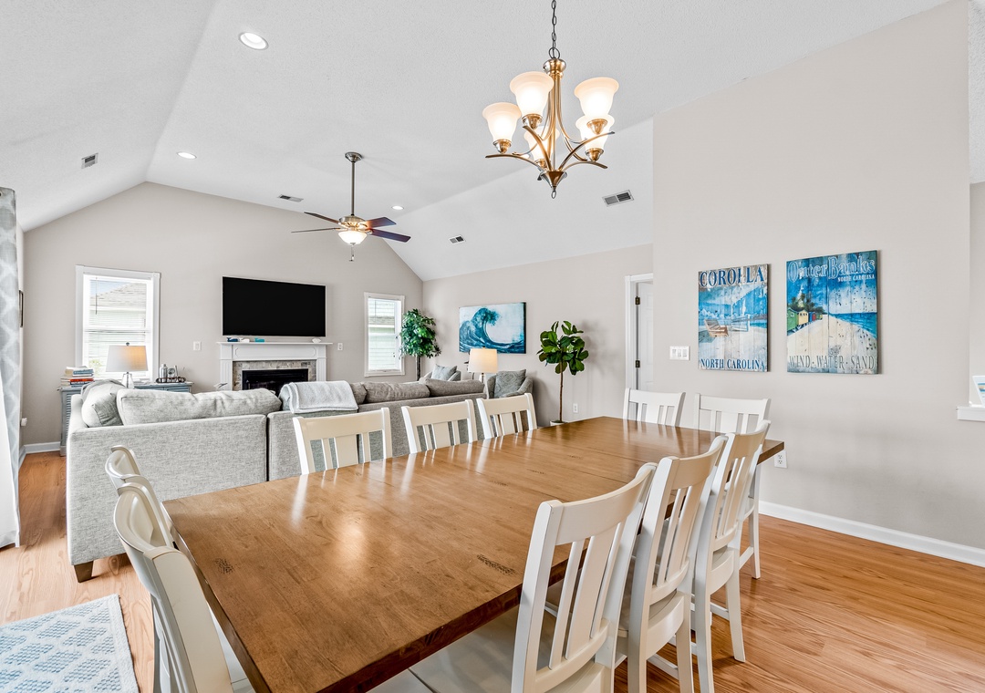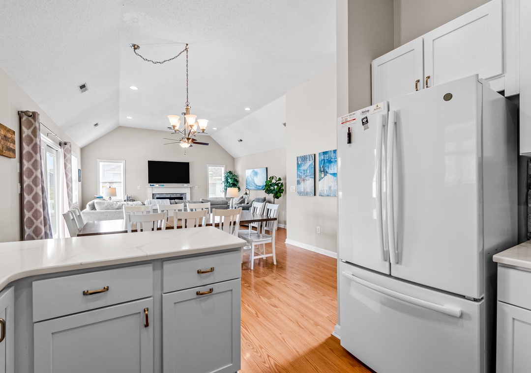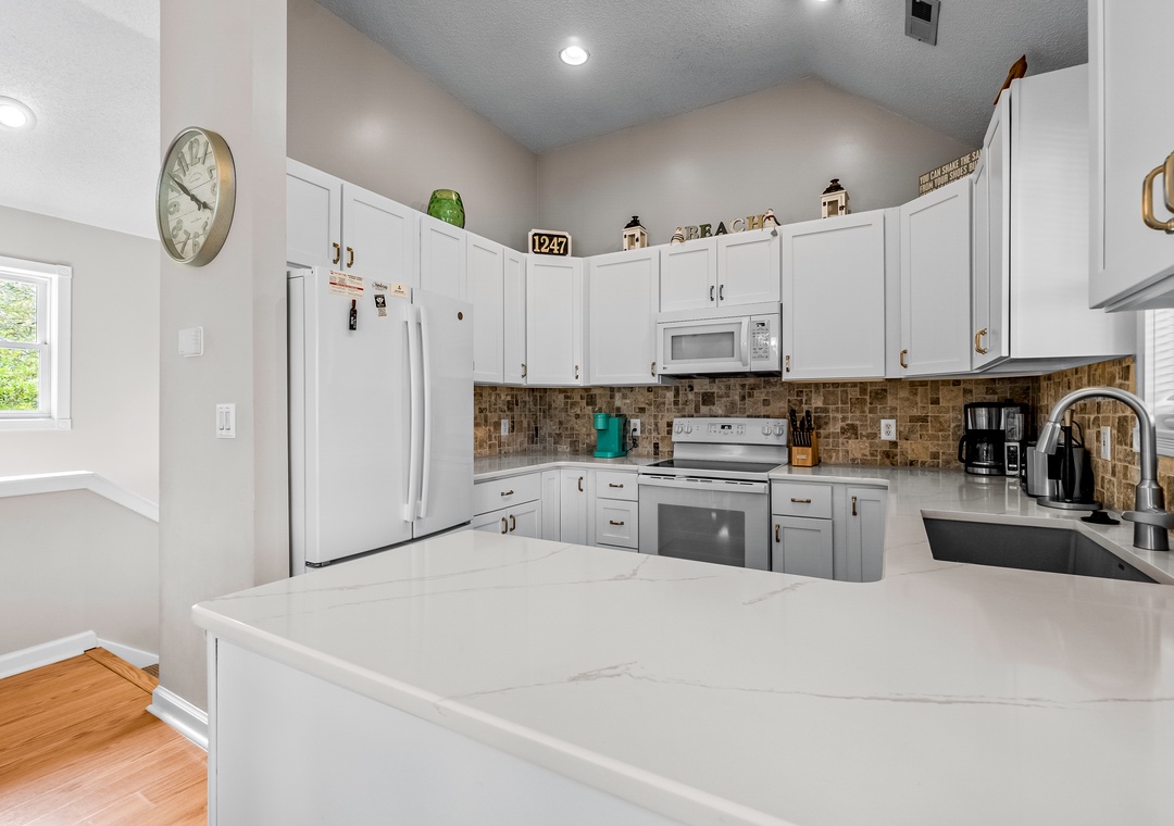 After a day of sun and sand, return to your beach house oasis and relax in the expansive private pool area or soak in the hot tub under the stars. The main living area boasts vaulted ceilings, a cozy gas fireplace, and access to the deck overlooking the pool. The well-equipped kitchen with quartz countertops is perfect for preparing family meals. With three ensuite bedrooms, this home offers privacy and comfort for multiple families or groups.