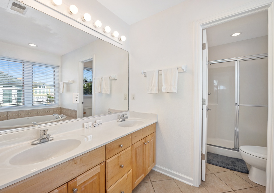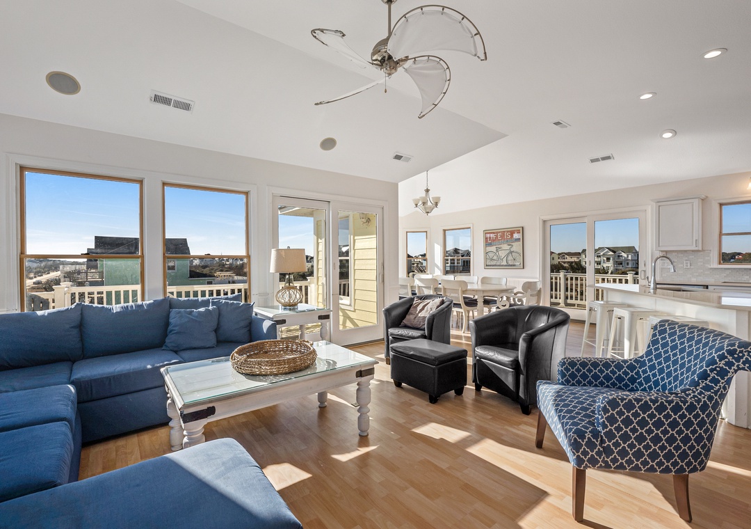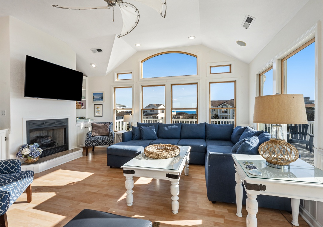 Top Level: The great room has a fireplace, 52' TV/DVD, Blu-Ray and HD cable service w/ surround sound. The kitchen is equipped with 2 dishwashers and breakfast bar. The dining area offers sunset views. There are also 2 main bedrooms, one with a large garden tub. A half bath rounds out this floor.