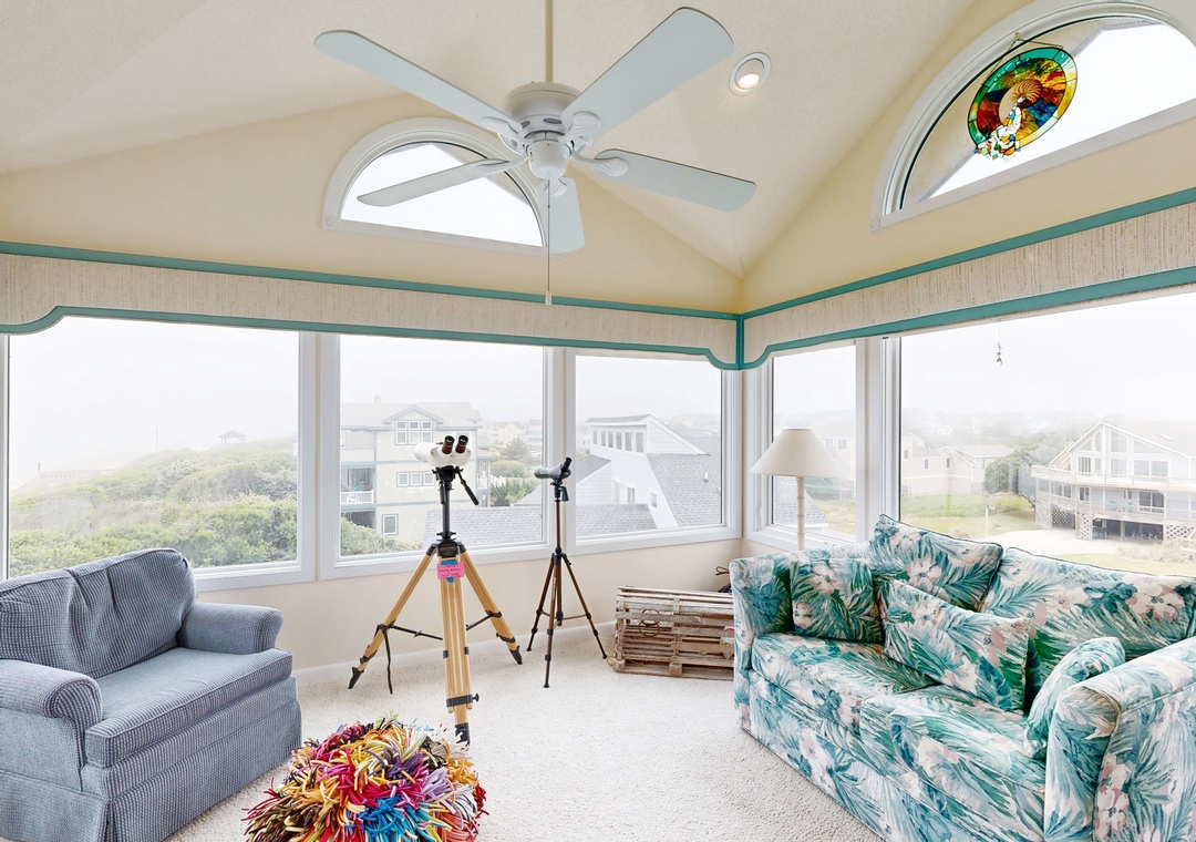 Top Level: A spiral staircase winds its way to a lofted room for ultimate panoramic views! A King main bedroom with soaker tub provides a romantic retreat. The elegantly furnished great room, where you can sit and gaze upon the vistas before you, has entertainment and dining areas. The screened sunroom adjoins the gourmet kitchen with granite countertops and KitchenAid appliances.