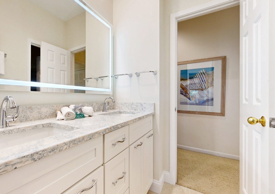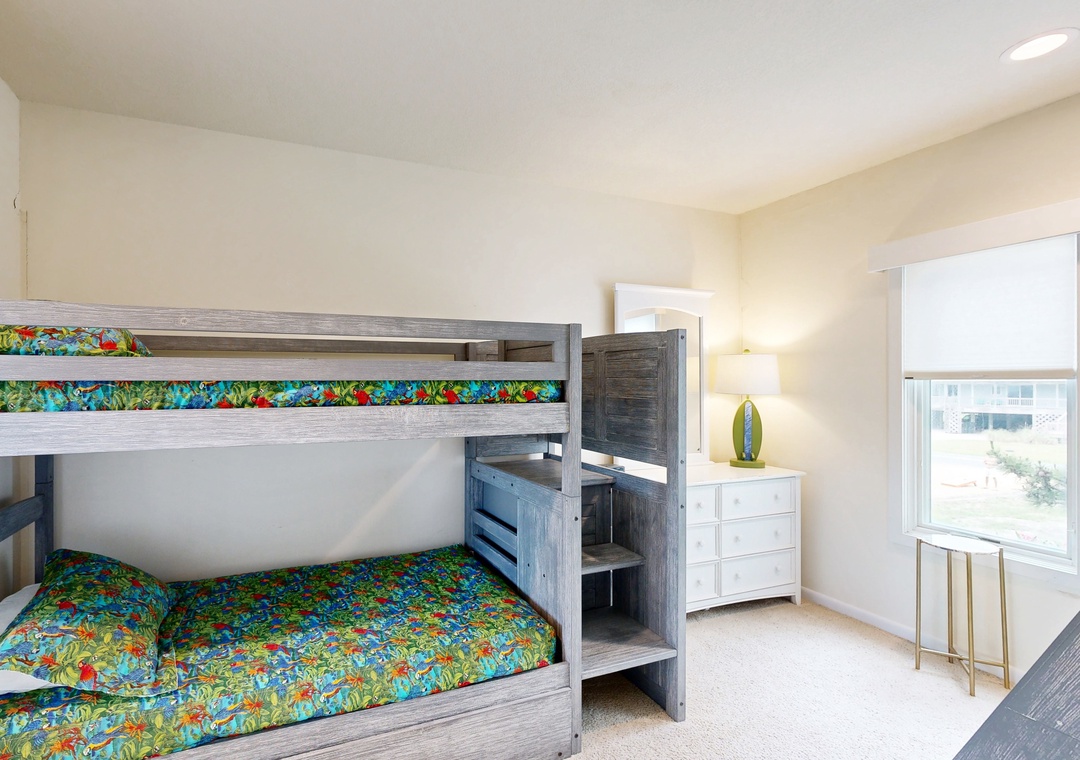 Mid Level: Has a King main bedroom with soaker tubs, a Queen main bedroom with soaker tubs. A room with 2 full beds and Kids room with two bunk beds; twin/full and twin/twin; each with trundle, share a bathroom. A den with sofa provides access to the pool deck.